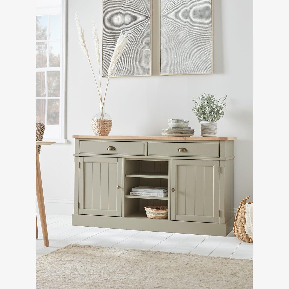 I’m a big fan of the Reims for its straightforward design and muted sage-green finish paired with a light oak top - it sits equally well in modern farmhouse, Scandi-inspired or contemporary coastal rooms. The clean lines and bead-board doors keep the look simple, while the open centre shelf is perfect for showing off baskets or coffee-table books. Styling it is all about balance and function: tuck everyday tableware behind the doors, use the shelf for baskets to corral small bits and pieces, then keep the surface tidy with a low vase of dried grasses or a sculptural lamp at one end. A round mirror or pair of framed prints hung above will add height and complete the look without crowding your scheme.