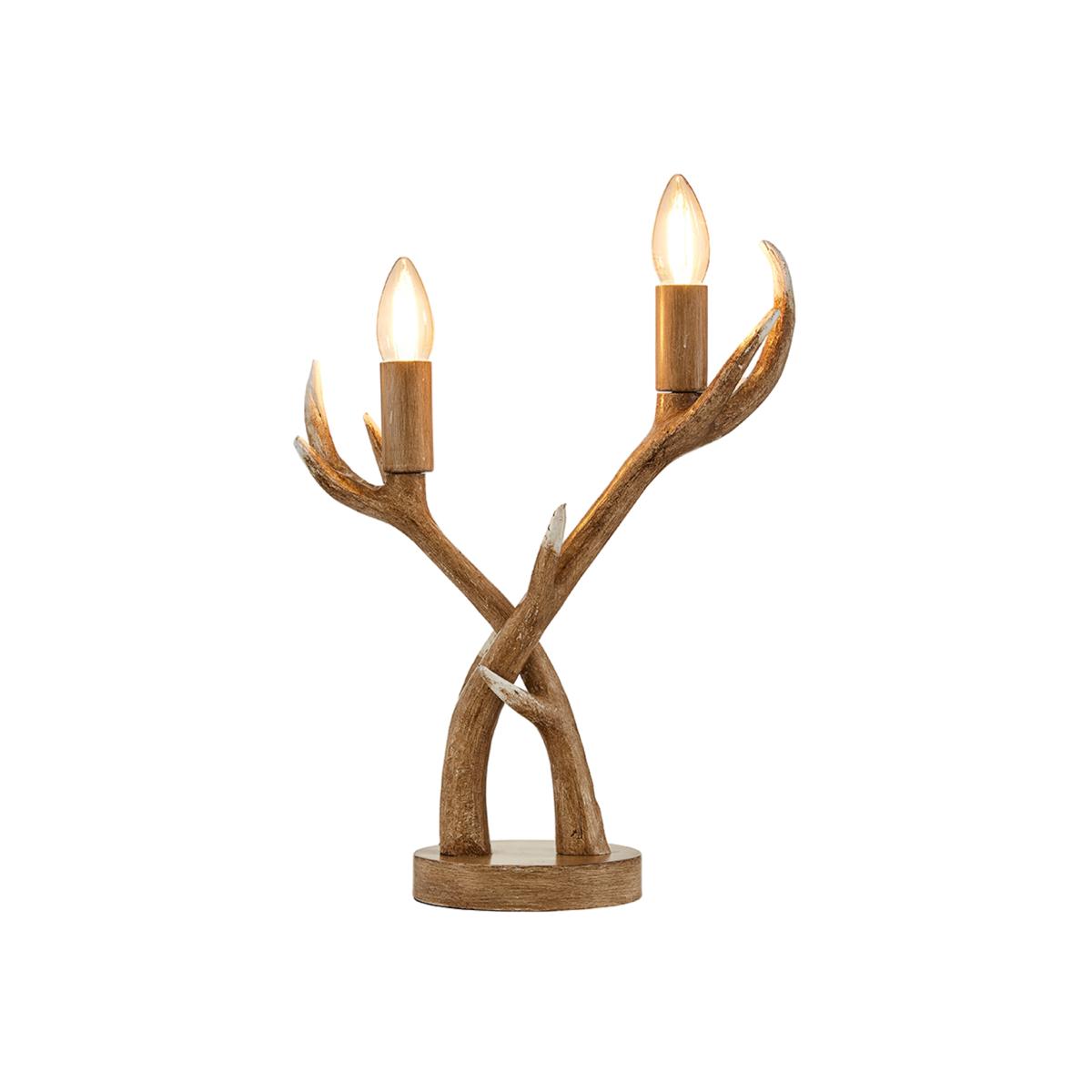 Easily create a log cabin aesthetic in your living room or bedroom with the Rein 2 Light Antler Table Lamp in Natural. The antler design of this twin light fixture brings a homely rustic feel to your modern decor. The exposed bulbs of this animal lamp elegantly fit with the shape of the light.
