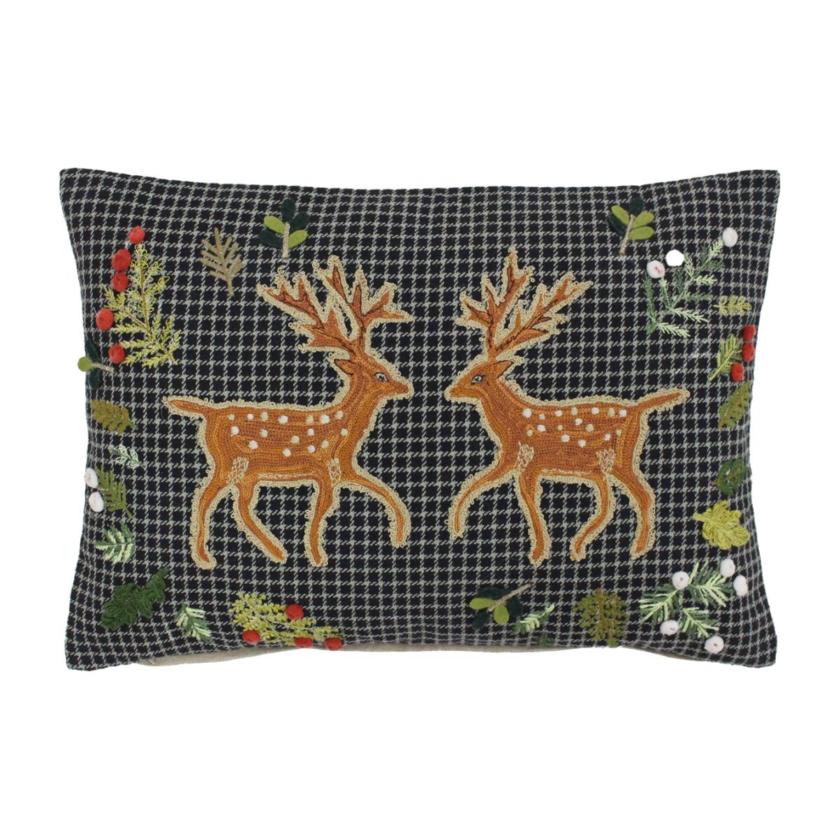 Reindeer Pom Pom Cushion Stunningly traditional, the Reindeer Pom-Pom Cushion makes you feel all warm and cozy inside this festive season. The tartan print is detailed with holly, leaves and reindeers complete with red white and green pom poms for a uniqu Reindeer Pom Pom Cushion Cotton | Barker & Stonehouse