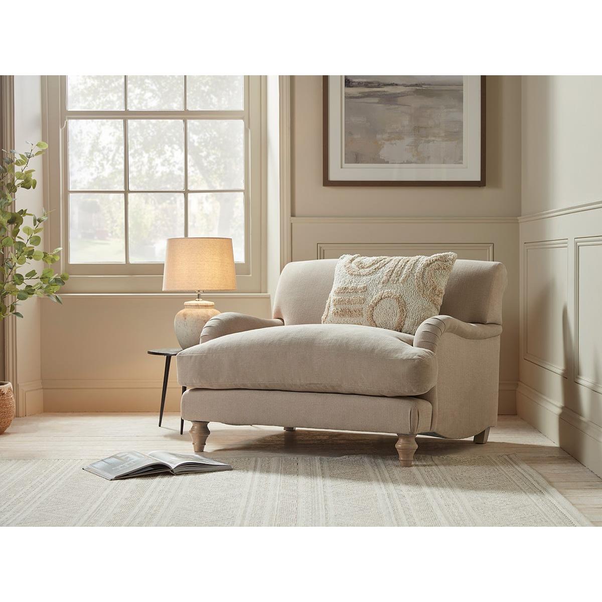 This restful silhouette showcases handcrafted details such as hand folded pleats and polished turned hardwood legs. The Reine Loveseat features all the beauty of the armchair with that bit of extra space to fully luxuriate alone or cuddle up with someone precious. The seat has a deep feather and foam filled base making it a joy to sink into and the legs are in a limewashed oak finish. Your loveseat will be upholstered by hand, especially for you. The range also includes two and three seater sofas, an ottoman and an armchair. Pictured here in our Taupe Cotton Linen our Reine collection can be upholstered in a choice of 34 distinctive shades and six fabrics to suit your style. Read our Upholstery FAQs View our full Upholstery Terms and Conditions