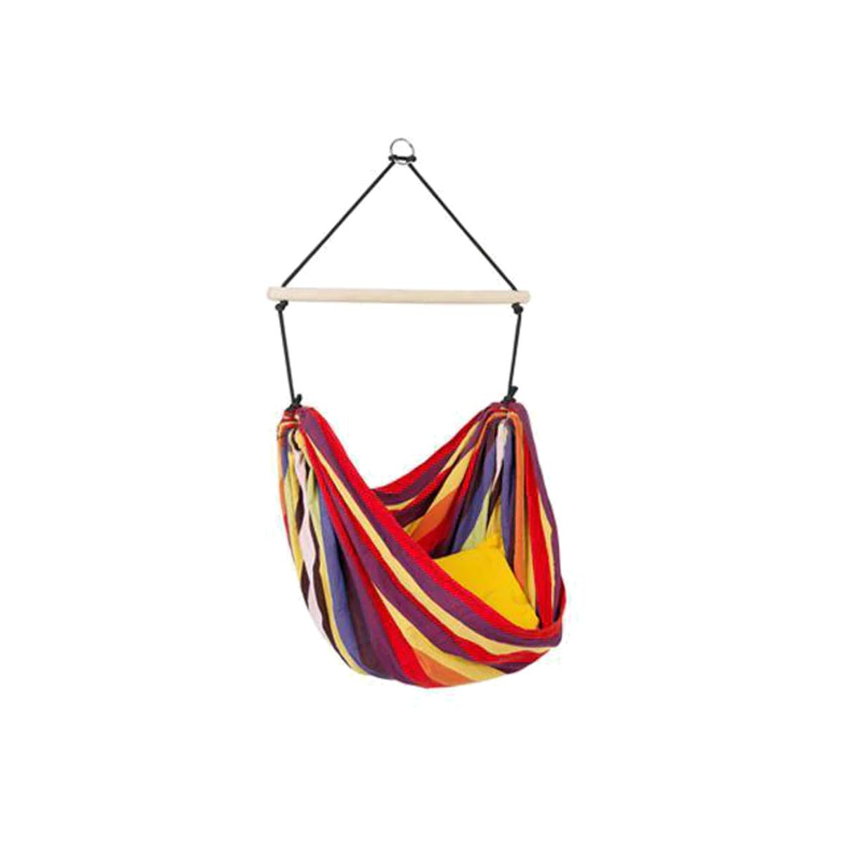 I really like this one because of its vibrant colour palette and relaxed vibe, making it a great statement piece for casual or boho-inspired interiors. It works well in both indoor and covered outdoor spaces like sunrooms or sheltered patios where it can be safely hung. To style it effectively, consider pairing it with neutral furnishings or adding some textured cushions to soften the look. Because the red is quite bold, using it as an accent rather than a focal point helps it blend seamlessly into a relaxed, playful aesthetic. It’s a practical choice for creating a laid-back corner for lounging, reading, or even a cosy nook in a kid’s or family space.
