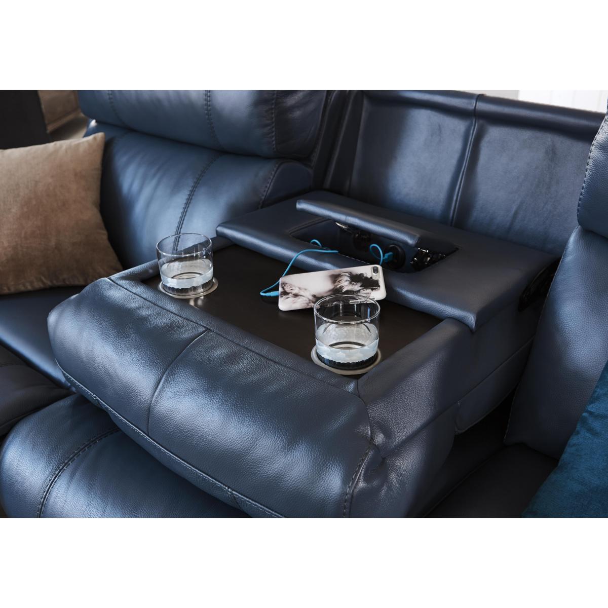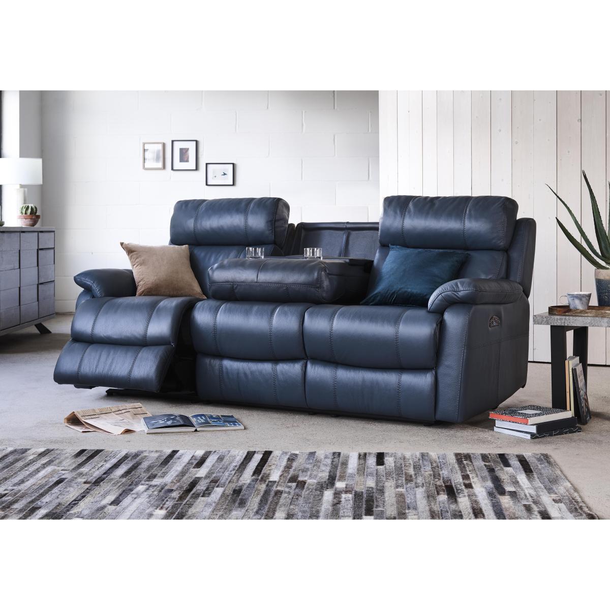 The Komodo range is a masterpiece of modern comfort and style, offering handy extra features to make your life easier. The great-quality 100% leather upholstery gives you a wonderful sit while being superbly durable. Complemented by the amazing comfort of soft yet supportive foam and fibre-filled seat cushions and extra cosy loose fibre-filled back cushions resting on deep, bucket seats. Choose from a static design or upgrade your comfort at the simple touch of a button with the power recliner design, put your feet up and completely unwind. Only available at Furniture Village. Available in a beautiful range of colours, leathers and fabrics. This leather power recliner sofa is ingeniously designed. There’s a clever drop down central section with cup holders, easy-reach storage and USB ports so relaxing is easy. Why you’ll love it. Deep-seated comfort with a drop down central unit. Contemporary good looks in family friendly 100% leather. Relax, your way, with power recliners and power headrests. In a wide choice of beautiful colours. Drop down unit includes hidden storage, USB ports and cup holders. Sprung, deep bucket seats with foam and fibre seat cushions. Luxury fibre-filled back and arm cushions. Exclusive to Furniture Village at a great value price. What you need to know. Medium comfort level. Sprung, no-sag seat suspension. Webbed back suspension. Foam with a fibre top seat interior. Luxury fibre-filled back cushions and arm cushions. Strong hardwood frame, hidden glide feet. Natural leather has unique marks and characteristics with variance in colour and texture, and softens with use. Smoothing seat cushions prevents puddling. Please read our. Upholstery care guide. For more advice. Allow time for recliners to settle. Minor gaps necessary for ease of motion vary by floor type. Part of the World of Leather Relax Station Komodo range of sofas and chairs, in leather and fabric.