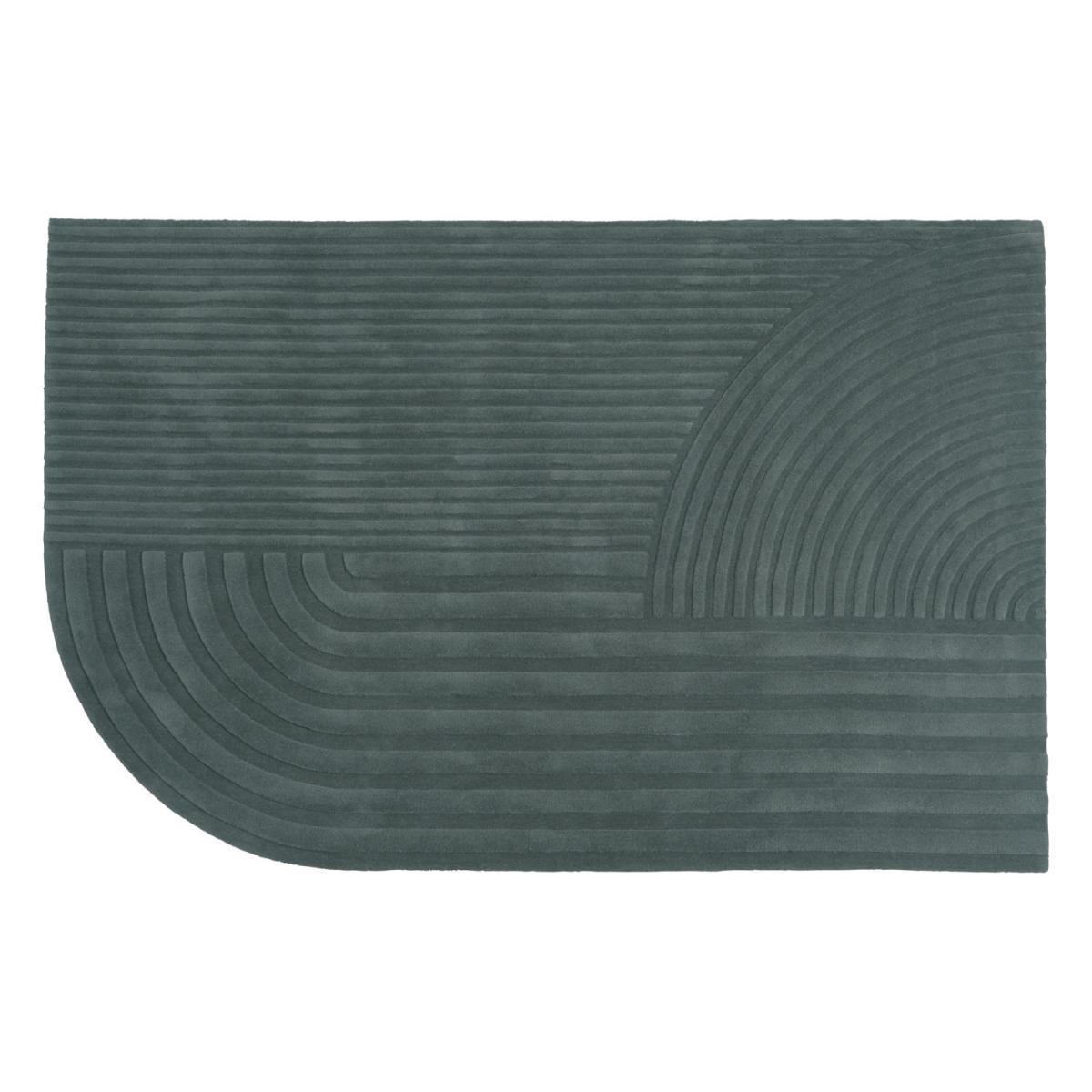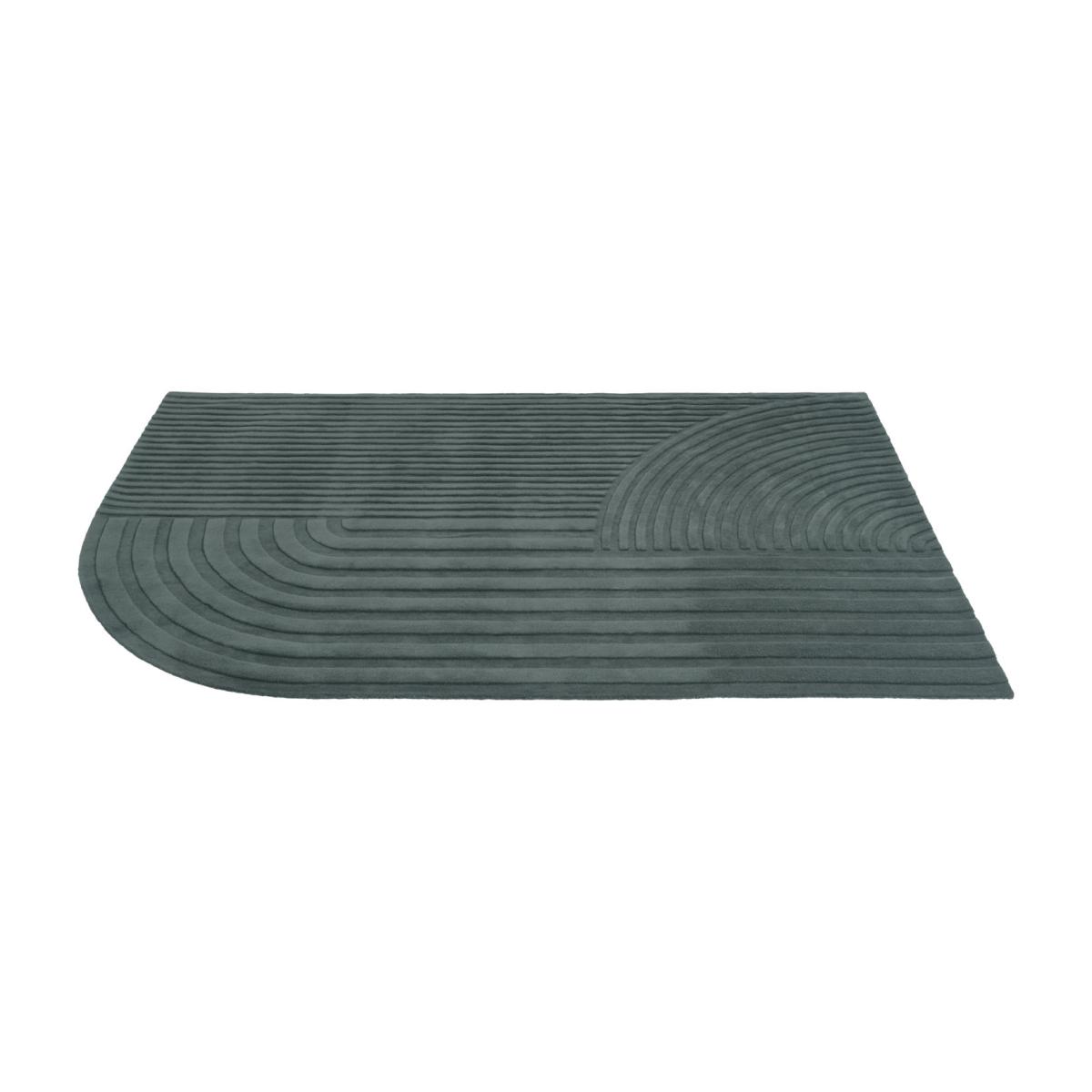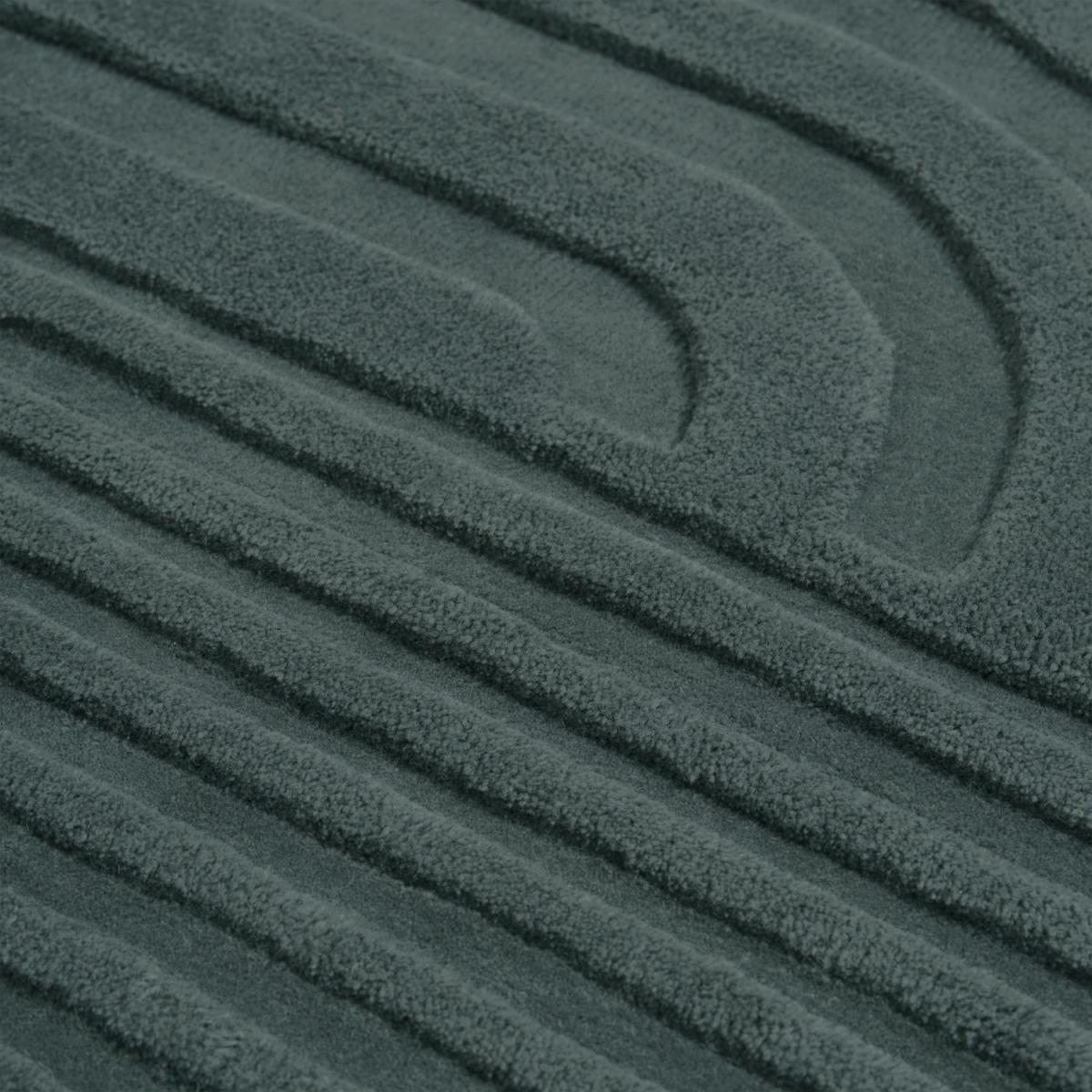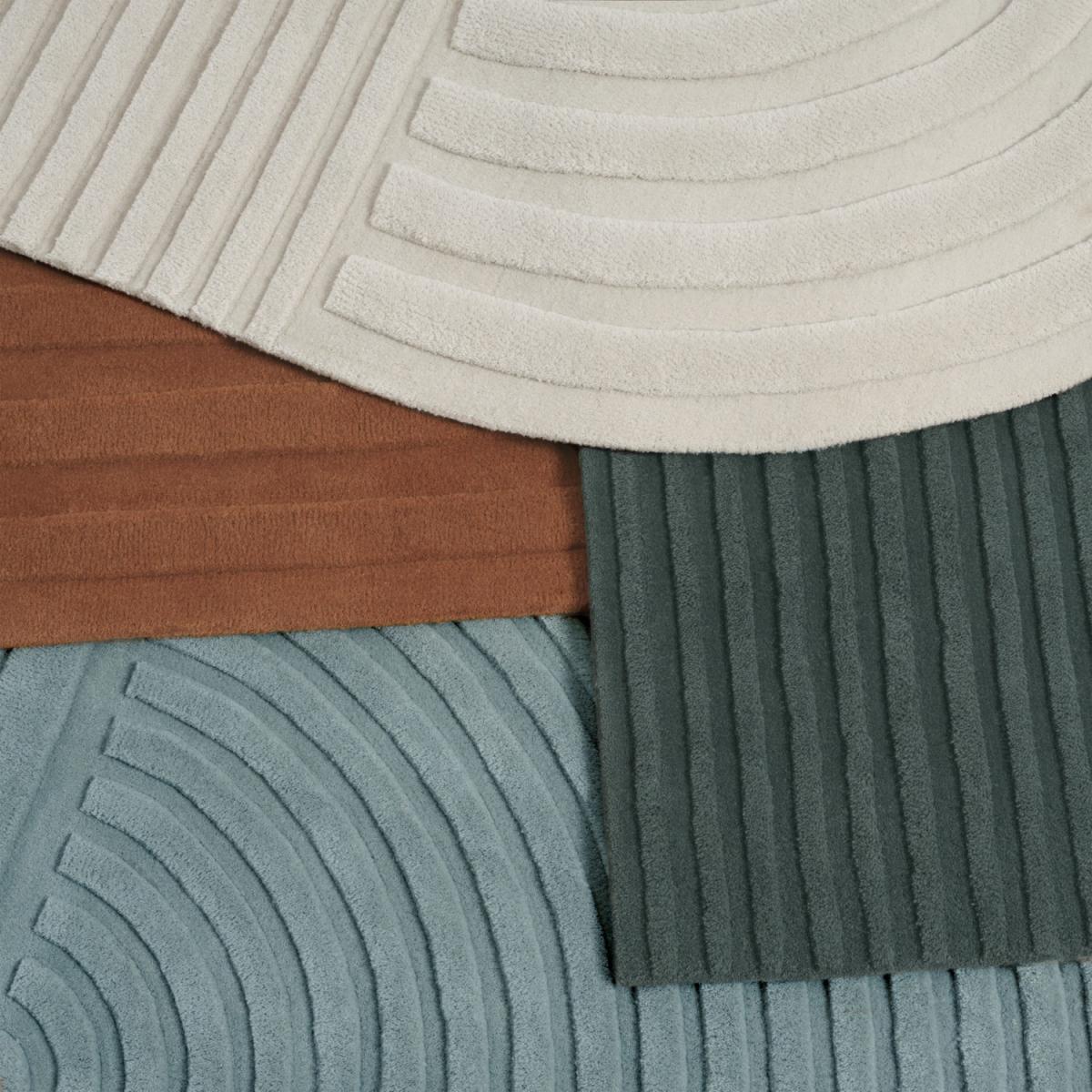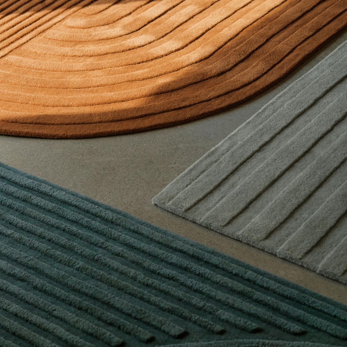 Designed by STUDIOPEPE, Relevo is a soft rug with a distinct, sculptural quality. Its captivating graphic pattern is produced by cutting the tufted wool on different levels, creating an eye-catching play of shadows that gives the impression that the piece is two-tone rather than monochrome. The unique, rounded corner of the rug gives it a singular character, creating a dynamic expression in any environment. The Relevo rug is made with 100% New Zealand wood that is hand-tufted in India. STUDIOPEPE on the design of Relevo: "The Relevo rug first came to be through the medium of pencil on paper. We love creating a whole story around a project, this time with a rug that could be a sculpture in its own right, practically changing the perception of a piece. The elongated lines of Relevo are inspired by land art and its criss-crossed, hypnotic lines in the ground. The geometric pattern of the rug is created with different levels, resulting in a subtle play on light and shadows.