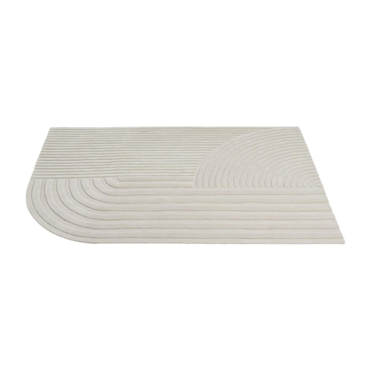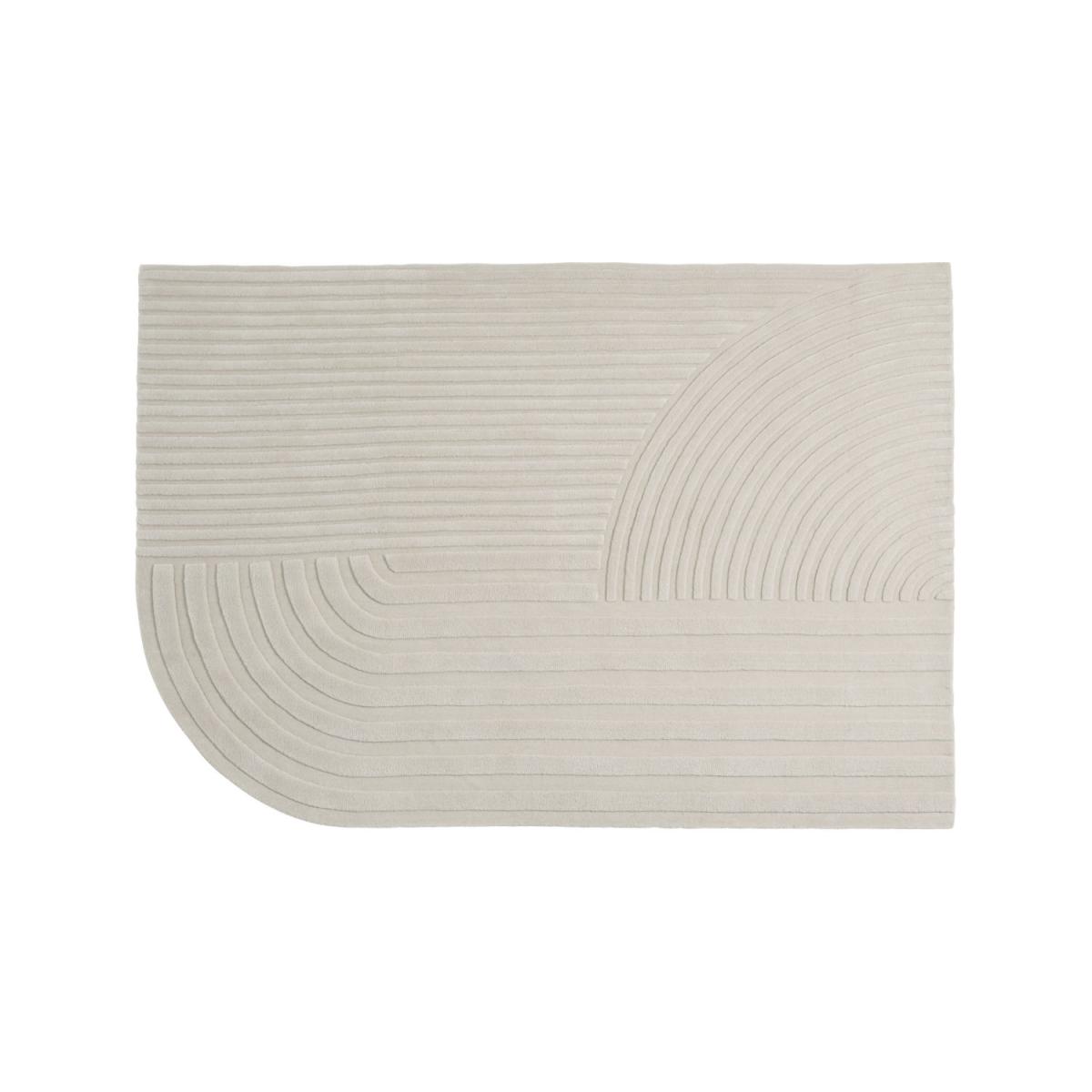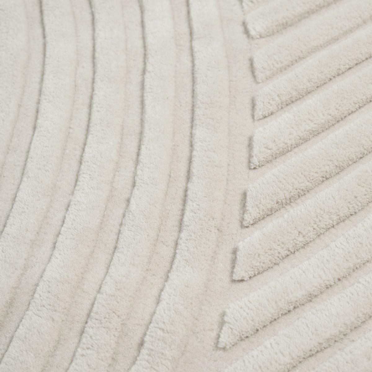 Designed by STUDIOPEPE, Relevo is a soft rug with a distinct, sculptural quality. Its captivating graphic pattern is produced by cutting the tufted wool on different levels, creating an eye-catching play of shadows that gives the impression that the piece is two-tone rather than monochrome. The unique, rounded corner of the rug gives it a singular character, creating a dynamic expression in any environment. The Relevo rug is made with 100% New Zealand wood that is hand-tufted in India. STUDIOPEPE on the design of Relevo: "The Relevo rug first came to be through the medium of pencil on paper. We love creating a whole story around a project, this time with a rug that could be a sculpture in its own right, practically changing the perception of a piece. The elongated lines of Relevo are inspired by land art and its criss-crossed, hypnotic lines in the ground. The geometric pattern of the rug is created with different levels, resulting in a subtle play on light and shadows.