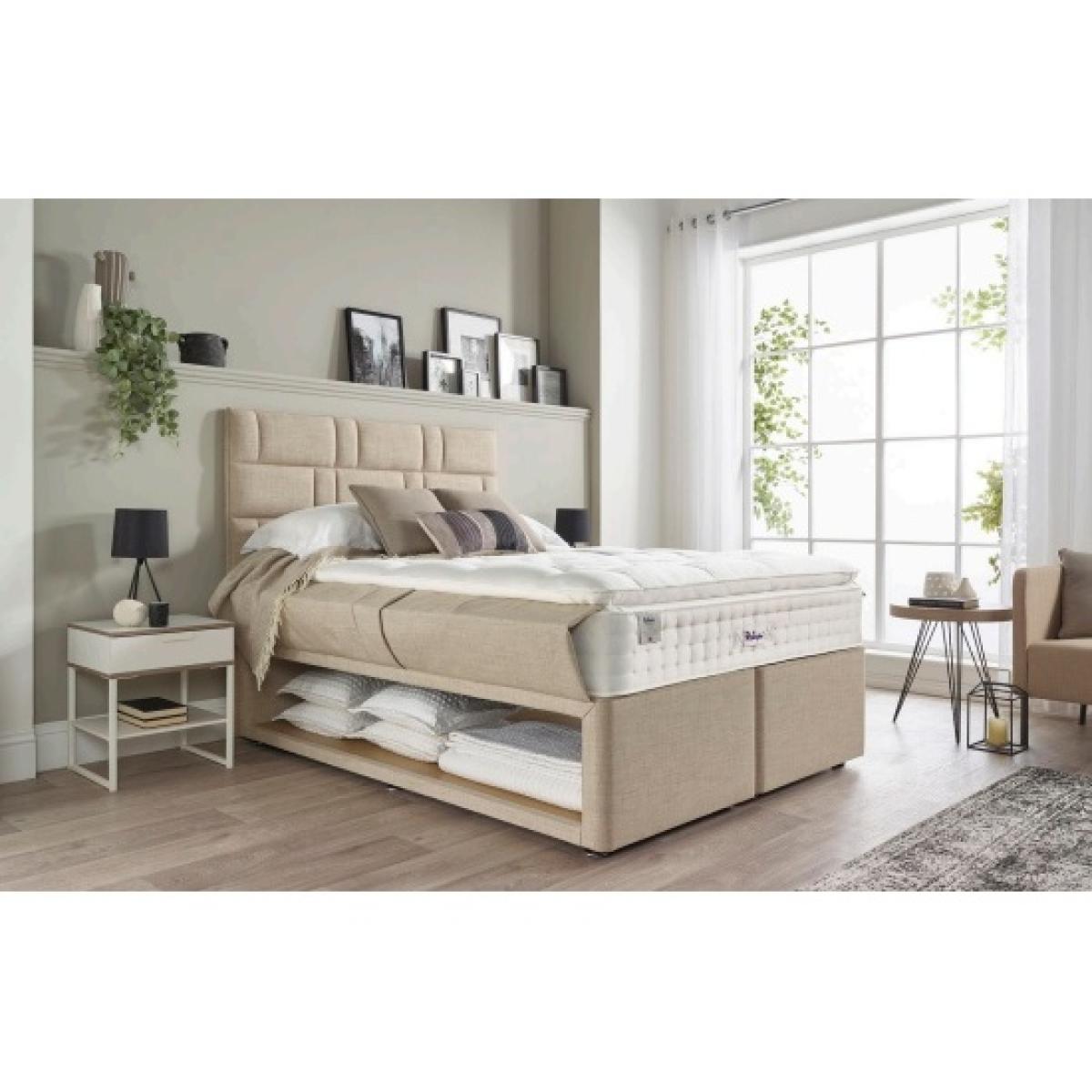 Note - The headboard pictured is not included but is available to purchase separately. You can browse our range of Relyon headboards here. The base or frame pictured in the image may not be representative of the specific base you require. Please contact us for more information, if needed.. This handcrafted no turn mattress combines sensuous softness of natural wool with a satisfyingly supportive feel. Warm in winter and cool in summer, it will enhance the quality of your sleep. Features:. *2200* Pocket Springs - Pocket springs move independently and so provide the best postural support. The individual pocket springs follow and support your body shape and weight. 2200* Double layer of pocket springs. One layer of full length pocket springs and second layer of mimi pocket springs for further posture support. *King size. *Spring Tension - Available in one tension only. *Deep Soft Layers - A dust free filling providing softness and resilience. *Wool - Wool is a natural insulator providing coolness in the summer and warmth in the winter. *No Turn - No need to turn the mattress, although regular rotation will extend its life. *2 Rows of Side Stitching - Provides a more robust mattress border than a standard mattress. *Traditionally hand tufted with wool tufts - This traditional skill ensures all loose fillings are secured to provide the perfect finish to your mattress. *8 Year Guarantee - For your peace of mind, Relyon offer a 8 year guarantee on all mattresses purchased with a divan base. *Firm Edge Sprung Divan Base - The open coil spring unit sits inside a wooden sided frame. The spring unit soften the comfort of a mattress and the firm edges help prevent 39;roll off39; on the side of the bed. *Open Coil Springs - This spring unit is strong, durable and offers superb resilience and support for your mattress. *Firm Edge - The open coil spring unit sits within a surrounding timber frame help to prevent roll off when you are on the edge of the bed. *Timber Frame - High quality timber frame. *Sturdy Construction - All key joints are fully glued and screwed providing exceptional strength and rigidity. *Silver Castors - Castors are secured onto a hardwood corner block for maximum strength. *Divan Feel - The firm edge sprung divan provides a medium feel. *Medium feel Dimensions:. *Mattress border height - 29.5cm includes a 2cm maximum tolerance for loft fillings in a no turn mattress. *Single - 90 x 190cm Spring Count - 1238 Weight - 24kg *Double - 135 x 190cm Spring Count - 1870 Weight - 36kg *King - 150 x 200cm Spring Count - 2200 Weight - 42kg *Super King - 180 x 200cm Spring Count - 2677 Weight - 51kg *Divan Height - 41.5cm All screens vary in colour reproduction and whilst every effort has been made to display the colour as accurately as possible it is for guidance only...