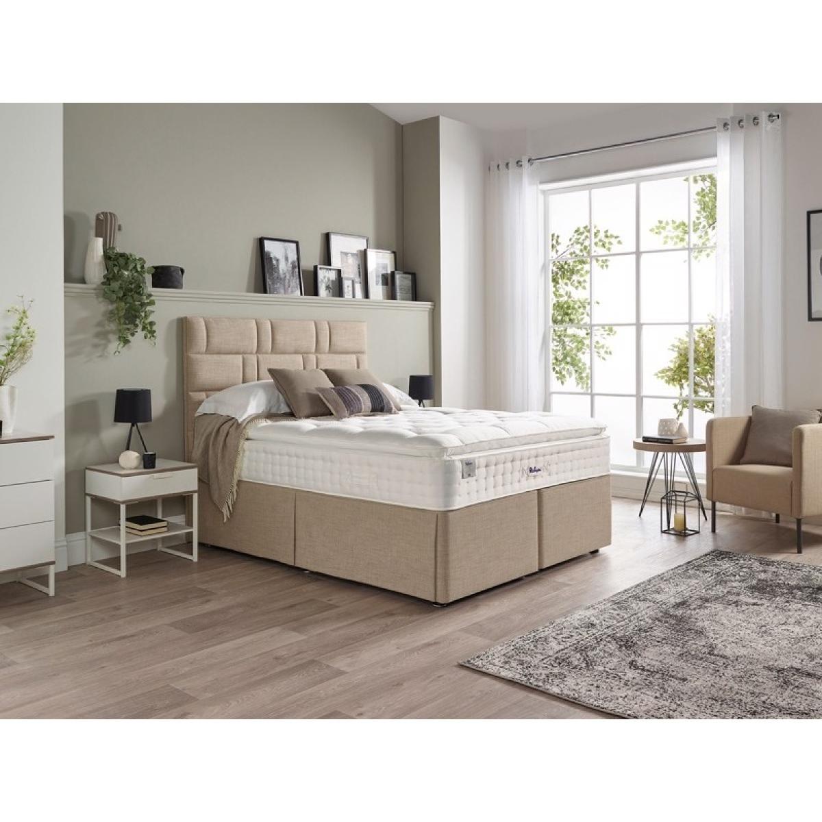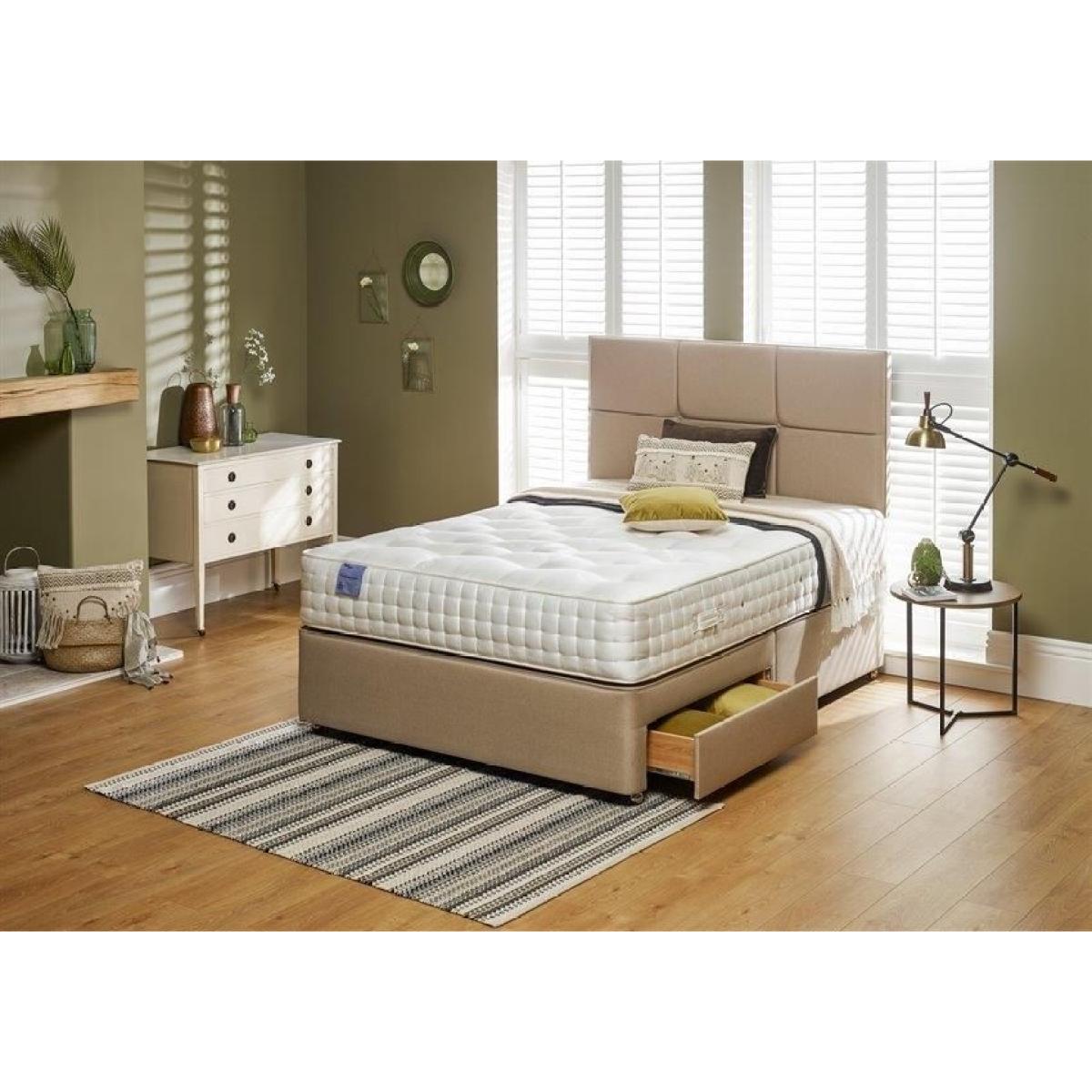 Please note, the headboard pictured is not included but is available to purchase separately. You can browse our range of Relyon headboardshere. The base or frame pictured in the image may not be representative of the specific base you require. Please contact us for more information, if needed.. This handcrafted pocketed mattress offers enhanced resilience and support a rejuvenating night39;s sleep. The pocket springs adapt perfectly to the shape of your body, while its refined blend of natural fillings; wool and pashmina provide luxurious comfort and softness. 2400* Pocket Springs - Pocket springs move independently and so provide the best postural support. The individual pocket springs follow and support your body shape and weight. *King size. Firm Edge Support - Firmer springs along the sides add strength to the edge of the mattress to allow you to use the whole surface of the mattress as a sleeping area. Available in one tension only. Deep Soft Layers - A dust free filling providing softness and resilience. Wool and Pashmina Layer - Wool and pashmina are blended into a comfortable and durable insulation layer. No Turn - No need to turn the mattress, although regular rotation will extend its life. 3 Rows of Side Stitching - Provides a more robust mattress border than a standard mattress. Traditionally Hand Tufted with Wool Tuffs - This traditional skill ensures all loose fillings are secured to provide the perfect finish to your mattress. 8 Year Guarantee - For your peace of mind, Relyon offer a 8 year guarantee on all mattresses purchased with a divan base. Mattress Dimensions:. * Single 90 x 190cm Spring Count 1358. *Small Double 120 x 190cm Spring Count 1793 *Double 135 x 190cm Spring Count 2036 * King 150 x 200cm Spring Count 2400 *Super King 180 x 200cm Spring Count 2877. *Divan Base Height: 41.5cm Firm Edge Sprung Divan Base -The open coil spring unit sits inside a wooden sided frame. The spring unit soften the comfort of a mattress and the firm edges help prevent 39;roll off39; on the side of the bed.. Open Coil Springs -This spring unit is strong, durable and offers superb resilience and support for your mattress. Firm Edge -The open coil spring unit sits within a surrounding timber frame help to prevent 39;roll off39; when you are on the edge of the bed. Timber Frame -High quality timber frame. Sturdy Construction -All key joints are fully glued and screwed providing exceptional strength and rigidity. Silver Castors -Castors are secured onto a hardwood corner block for maximum strength. Divan Feel -The firm edge sprung divan provides a medium feel. All screens vary in colour reproduction and whilst every effort has been made to display the colour as accurately as possible it is for guidance only..
