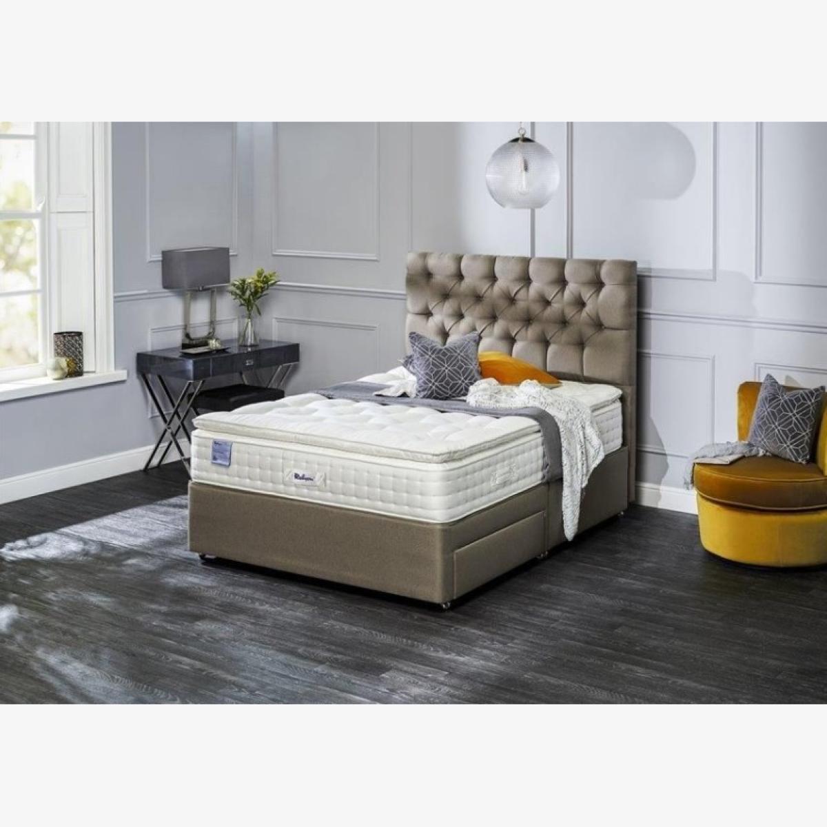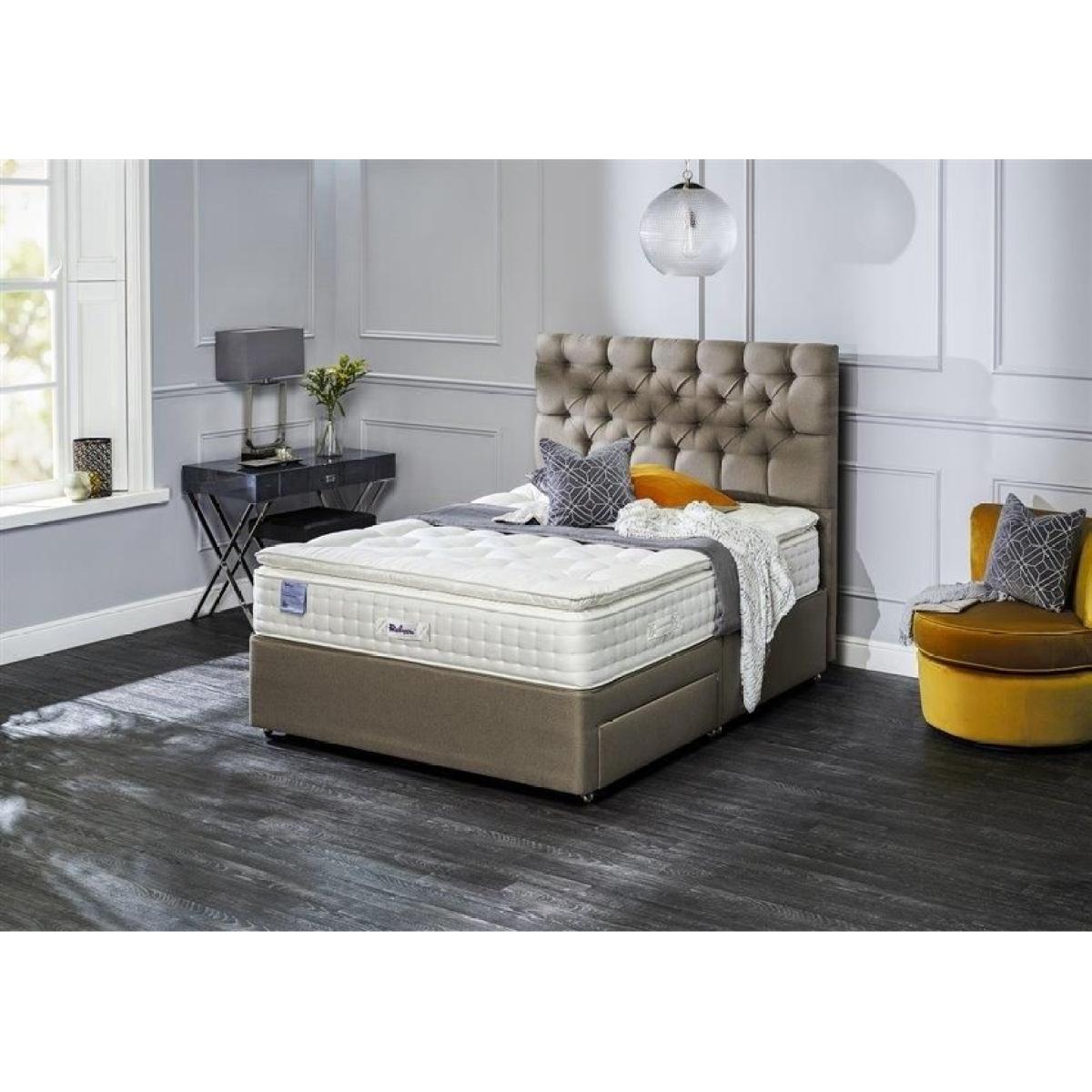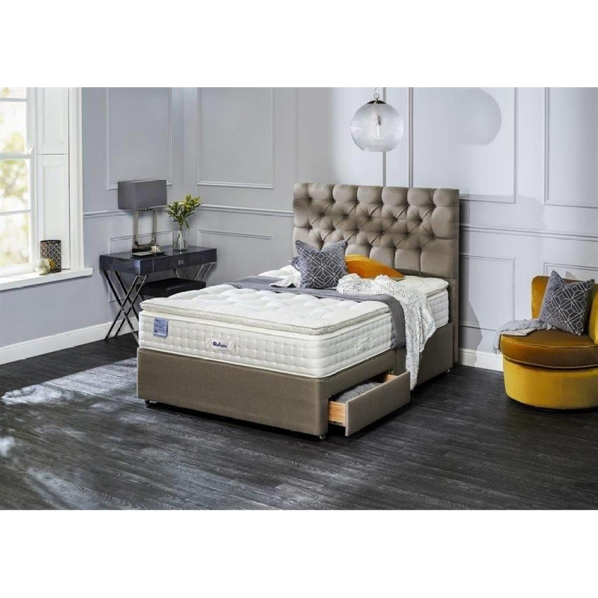 Note - The headboard pictured is not included but is available to purchase separately. You can browse our range of Relyon headboardshere. The base or frame pictured in the image may not be representative of the specific base you require. Please contact us for more information, if needed.. The Ullswater Natural Silk 2900 has a combined spring count of 2900 from the pocket springs in the heart of the mattress and mini pocket springs in the pillowtop that help distribute weight evenly, minimising pressure on the body and resulting in an undisturbed night39;s sleep. Cashmere and silk elevate the levels of plush comfort in this truly sumptuous mattress. 2900* Pocket Springs - Pocket springs move independently and so provide the best postural support. The individual pocket springs follow and support your body shape and weight. *King size. Firm Edge Support - Firmer springs along the sides add strength to the edge of the mattress to allow you to use the whole surface of the mattress as a sleeping area. Available in one tension only. Pillowtop Layer Featuring Mini Pocket Springs - A soft comfort layer above the supportive mattress featuring mini pocket springs for further postural support. Deep Soft Layers - A dust free filling providing softness and resilience. Cashmere and Silk - Cashmere hair and the finest silk fibres are blended into a durable insulation layer. This layer also provides a supportive feel. Cotton Blend Layer - A combination of cotton and luxurious soft white fibre is formed into a deep layer for guaranteed quality and softness. Cotton Rebound Layer - This cotton layer is designed with responsive rebound properties that complement the pocket springs to help provide the most comfortable feel. No Turn - No need to turn the mattress, although regular rotation will extend its life. 3 Rows of Side Stitching - Provides a more robust mattress border than a standard mattress. Traditionally Hand Tufted with Wool Tufts - This traditional skill ensures all loose fillings are secured to provide the perfect finish to your mattress. 8 Year Guarantee - For your peace of mind, Relyon offer a 8 year guarantee on all mattresses purchased with a divan base. Mattress Dimensions:. * Single 90 x 190cm Spring Count 1611 *Small Double 120 x 190cm Spring Count 2237 * Double 135 x 190cm Spring Count 2500 * King 150 x 200cm Spring Count 2900 * Super King 180 x 200cm Spring Count 3507. Firm Edge Sprung Divan Base -The open coil spring unit sits inside a wooden sided frame. The spring unit soften the comfort of a mattress and the firm edges help prevent 39;roll off39; on the side of the bed.. Open Coil Springs -This spring unit is strong, durable and offers superb resilience and support for your mattress.. Firm Edge -The open coil spring unit sits within a surrounding timber frame help to prevent roll off when you are on the edge of the bed.. Timber Frame -High quality timber frame.. Sturdy Construction -All key joints are fully glued and screwed providing exceptional strength and rigidity.. Silver Castors -Castors are secured onto a hardwood corner block for maximum strength.. Divan Feel -The firm edge sprung divan provides a medium feel.. All screens vary in colour reproduction and whilst every effort has been made to display the colour as accurately as possible it is for guidance only..