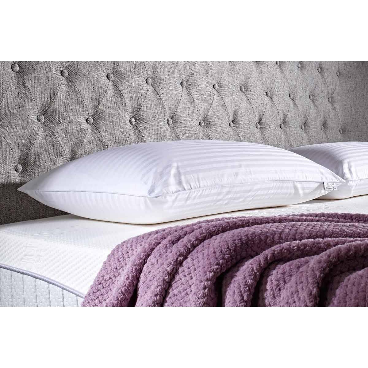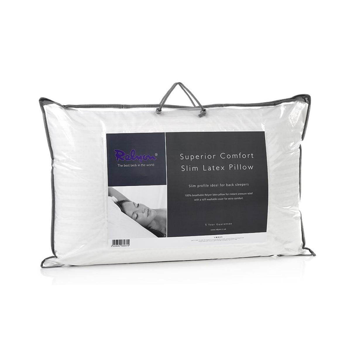 With 100% pure Relyon latex for instant pressure relief and a soft washable cotton cover for additional comfort, this pillow has been specially developed for front and back sleepers. Comfort - Through its elasticity the latex offers 'progressive comfort' meaning the pillow will cushion and adjust to your movements throughout the night yet its shape immediately recovers once pressure is removed so that your sleep is never disrupted. Support - The latex pillows offer a responsive surface which mould instantly to your head and neck to provide optimal support. The Superior Comfort Deep Latex pillow is ideal for those who sleep on their side as this deep pillow provides instant pressure relief and ensures you enjoy the perfect sleeping posture. Alternatively, the Superior Comfort Slim Latex pillow is ideal for those who sleep on their back or front. Allergen Free - With anti-allergenic, anti-bacterial and anti-microbial properties, the unique manufacturing process of latex ensures all the characteristics of natural latex are embodied within these latex pillows. This helps to provide a sleeping surface which is inherently dust-mite resistant; beneficial for allergy sufferers and for those who suffer from hay fever, asthma and respiratory problems. Breathable - The unique open cell structure of the latex means it is naturally breathable and does not have the associated heat issues of many foams. The microscopic air bubbles promote constant air circulation and natural movement throughout the night helps to ventilate the pillow, keeping your head and neck at a comfortable temperature. Durable - Although latex pillows can be expensive, its durable properties mean they are resilient and long lasting to provide an excellent long-term investment in your sleep. After all you do spend approximately one third of your life sleeping! Since latex is extremely dense it can hold its shape for many years without ever having to be 'plumped' offering you long lasting and easily maintainable comfort. Dimensions - W 68cm x H 40cm x D 13cm 5 Year Guarantee 100% Pure Relyon Latex Removable and Washable 100% Cotton Cover Sold Individually