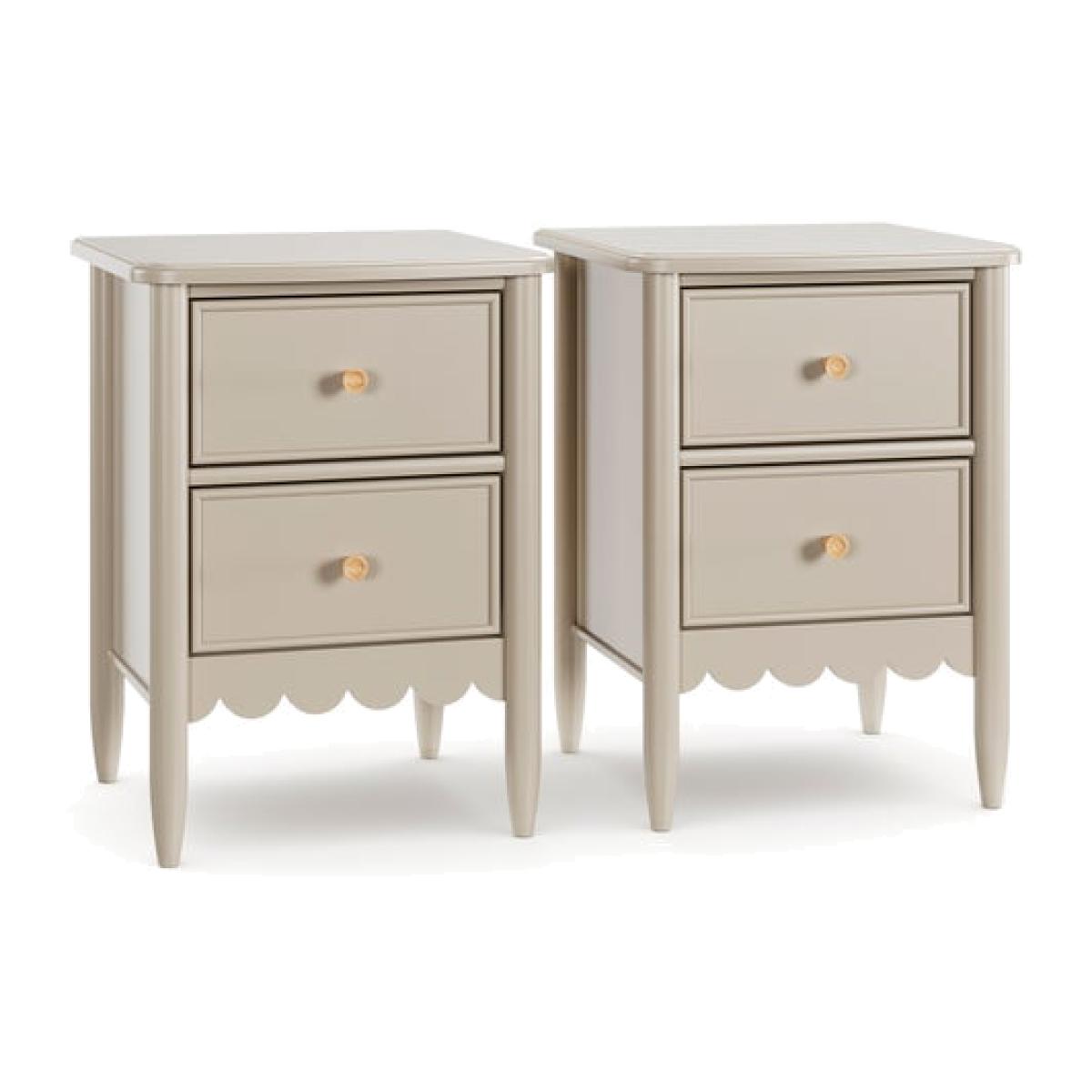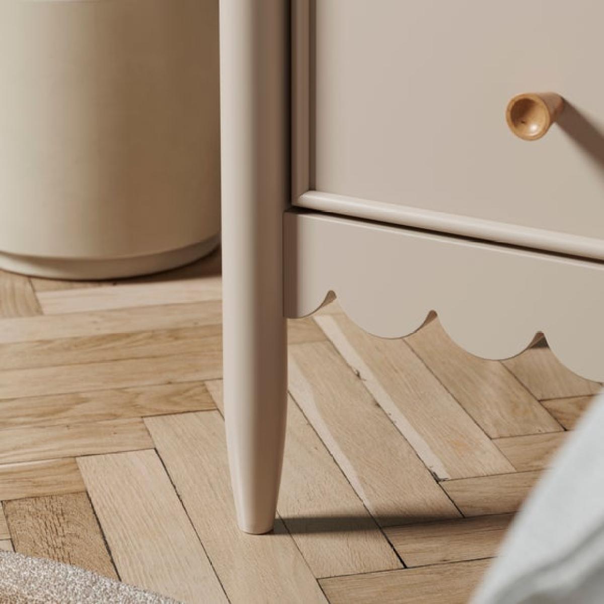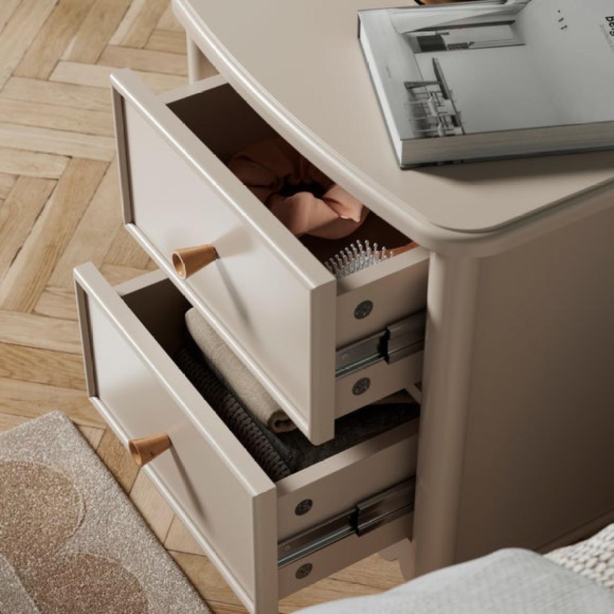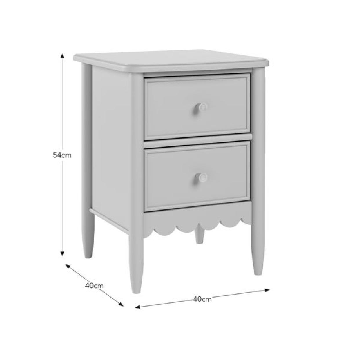 * Classic bedside table * 2 drawers for storage * Beautiful wood-style finish * Wooden handles * Full assembly required Adorned with a gorgeous natural wooden finish, this bedside table creates a sense of natural beauty in your bedroom. The soothing grey hue brings a refreshing touch to your bedroom, creating a striking atmosphere that brings a feel of relaxation and peaceful sleep. The rounded edges of this bedside table create a gentle and inviting silhouette, offering a touch of softness to your bedside area. Its scallop apron adds a graceful and sophisticated element, infusing your space with a hint of whimsy. The drawers provide ample storage space for your bedtime essentials, keeping them conveniently within reach yet neatly hidden away. To complete your dream bedroom ensemble, we offer a matching collection of bedroom furniture within the same design range. From spacious wardrobes to elegant dressing tables, you can effortlessly create a cohesive and harmonious look throughout your space.