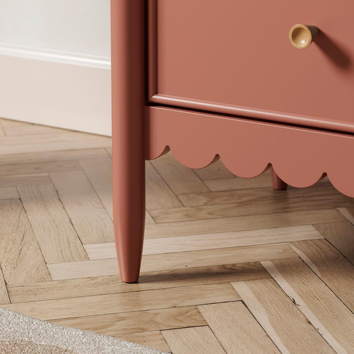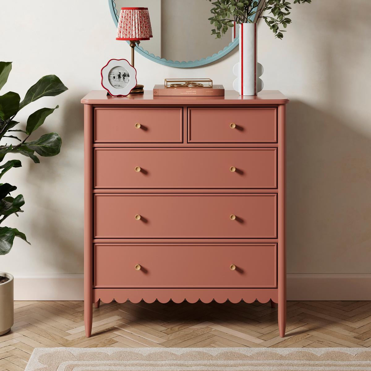 Dunelm Exclusive - Designed and Developed by Dunelm* 5 drawers for storage* Beautiful painted finish* Wooden handles* Full assembly required Organise your essentials with ease, from clothing and linens to accessories and personal items, keeping your space tidy and clutter-free. Equipped with five soft-close drawers, this chest offers ample storage for your belongings. The soft-close mechanism ensures quiet and effortless operation, preventing any jarring noises or accidental slams. With its rounded edges and scallop apron, this chest of drawers adds a graceful flair to any room. The gentle curves create a sense of harmony and balance, while the soft grey colour brings a contemporary touch to your space, creating a serene and calming experience. The generously sized table top provides an excellent display area for showcasing your favourite ornaments, cherished photographs, or a bouquet of vibrant flowers. The sturdy construction guarantees long-lasting use, making it a reliable companion for years to come.