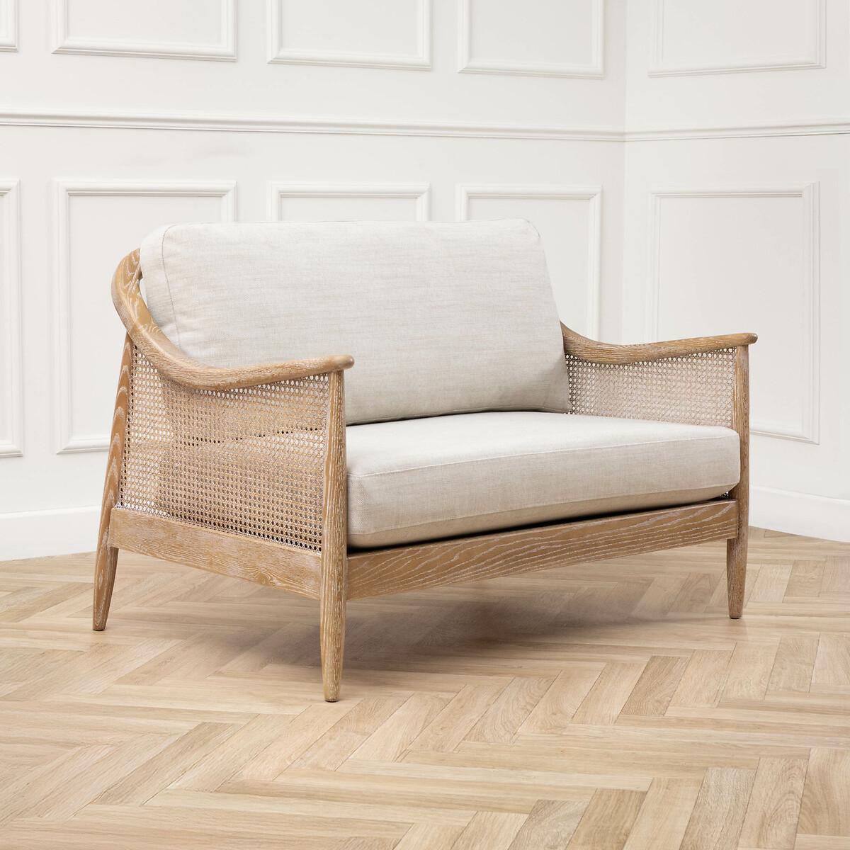 The Remi Rattan Accent Sofa combines timeless elegance with modern design, making it the perfect statement piece for any sophisticated home. Crafted from durable rattan wood, its relaxed yet refined silhouette complements both plain and intricate printed fabrics flawlessly. It features plush, plain cushions for maximum comfort without compromising its sleek aesthetic. Ideal for seekers who value artistry and quality, the Remi Rattan Accent Sofa offers a seamless blend of practicality and style, bringing a touch of laid-back sophistication to any living or dining room. Product Details • Linen look upholstery • Foam core and fibre wrap cushions • Medium comfort level - the perfect balance of softness and support • Solid hardwood frame • Solid wood legs • Removable Seat Cushion Covers • Delivered fully assembled • Care advice - wipe clean with a soft cloth. Product Composition - Outer Cover: 100% Polyester | Filling: 100% PU Foam, 100% Polyester Fibre. Product Dimensions - 55 cm x 102 cm x 84 cm, Weight 25.4 kg Seat height - 43 cm Back height 84 cm Seat width - 99 cm Seat depth - 50 cm Arm height - 62.5 cm Clearance to floor - 18 cm Package Dimensions - 118 cm x 84 cm x 83 cm, Weight 31.1 kg. This product will be dispatched by one of our trusted suppliers. You’ll be contacted by their selected courier about your delivery.