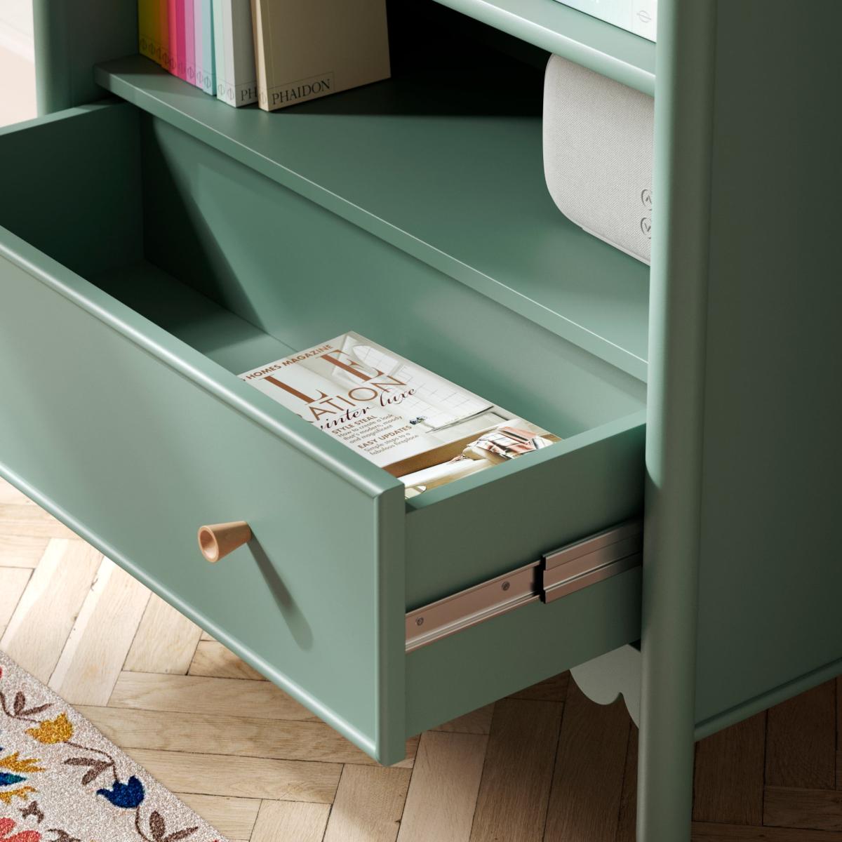 I’m a fan of the Remi low for its clean lines and gentle scallop detail - it brings a touch of character without overwhelming a space. Its muted green finish works just as well in a Scandi-inspired living room as it does in a more eclectic or coastal setting. To style it, mix a selection of books stacked both vertically and horizontally, slot in a couple of woven baskets on the lower shelf for concealed storage, then top with a small plant or ceramic vase to add height and texture. This approach keeps the look balanced and practical.