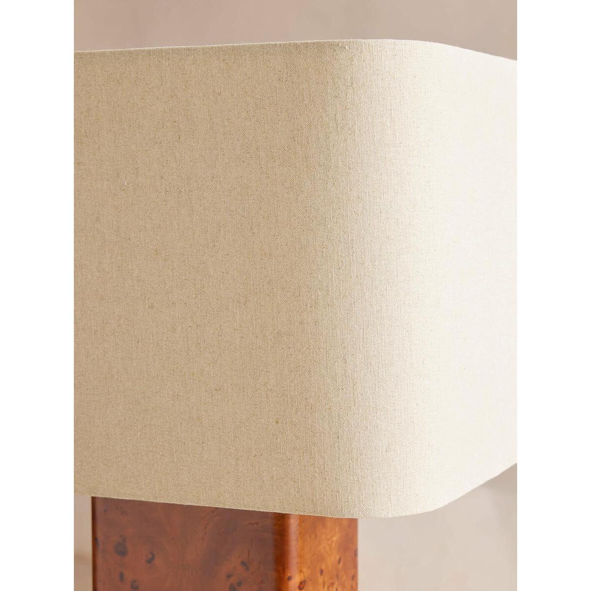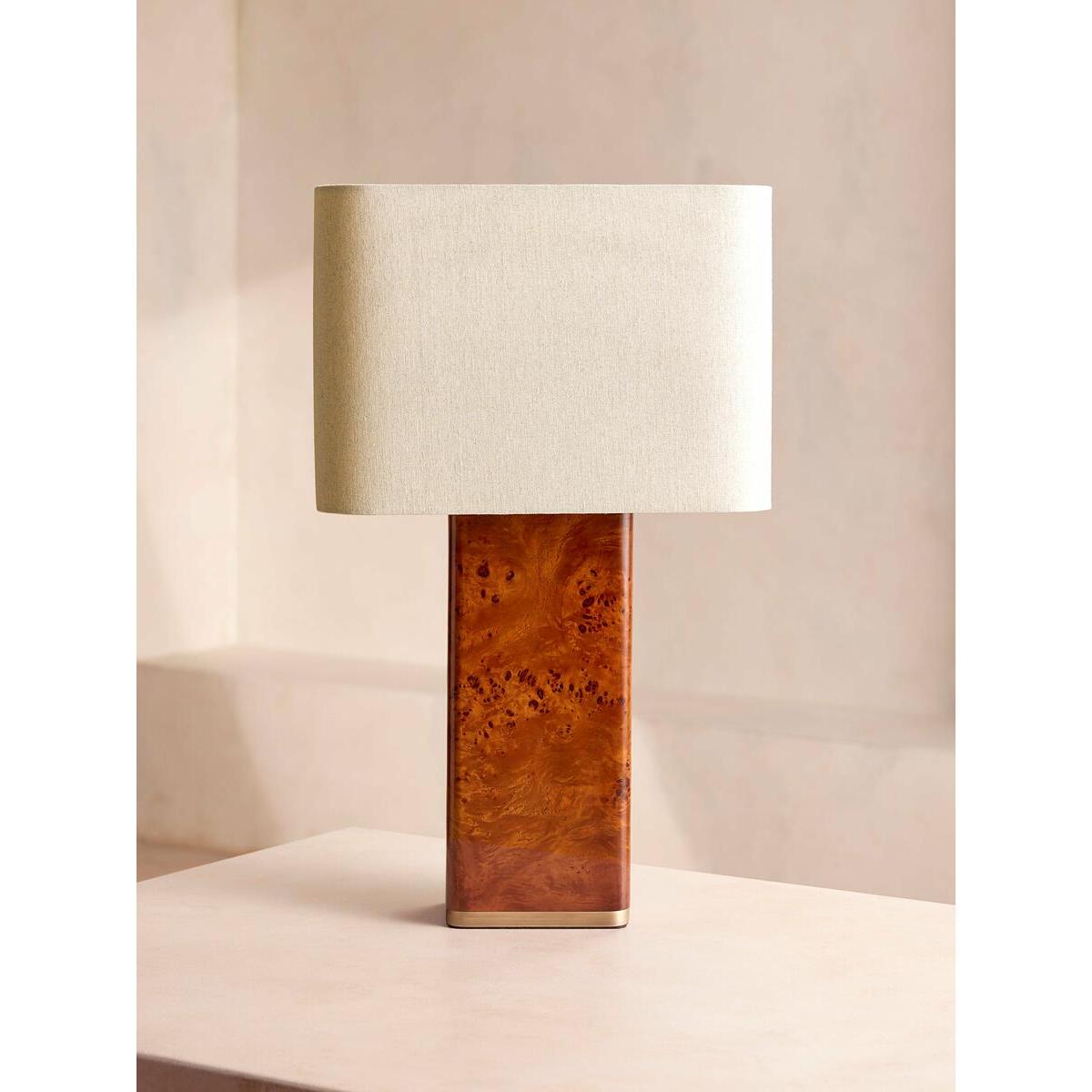 The Remi table lamp transforms your living space through warm, wood finishes. Designed with a rectangular base in dark oak mappa burl, this decorative veneer contrasts a lighter brown wood with a darker, bark-like pattern of tight clusters to add depth and interest to your interiors. Complemented with a natural linen shade, each lamp is one of a kind due to the variation in the wood. All of our portable lamps are fitted with dimmer switches, allowing you to tailor the light level to your mood. Rectangle base Dark oak mappa burl body Antique brass details Natural linen rectangular shade Each lamp is unique due to the variation in the wood Inspired by 180 House