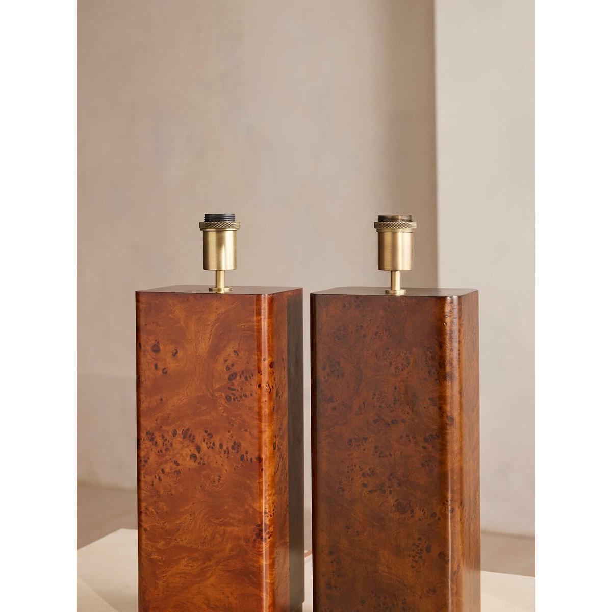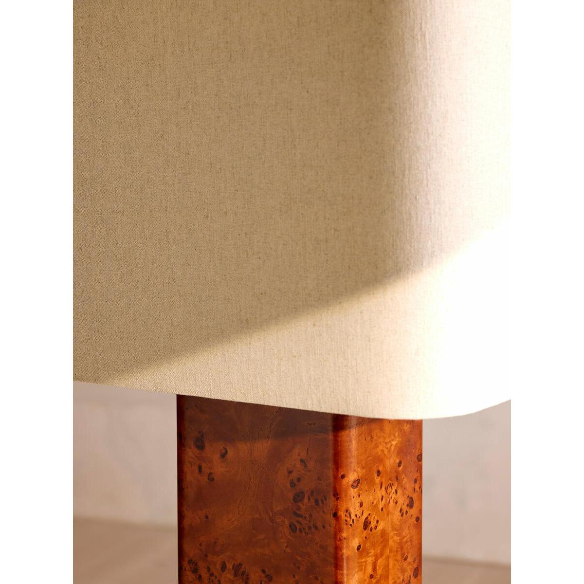 I love this lamp for its modern yet tactile appeal, especially with its bold Mappa Burl finish that adds warmth and texture to any space. It works particularly well in contemporary or minimalist interiors, where its sculptural quality can be a statement piece. Practical styling tips include placing it on a sideboard or console to add ambiance, or using it as a bedside lamp to create a cosy atmosphere. Pair it with neutral tones for a sleek look, or layer it with other warm materials to enhance its rich character. Its straightforward shape and rich finish make it versatile enough to complement both chic urban schemes and more traditional, crafted spaces.