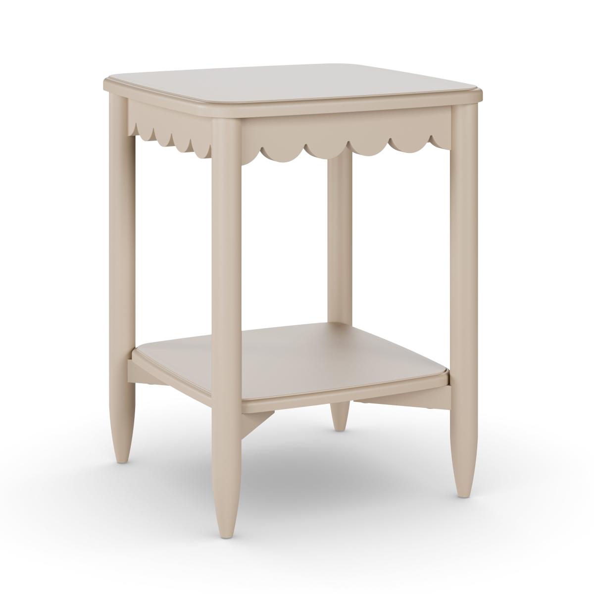 * Scallop detail * Fresh painted finish * 1 shelf for storage * Matching furniture available This delightful side table boasts a distinctive rounded edge and a scallop apron, showcasing exquisite craftsmanship and attention to detail. The solid wood legs provide sturdy support while enhancing the table's overall aesthetic appeal. With a thoughtfully designed open shelf, this side table offers both style and convenience, allowing you to display decorative items or keep everyday essentials within easy reach.