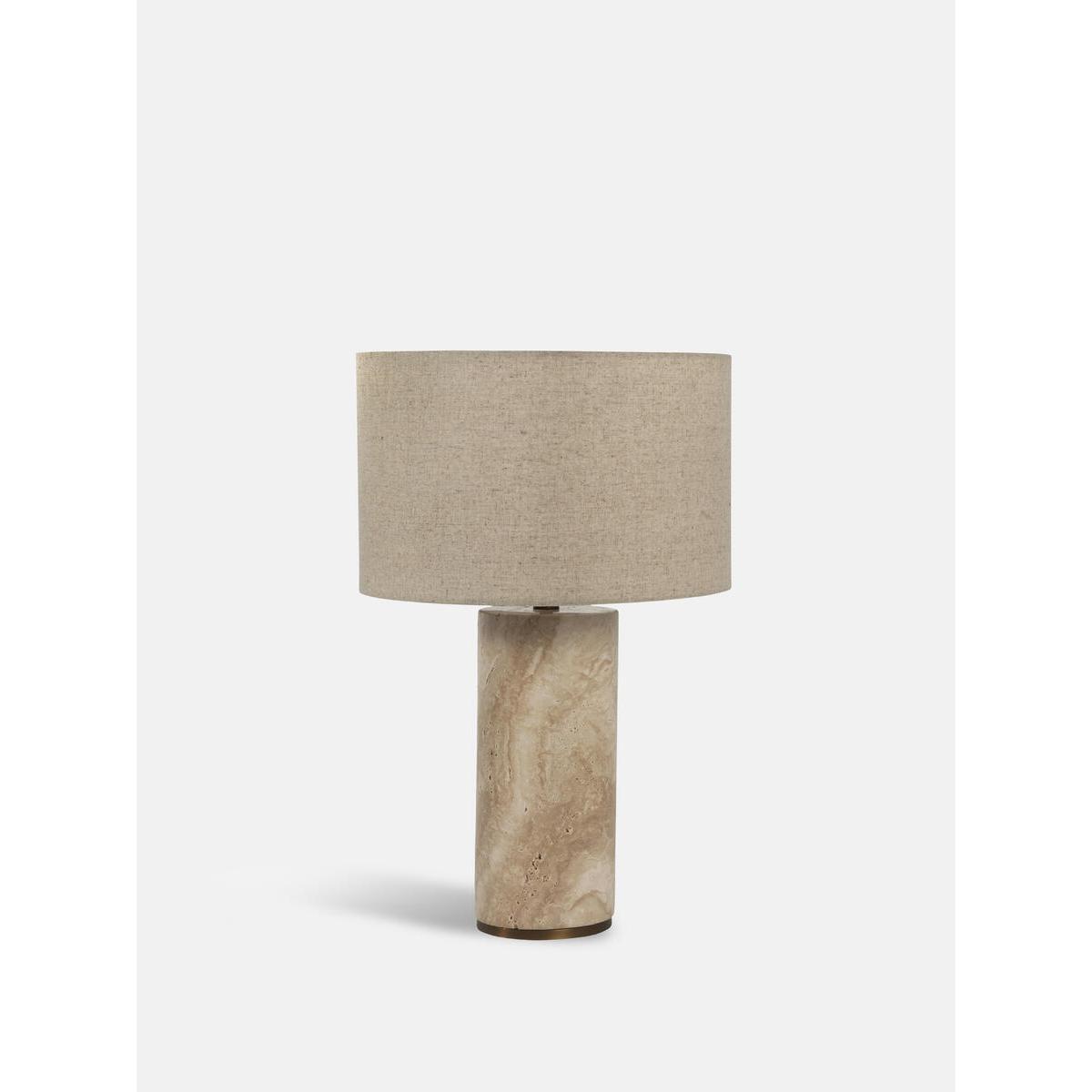 Crafted from solid travertine, which has natural colourvariations and inclusions, this lamp is entirely one of a kind. Inspired by the interiors at 180 House on the Strand, it's finishedwith subtle brass detailing and comes with a natural linenshade. Table lamp with cylindrical travertine base. Brass detailing. Natural linen shade included. 1 / E27 / TYPE A / 60W MAXIMUM. Inspired by 180 House.