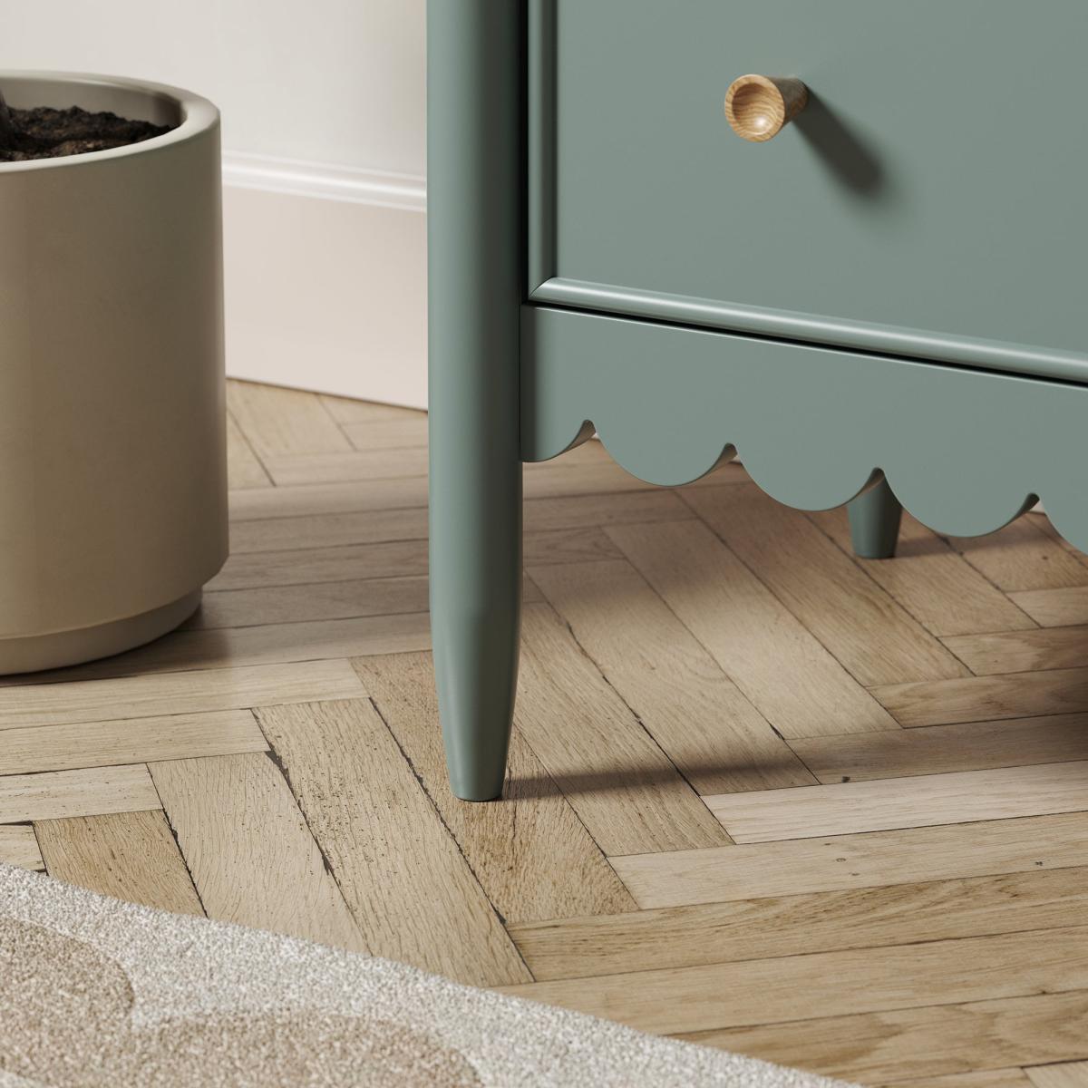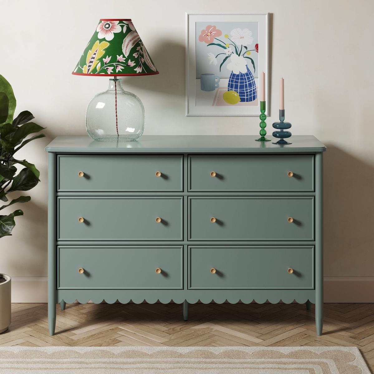 Organise your essentials with ease, from clothing and linens to accessories and personal items, keeping your space tidy and clutter-free. Equipped with six large soft-close drawers, this chest offers ample storage for your belongings. The soft-close mechanism ensures quiet and effortless operation, preventing any jarring noises or accidental slams. With its rounded edges and scallop apron, this chest of drawers adds a graceful flair to any room. The gentle curves create a sense of harmony and balance, while the lily pad green colour palette brings a refreshing and nature-inspired ambiance to your living space. The generously sized table top provides an excellent display area for showcasing your favourite ornaments, cherished photographs, or a bouquet of vibrant flowers. The sturdy construction guarantees long-lasting use, making it a reliable companion for years to come.