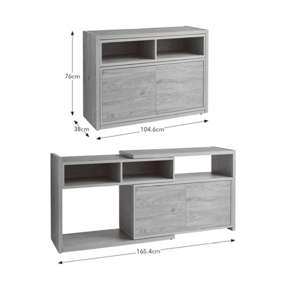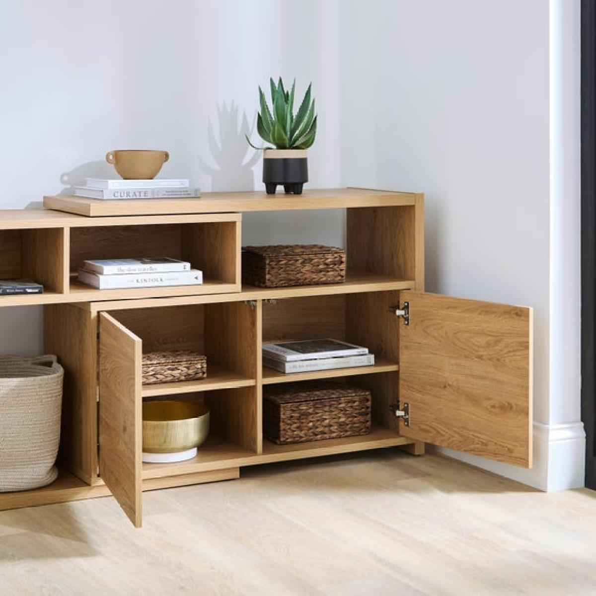 * Sleek modern sideboard * Extendable design * Fits in to corners Bring a touch of contemporary elegance to your home with the Ren extendable sideboard. This beautifully crafted piece combines clean lines with a clever extendable design, giving you the flexibility to expand your storage as needed. Its corner-friendly shape makes it ideal for smaller or multifunctional spaces, while the wood effect finish adds a natural, calming aesthetic.