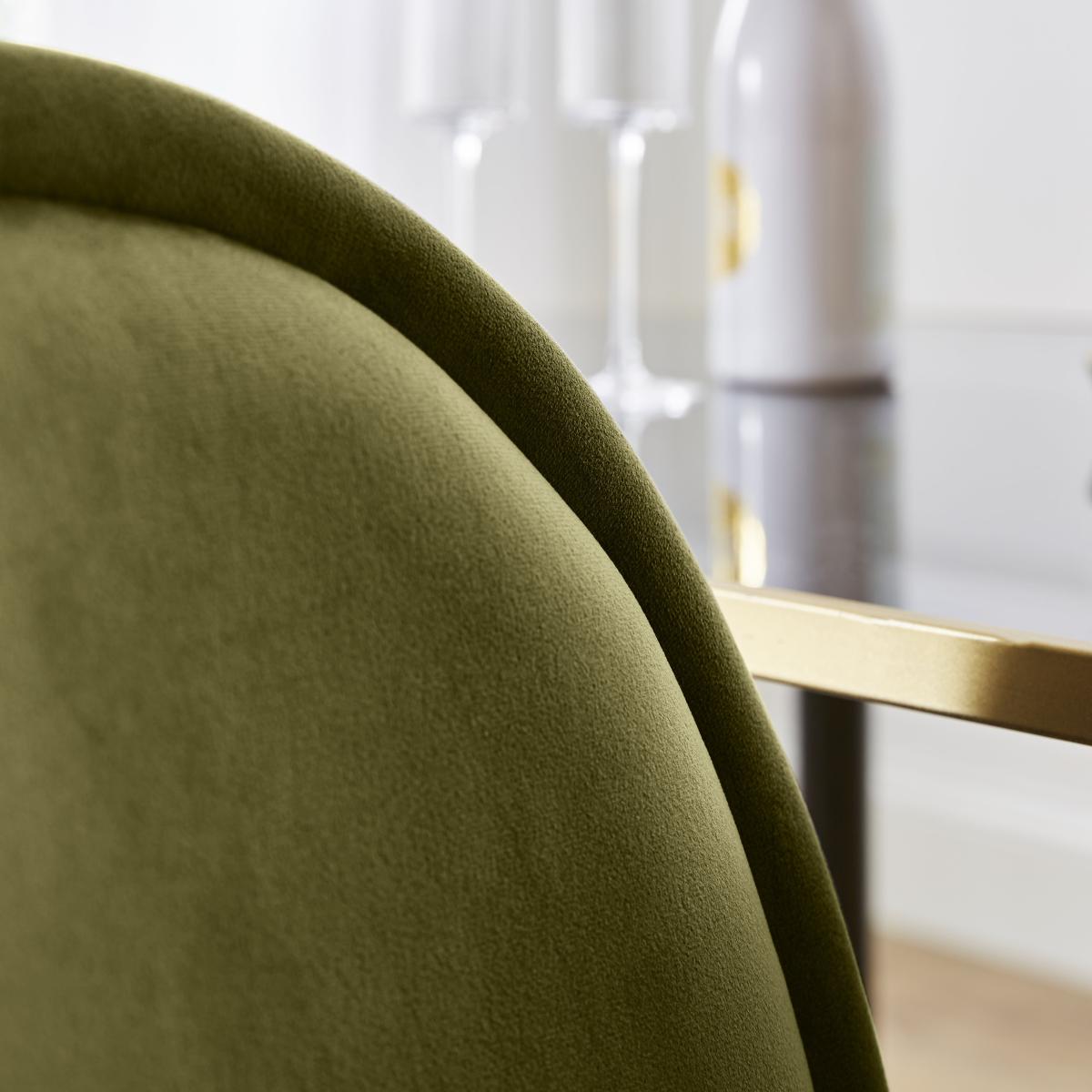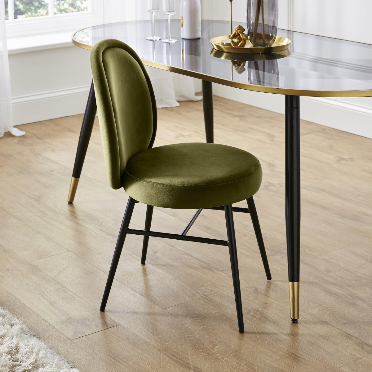 I love this chair for its rich velvet texture and versatile olive shade, which brings warmth and a touch of luxury to dining spaces. It works beautifully in both modern and classic interiors, pairing well with marble-topped tables or wooden surfaces. Practical styling tips include layering with patterned cushions or placing it alongside a statement pendant light to enhance its contemporary appeal. Its inviting look makes it suitable for cosy dinners or more formal gatherings, and the muted tone ensures it remains adaptable across various colour schemes. The mix of comfort and elegance makes it a great choice to elevate your dining area.
