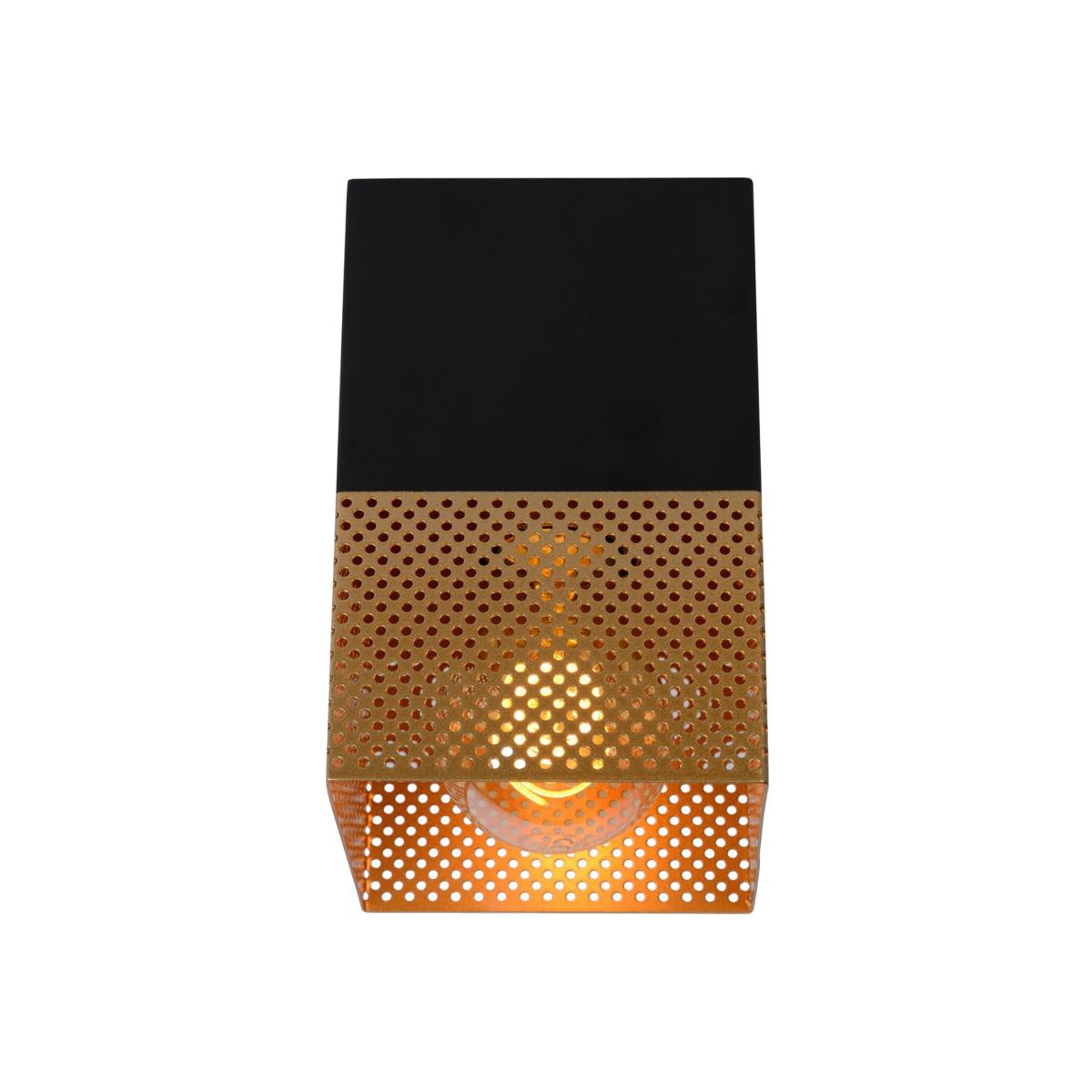 Ceiling lamp Renate is the height of cubism with a twist. The upper, black cube offers a supporting structure for the brass cube around the light bulb. The sides of this open cube are perforated. A nice detail in the design, with extra benefits. The modern light fixture is made of high-quality metal and projects the light neatly downwards. Functionality and design go hand in hand. The small dimensions, 10 by 10 centimetres with a height of 16 centimetres, make it possible to combine multiple Renates in the same space.