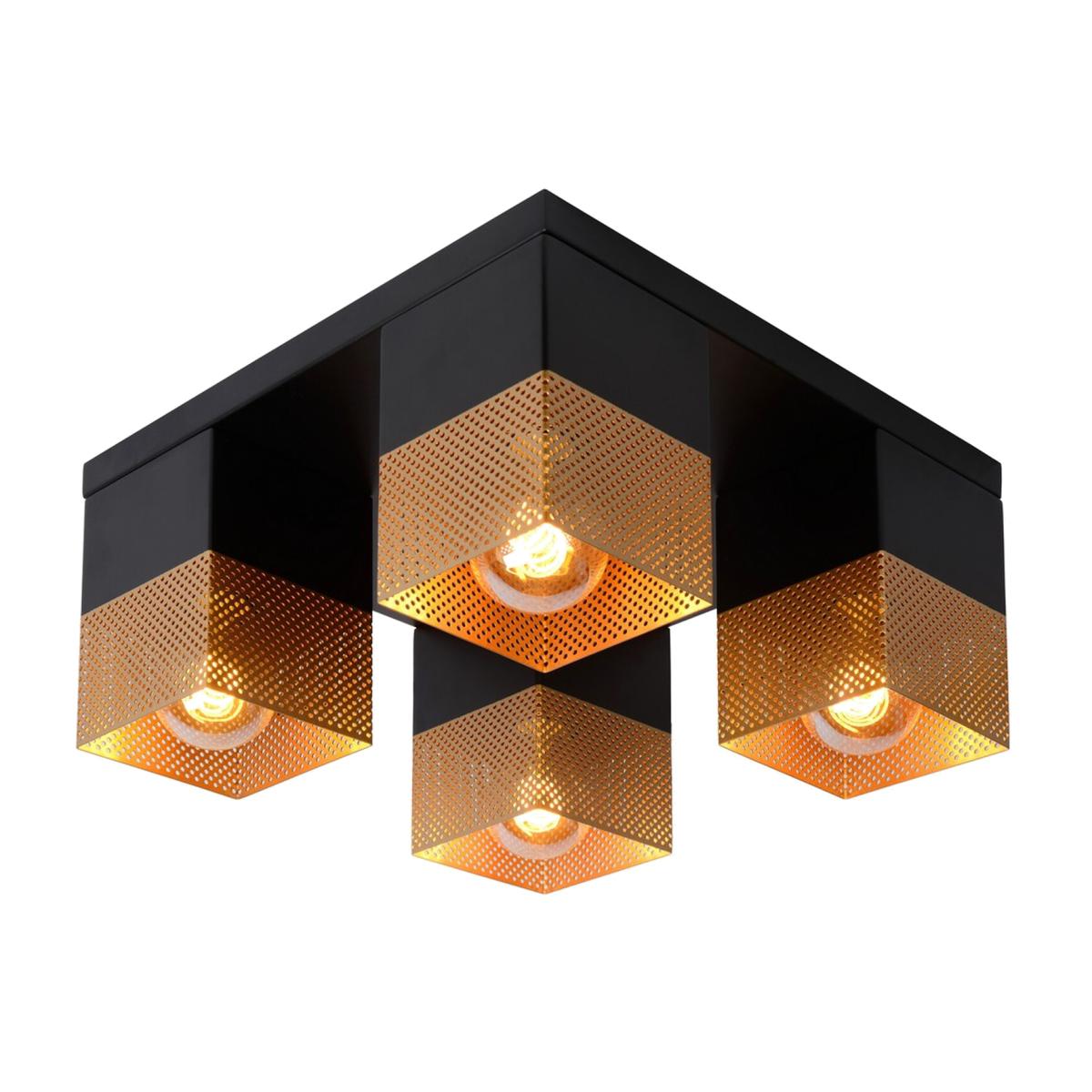 You can't walk on one leg, and nobody wants to be the fifth wheel. Ceiling lamp Renate understands that very well. The square mounting plate terminates in each of its corners in a light bulb, which diffuses its glow downward. While the base, into which the bottom of the lamp turns, is finished in the sleek black of the mounting plate, the casings around the light bulbs go for an elegant, light-revealing jacket. Each bulb hides behind four solid metal plates. These brass walls are perforated for a playful, dynamic play of light. And after connecting to a dimmer, you are the lord and master of the atmosphere in the house.