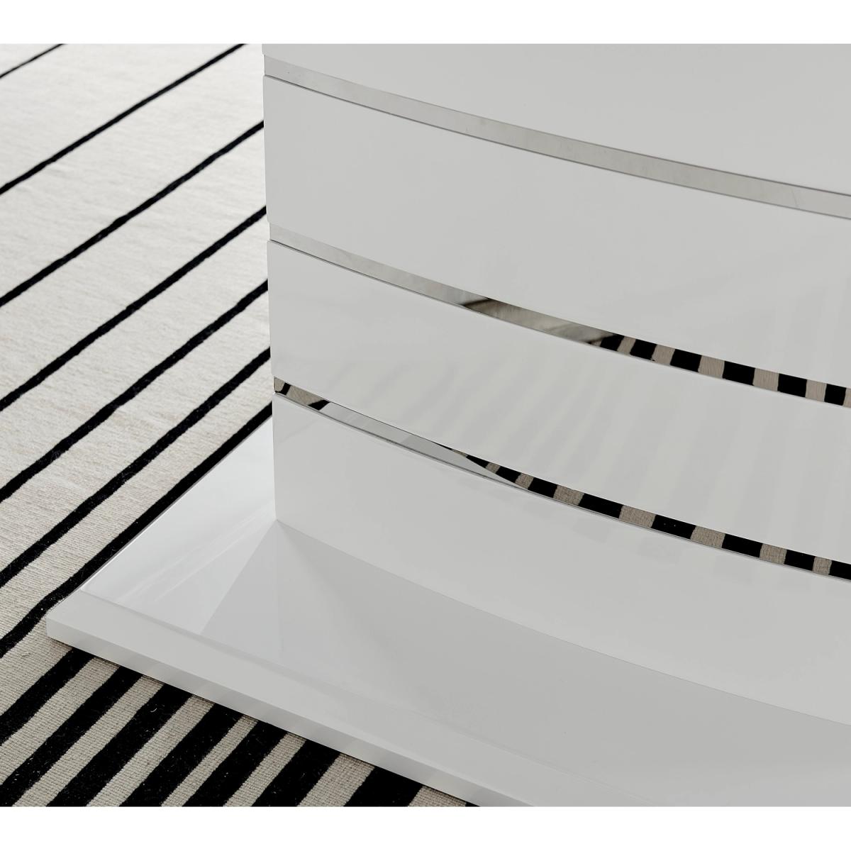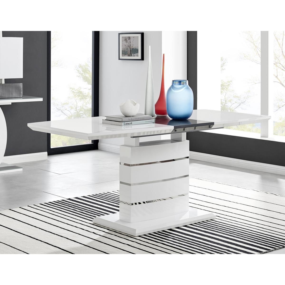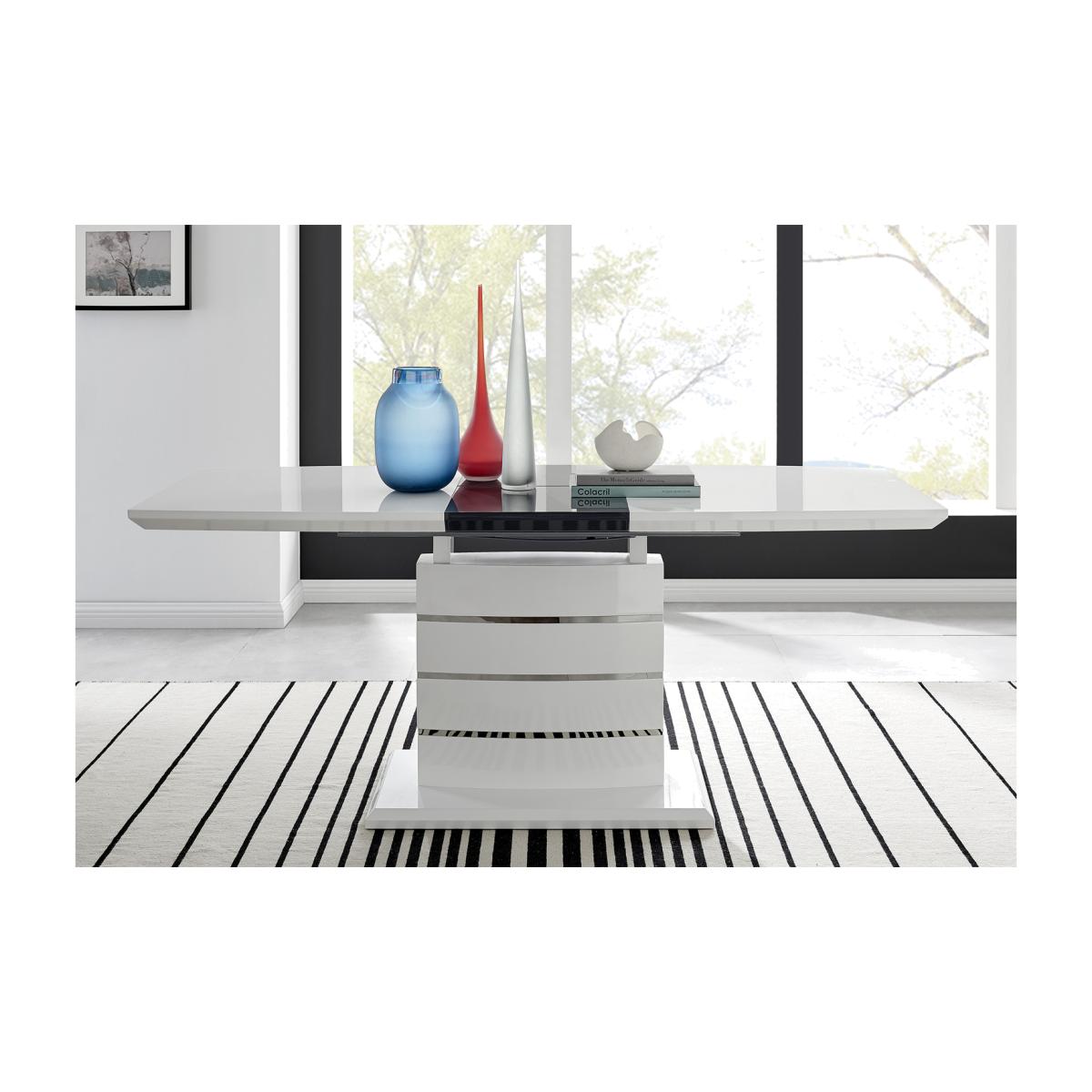 The elegant High Gloss and Chrome Renato Table features an eye-catching stacked base design for the interior connoisseur, you would be forgiven for thinking this table was a sculpture! With the practical addition of extending effortlessly from 140cms to 180cms (L) to seat 8 and with a family-friendly wipe-clean surface, you'll be hard-pressed to find a more stylish and adaptable dining table. When extended, the middle section adds a contrasting panel in dark grey offering a completely new look two tables in one! A handsome addition to any modern home.