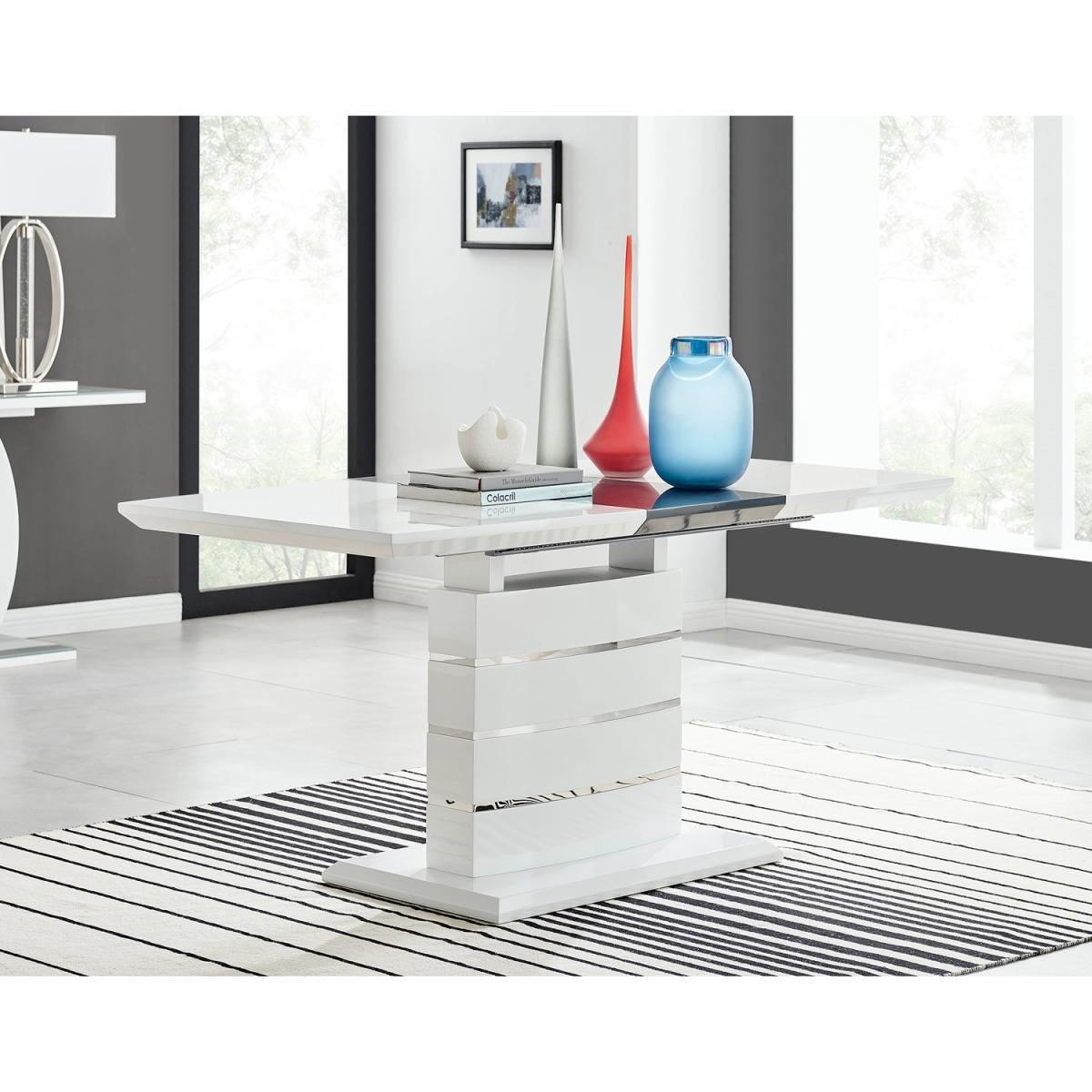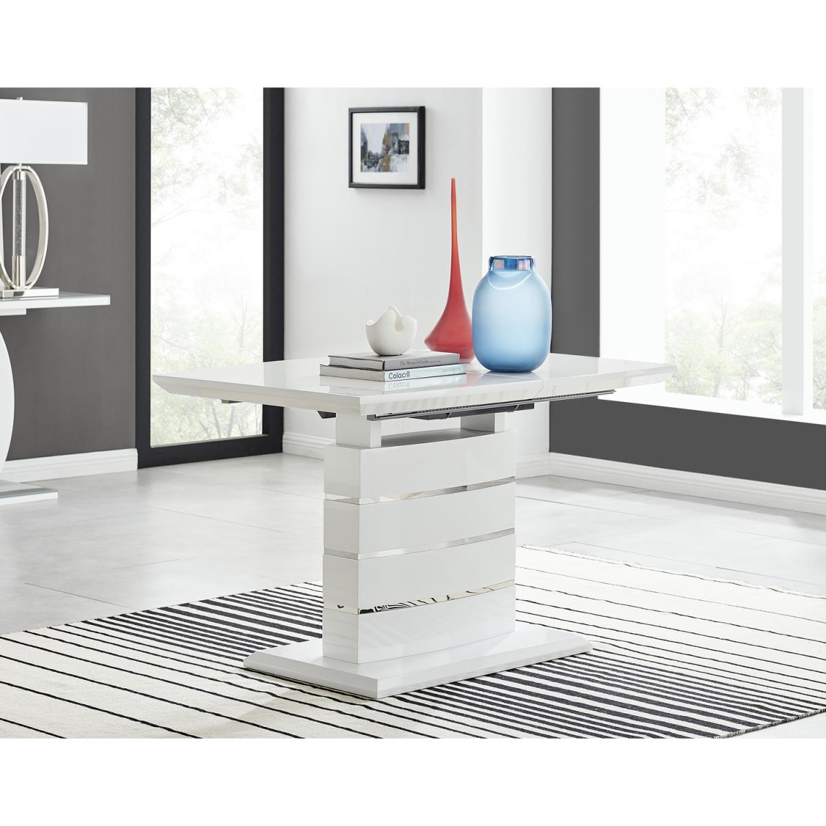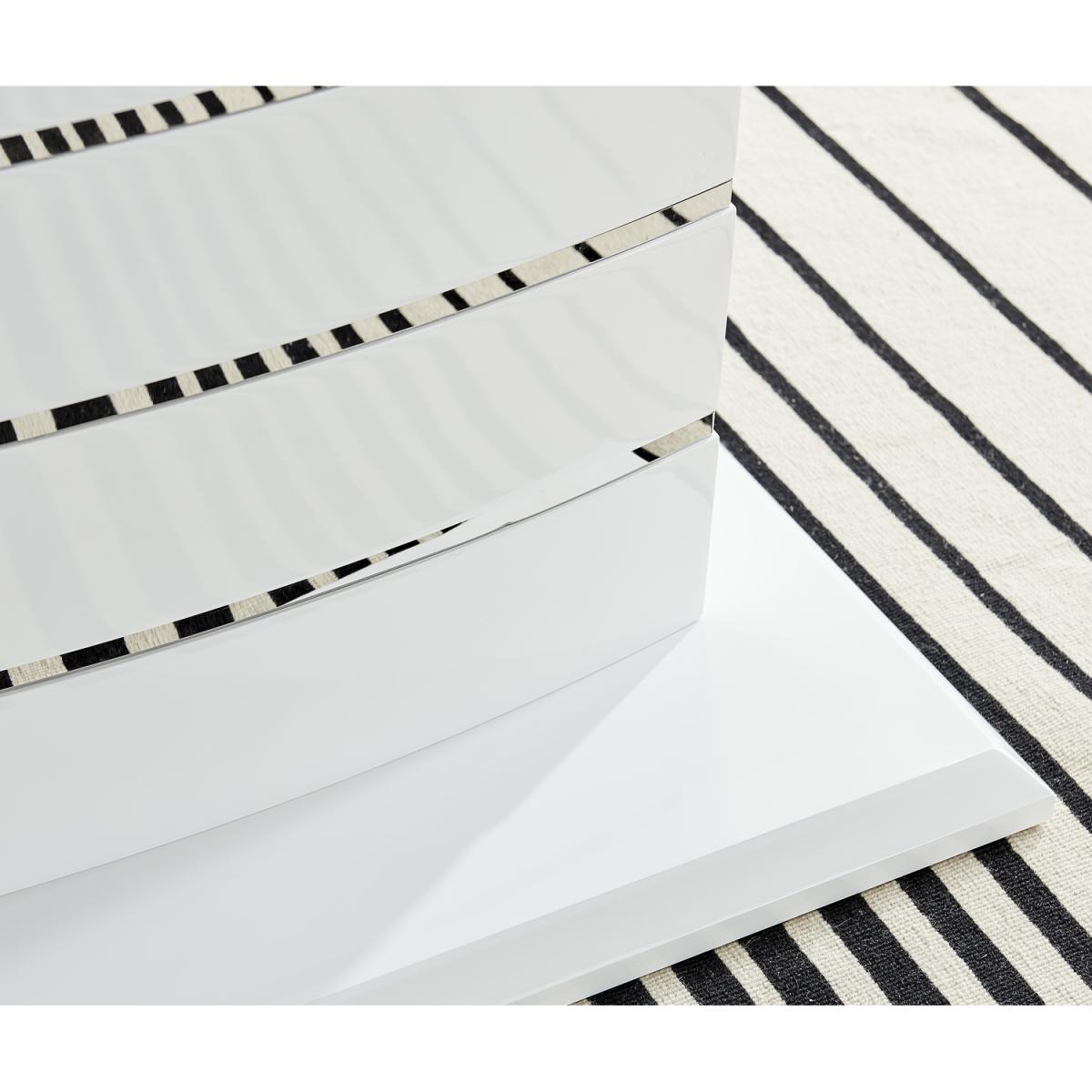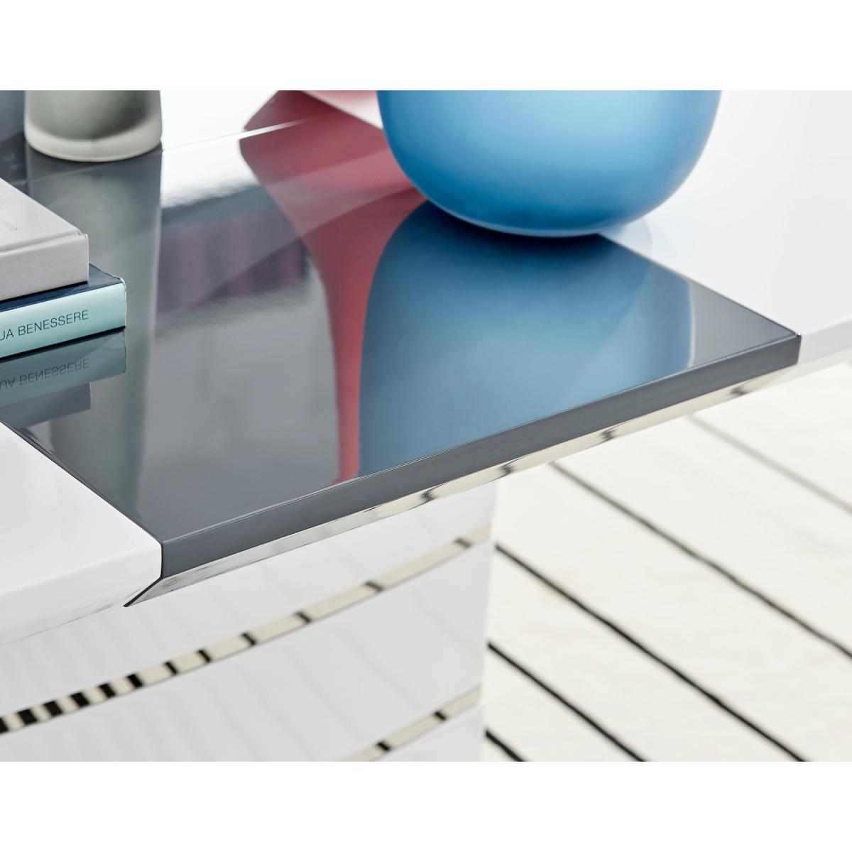 The elegant High Gloss and Chrome Renato Table features an eye-catching stacked base design for the interior connoisseur, you would be forgiven for thinking this table was a sculpture! With the practical addition of extending effortlessly from 120cms to 160cms (L) to seat up to 6 and with a family-friendly wipe-clean surface, you'll be hard-pressed to find a more stylish and adaptable dining table. When extended, the middle section adds a contrasting panel in dark grey offering a completely new look two tables in one! A handsome addition to any modern home.