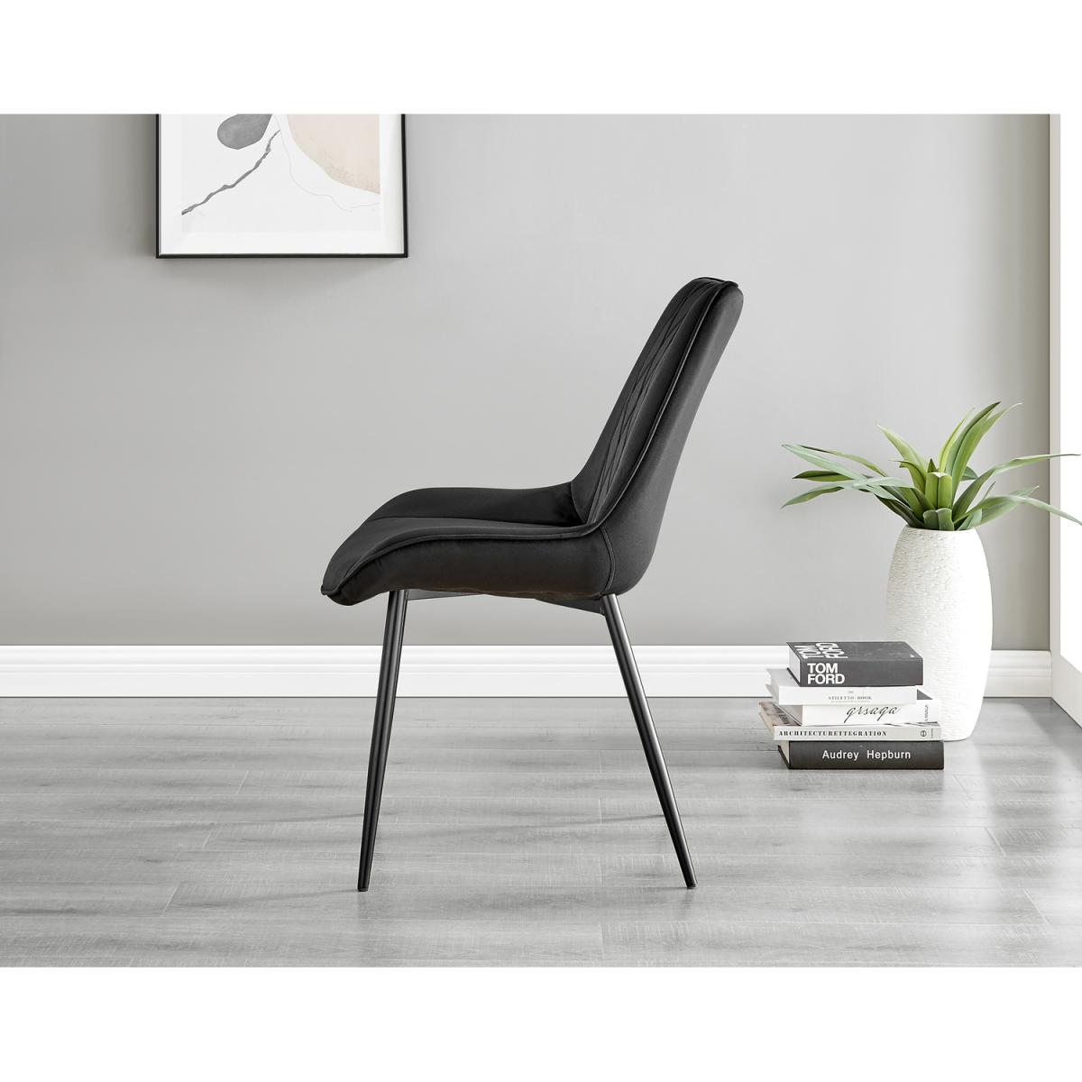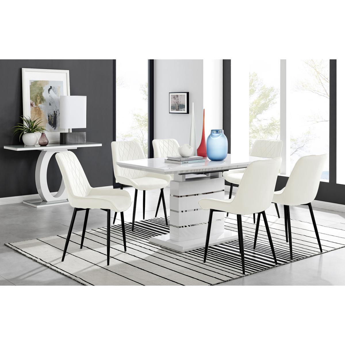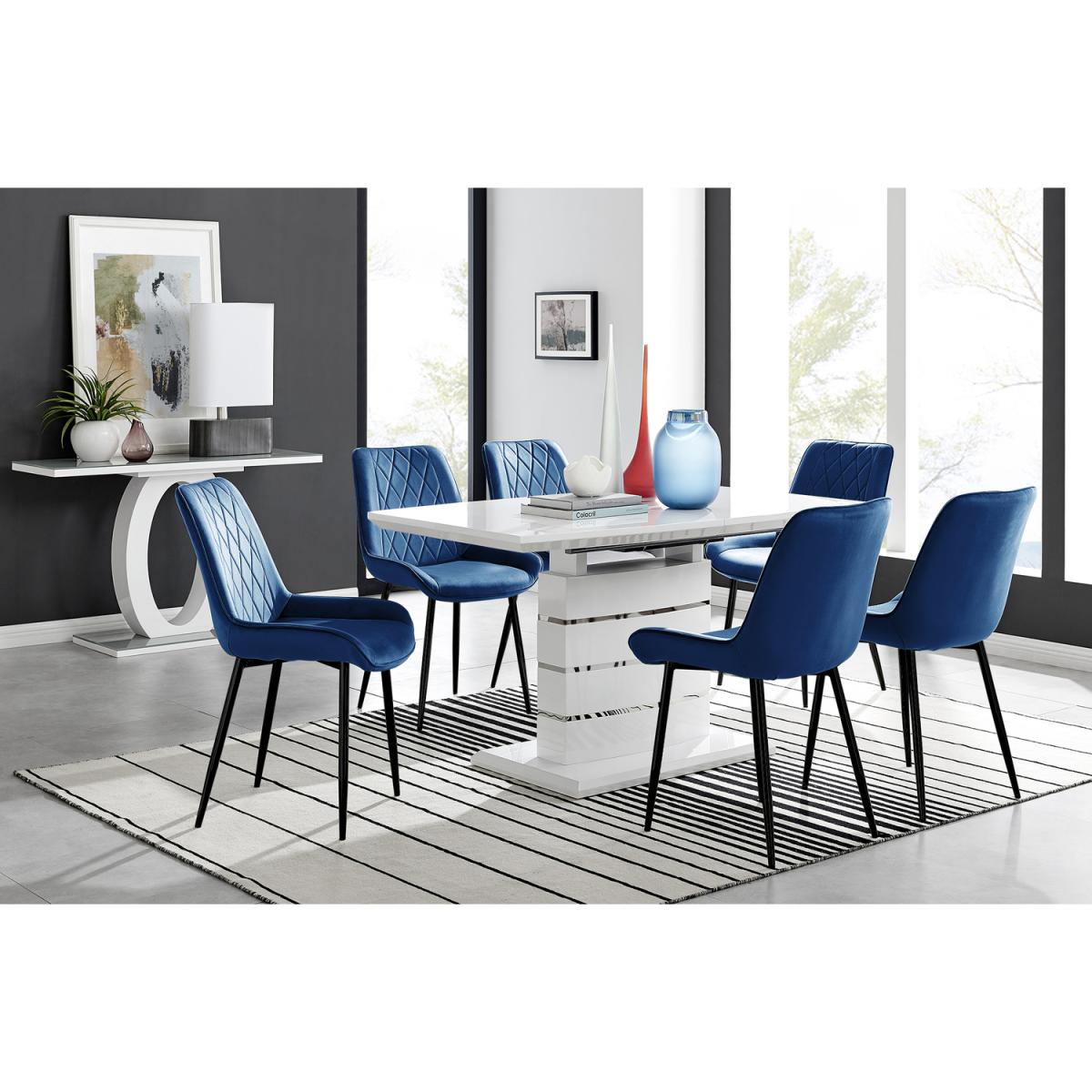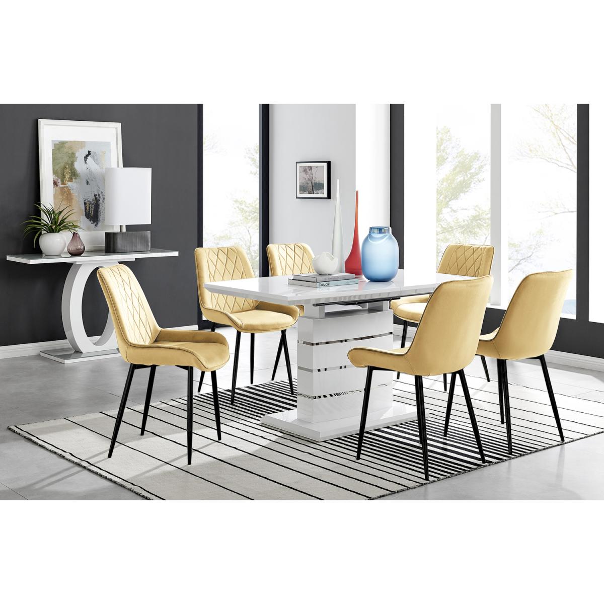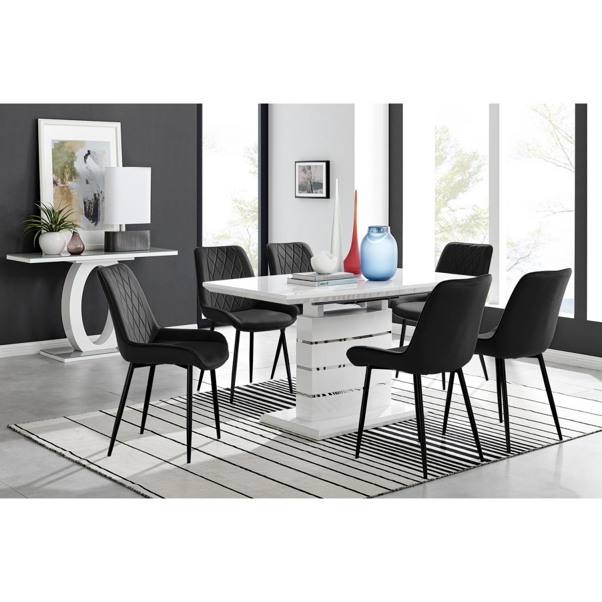 The elegant High Gloss and Chrome Renato Table features an eye-catching stacked base design for the interior connoisseur, you would be forgiven for thinking this table was a sculpture! With the practical addition of extending effortlessly from 140cms to 180cms (L) to seat 8 and with a family-friendly wipe-clean surface, you'll be hard-pressed to find a more stylish and adaptable dining table. When extended, the middle section adds a contrasting panel in dark grey offering a completely new look of two tables in one! A handsome addition to any modern home. Modernise your dining area with our luxurious velvet upholstered Pesaro Dining Chairs. With a nod to the Mid-century modern design era, the Pesaro features gorgeous textured diamond stitching with an ergonomically designed curved seat pad blending seamlessly to the supporting medium high backrest. Sat atop elegant slightly tapered legs in black, chrome or gold effect. The Pesaro is a perfect match to any dining table or use as a luxe vanity seat in the bedroom, as an occasional chair for the living area or to add a bit of luxury to your home office.