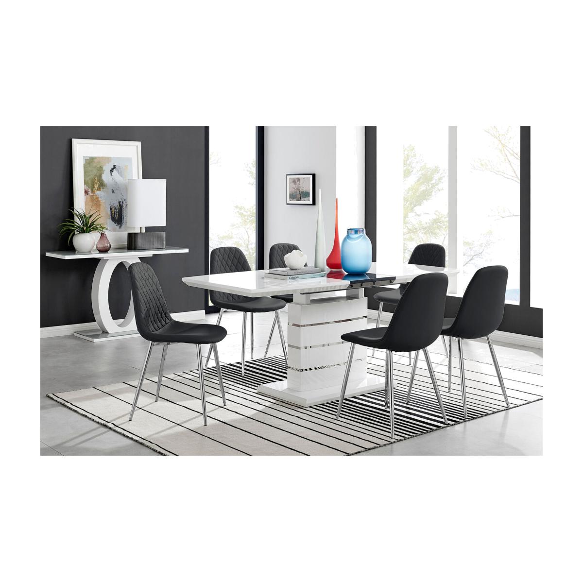 The elegant High Gloss and Chrome Renato Table features an eye-catching stacked base design for the interior connoisseur, you would be forgiven for thinking this table was a sculpture! With the practical addition of extending effortlessly from 140cms to 180cms (L) to seat 8 and with a family-friendly wipe-clean surface, you'll be hard-pressed to find a more stylish and adaptable dining table. When extended, the middle section adds a contrasting panel in dark grey offering a completely new look two tables in one! A handsome addition to any modern home. With a perfect balance of pattern and texture the new Corona Chair is a statement piece ready for the modern dining space. The trendy chrome legs are all the rage and offer a perfect way to add an accent of lustre to your home. The Scandi-style faux leather seat with diamond pattern stitching is a unique take on a classic design offering comfort and durability for everyday use.