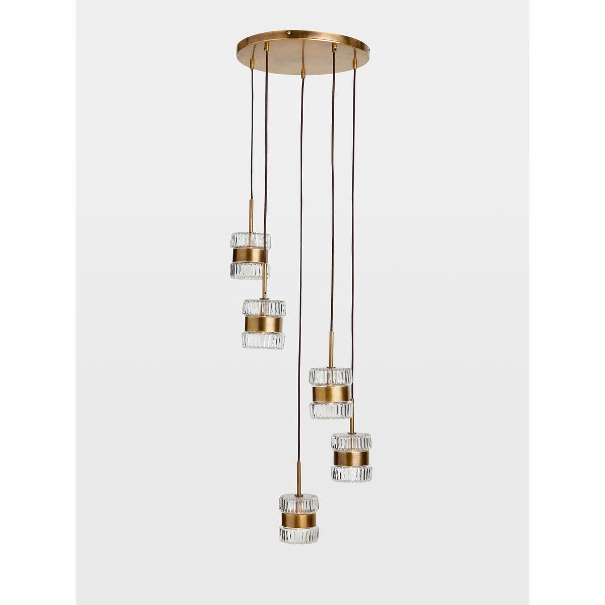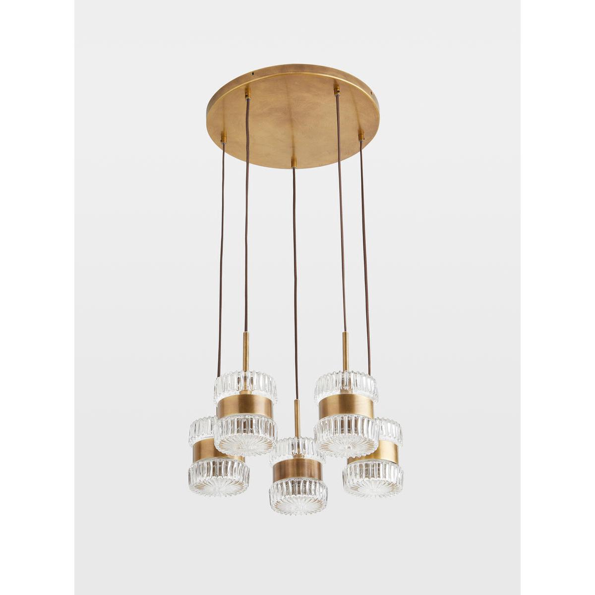 Influenced by the glamour of traditional American interiors, the Renato multi pendant features a fixed brass finish frame with fivefaceted glass cylinders that hang at different heights, castingdistinctive light patterns. Look for similar styles in our North American Houses, including Brooklyn's DUMBO House. Antique brass finish multi pendant. Five glass cylinders. Requires 1 x G9 halogen or LED bulb/ max 28. W. Pair with other pieces in the Renato range. Inspired by DUMBO House.