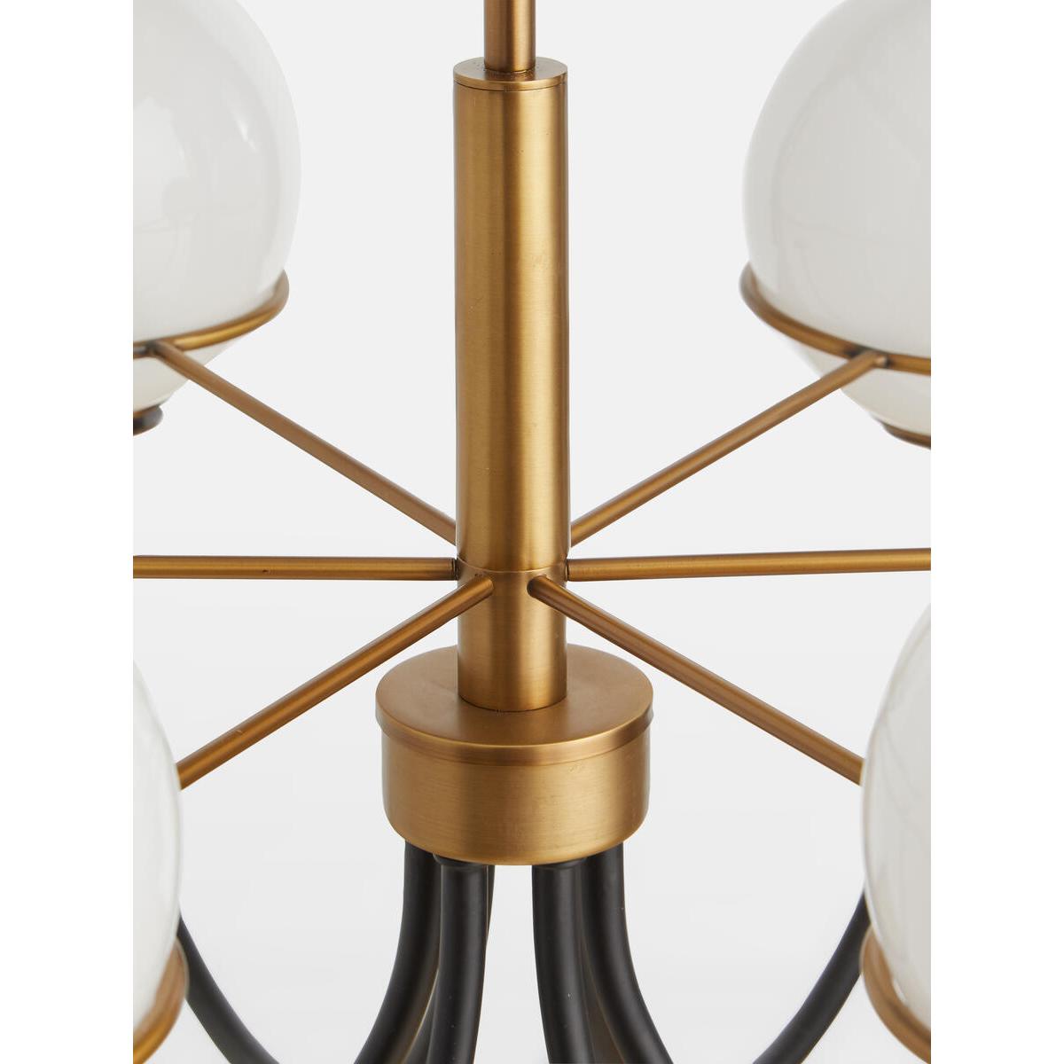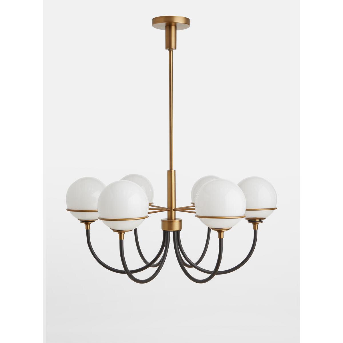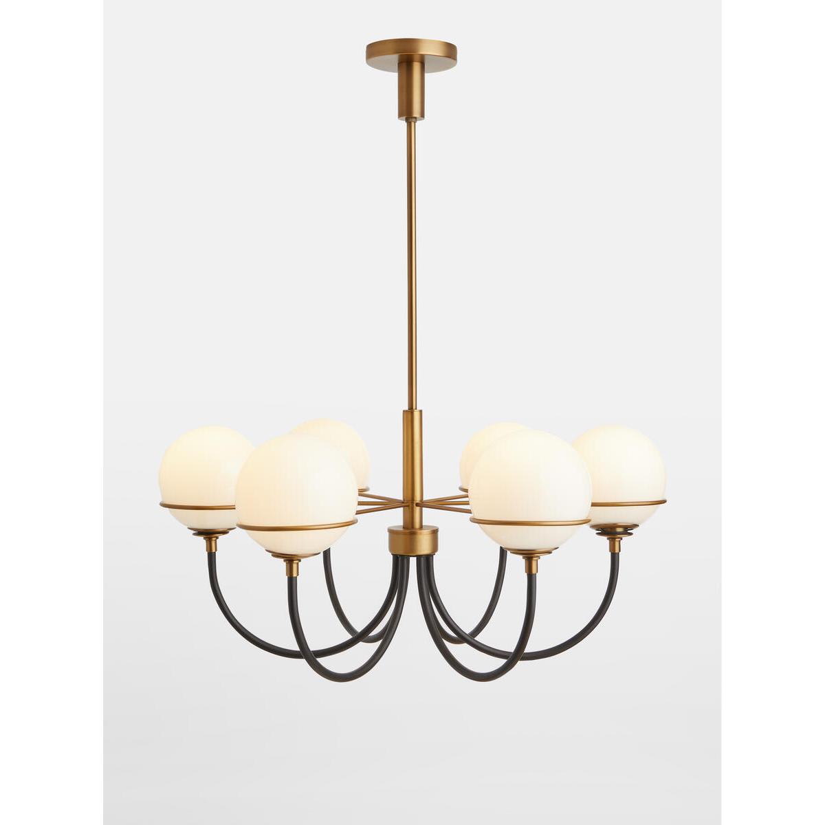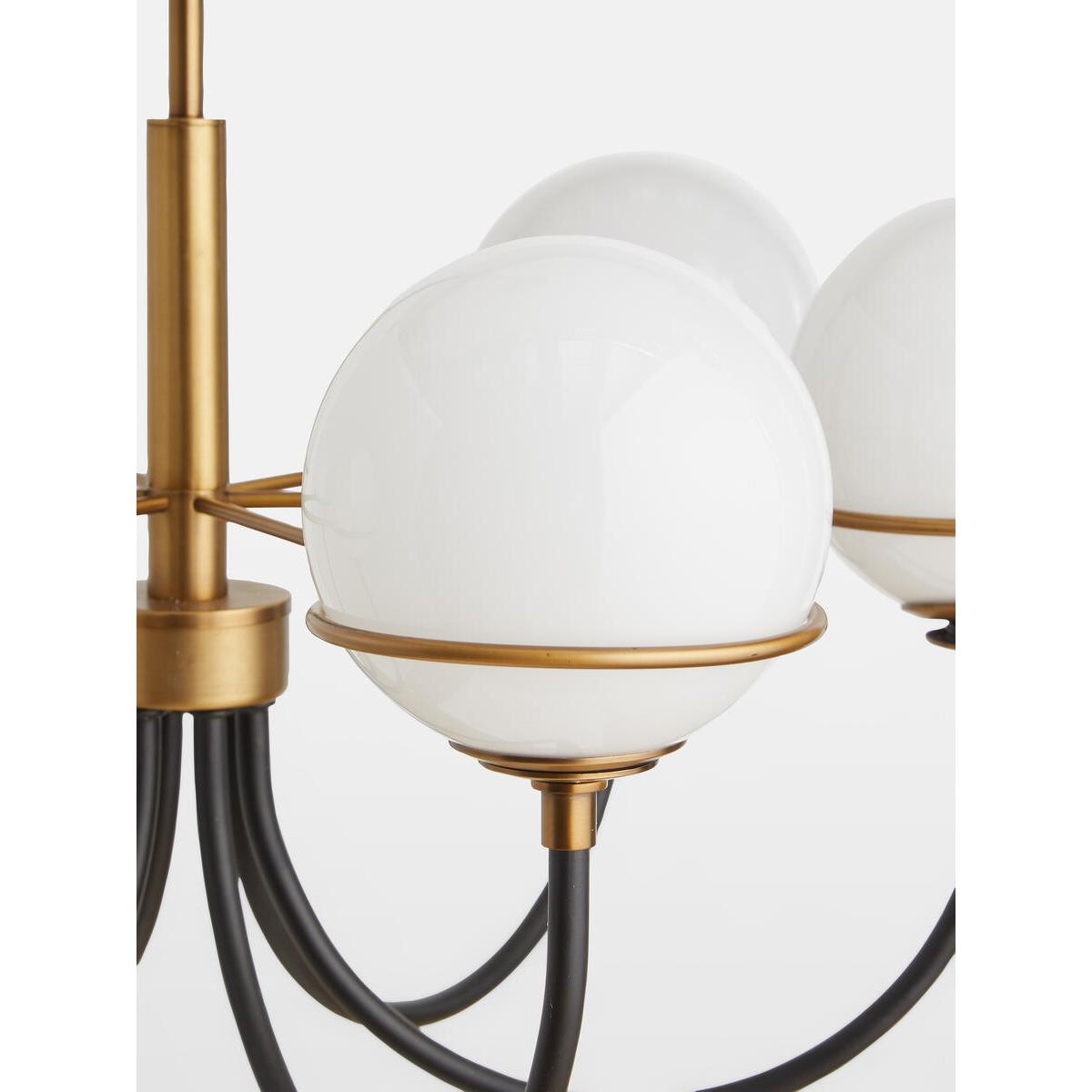 The Rene chandelier has six glass orbs sitting in antique brassholders, suspended in a hanging formation, and is inspired by thelights found in our Soho Works spaces. Curved black tubes appear tofloat beneath the globes, enhancing the sculptural quality of thedesign. Chandelier with six glass orbs supported by brassholders. Curved black tubes underneath. Antique brass-finished frame. 6 / E14 / CANDLE / LED / 6W MAXIMUM. Inspired by Soho Works.