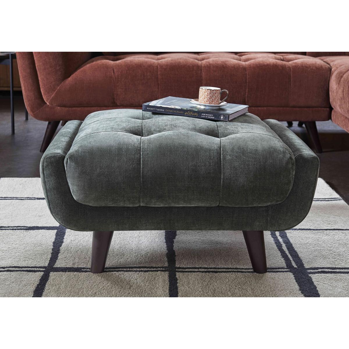 The Rene range is crafted for those who know exactly what they want from their interior. Offering the ultimate style combination of modern glamour and retro design, Rene’s contemporary and confident sofas, armchairs and footstools are available in both ultra-soft velvet and sumptuous leather. Choose from a fabulous selection of colours for the beautifully buttoned upholstery. And this range feels as good as it looks thanks to its lounge worthy pocket sprung seating and supportive cushioning. The Rene range is exclusively crafted for Furniture Village. Complete your living room in style with the very appealing retro-inspired Rene footstool. With its cushioned and buttoned top, it makes an excellent extra seat as well as a footrest. Why you'll love it Glamourous design with a retro feel for those who truly love luxury. Striking curved shape with a beautiful buttoned top. In a wide choice of lustrous velvety-feel upholstery fabric options. Elegant tapered walnut-finished legs. Built to last with a solid wood frame. This footstool is also available with 100% leather upholstery. Exclusive to Furniture Village. This small fabric footstool is part of our Rene range. What you need to know Top cushioning:foam. Flattening and shading of heavy wear areas on pile fabrics is unavoidable. Clean regularly using a soft brush or vacuum with the curtain attachment. Deal with any spills promptly. Professional cleaning advised for oil- and grease-based stains. Please read our upholstery care guide for more advice.