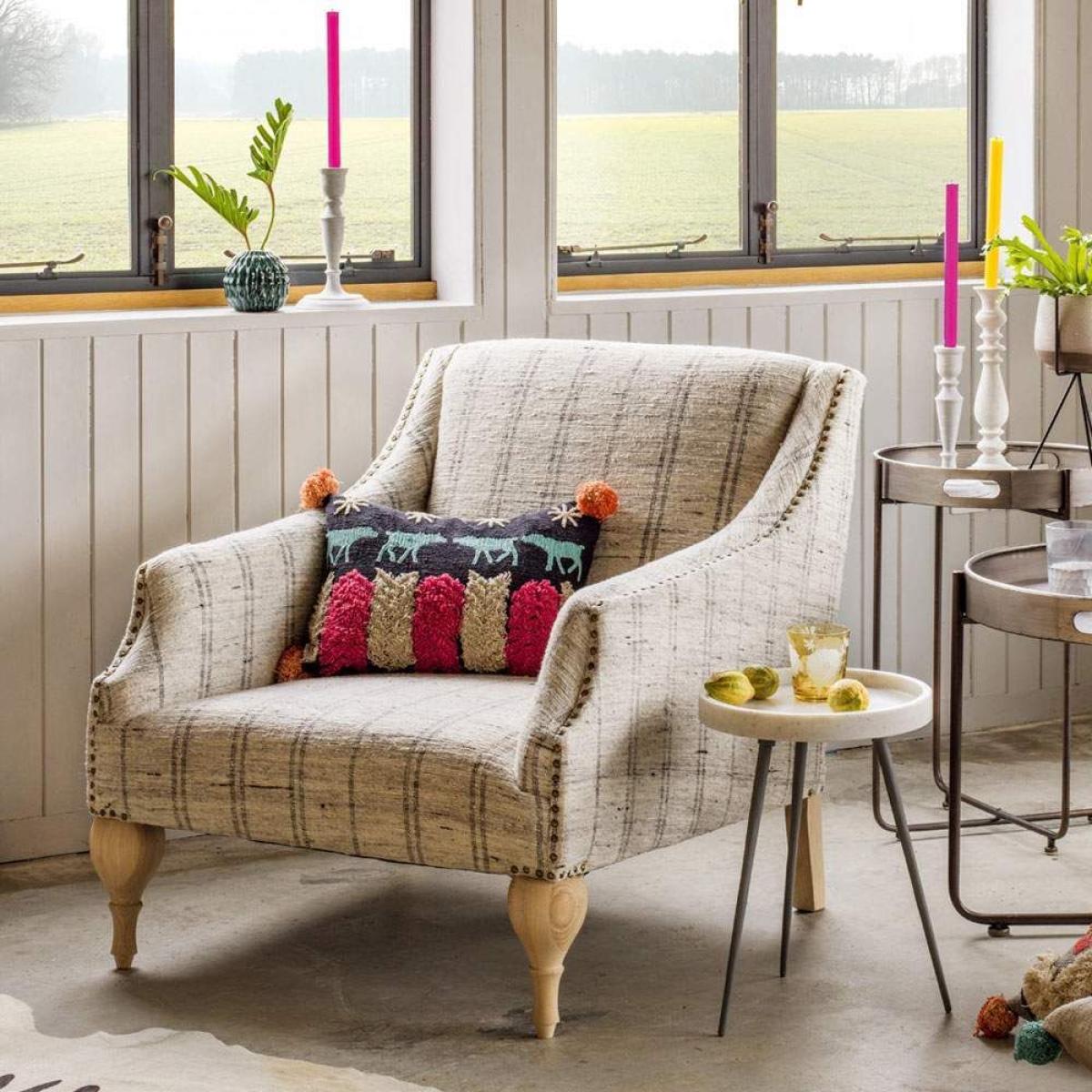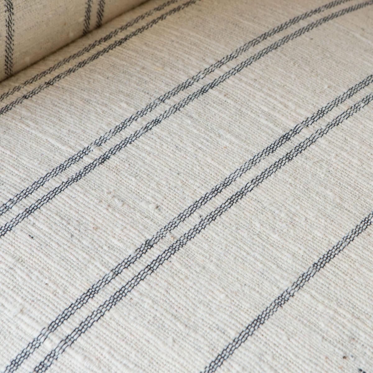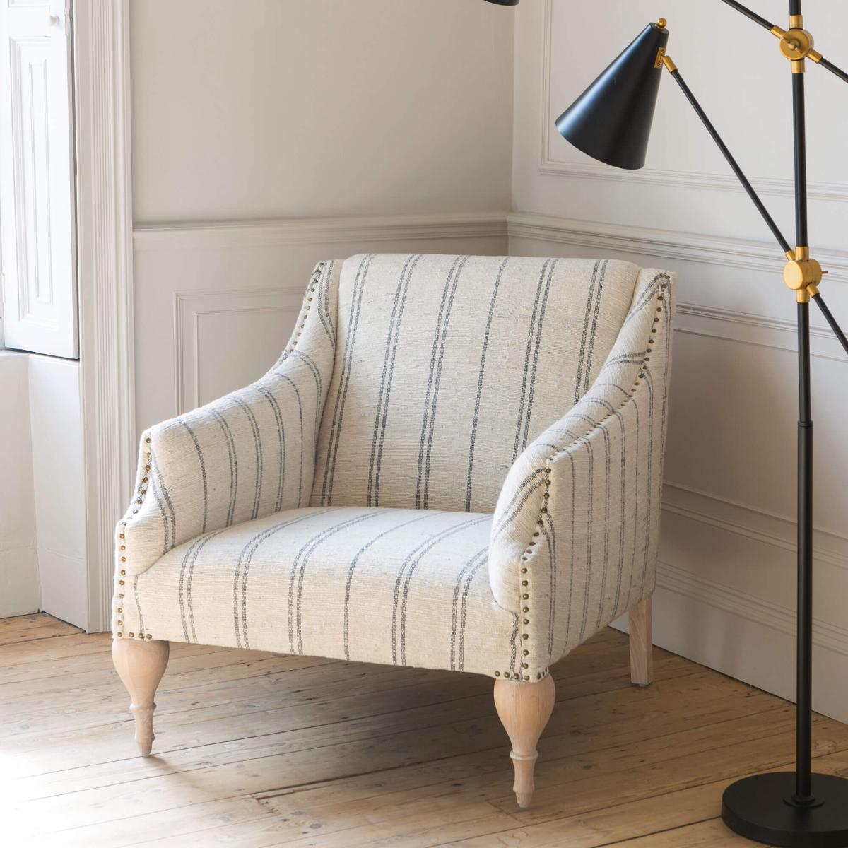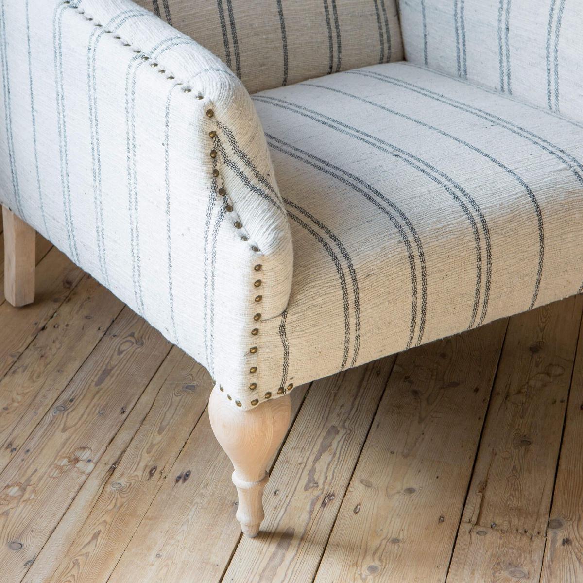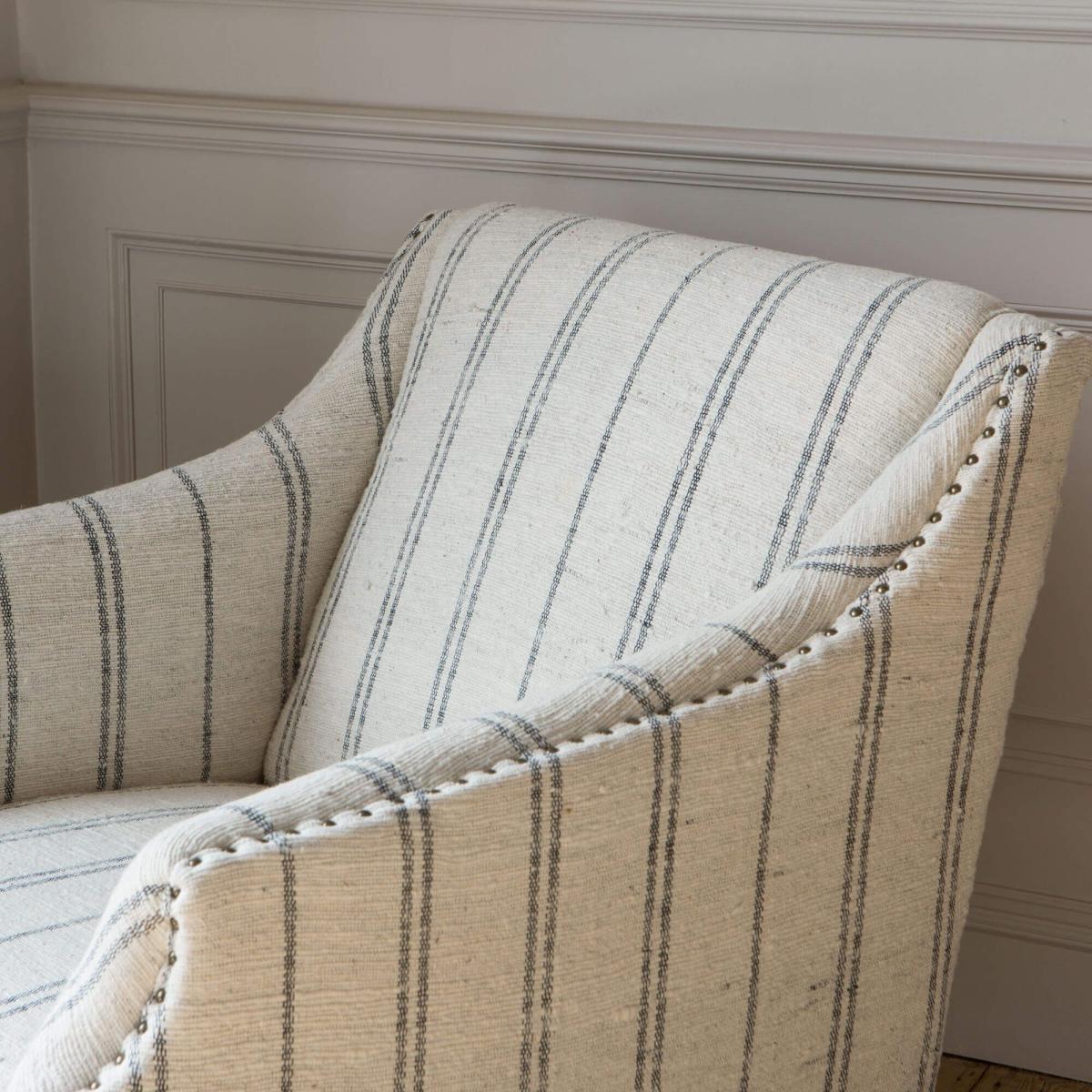 With deep in seat depth, our Renée Linen Stripe Armchair beholds both rustic and elegant allure. The hand loomed nature of the cotton and wool blended fabric gives this seating option an artisan touch. The ornately carved, blond wood legs and brass rivet detailing provide understated grandeur, ensuring the armchair works perfectly with traditional interiors.