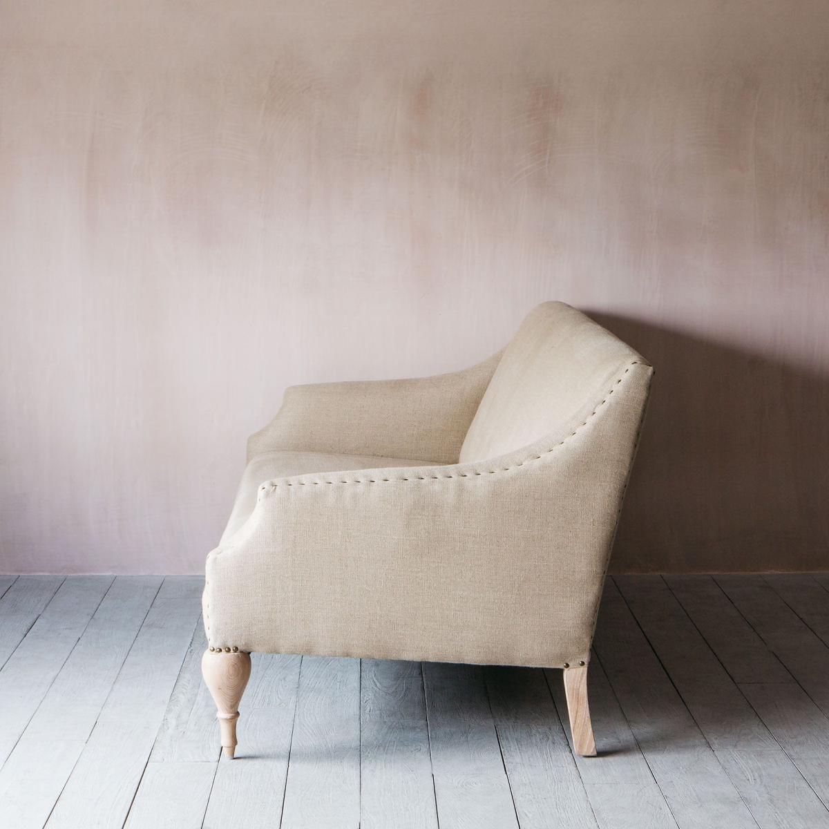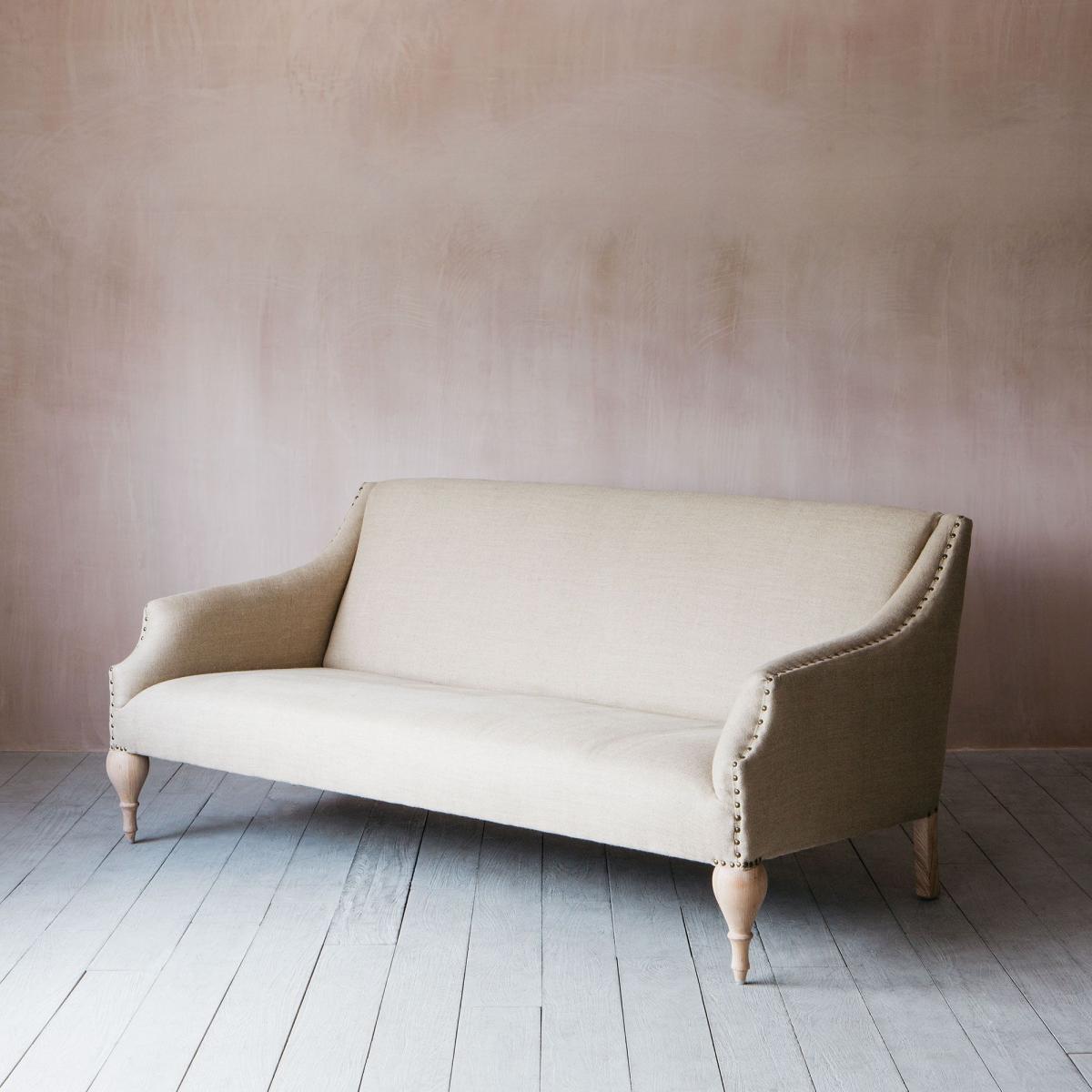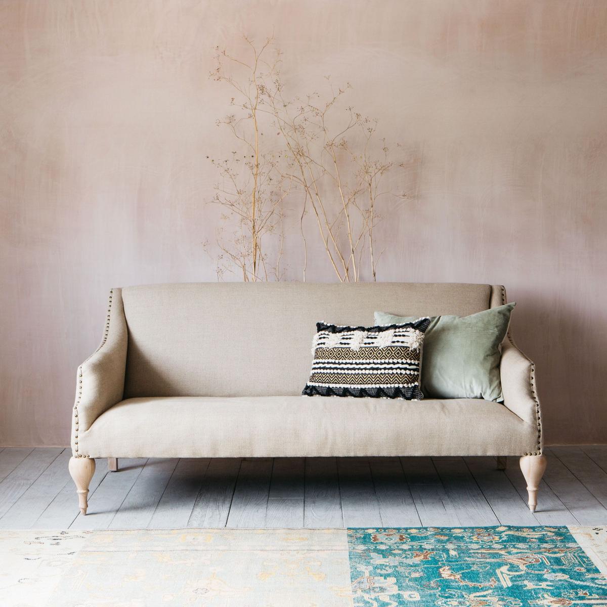 The Renée sofa re-imagined in a generous two and a half seater size. Handcrafted in India and upholstered in a beautiful linen, with carved mango wood legs and brass rivet detailing. This French-inspired sofa will feel like a treasured antique in your home. H85 x W185 x D95cm. Seat height: 46cm | Seat depth: 60cm | Back height: 39cm. Leg height: 22cm. Arm height: 23cm. Made of mango wood and upholstered in linen. Due to the handmade nature of this product, the colour and finish may vary. Upholstery exclusive to G&G.