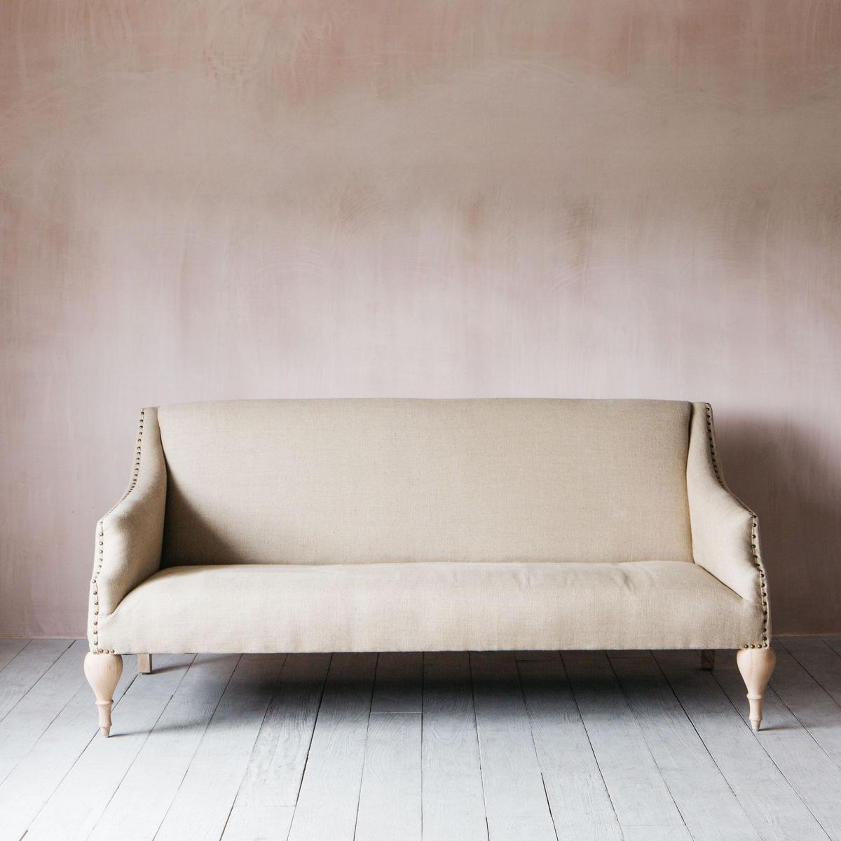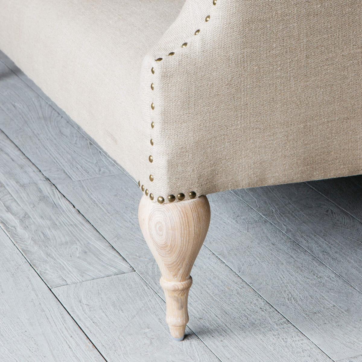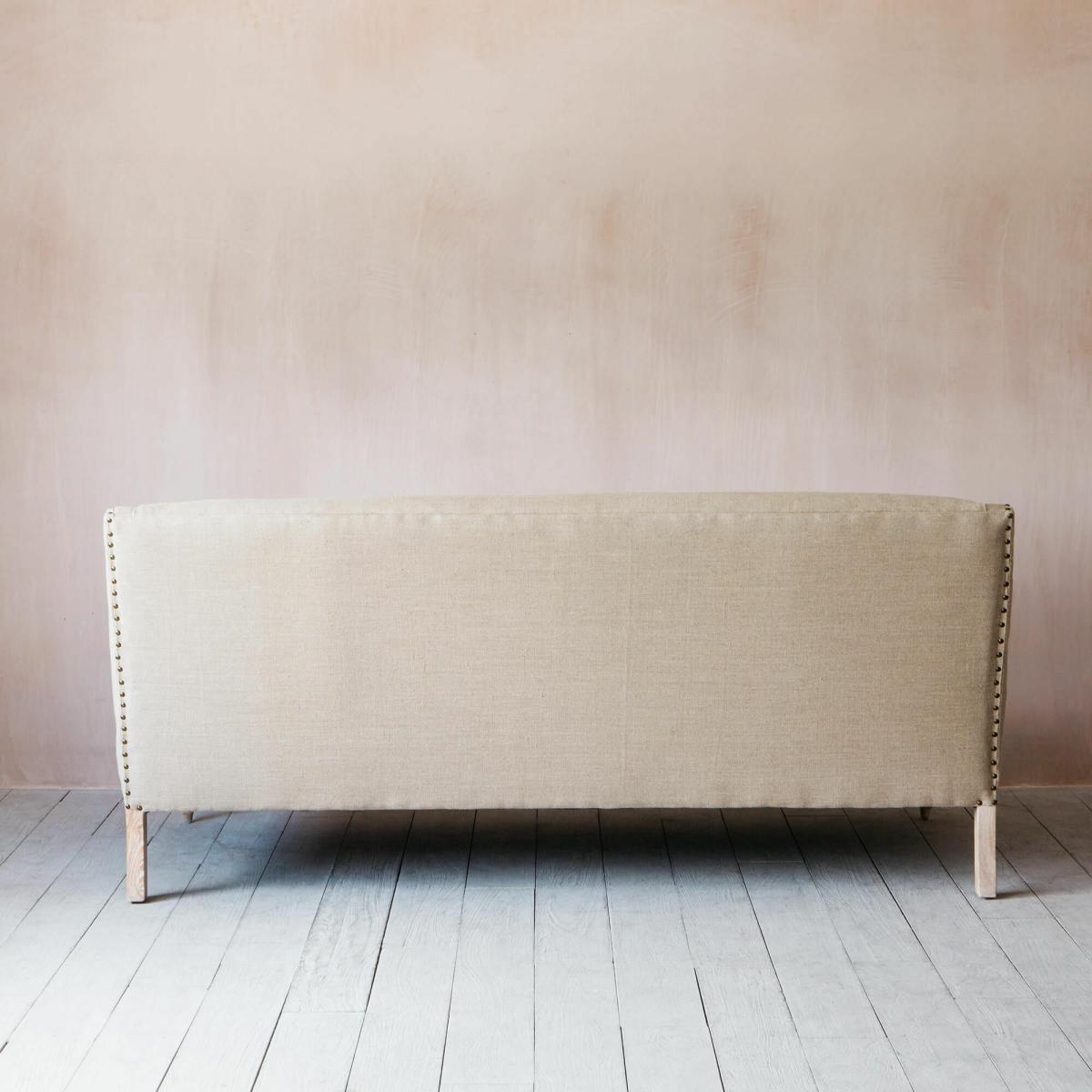 The Renée sofa re-imagined in a generous two and a half seater size. Handcrafted in India and upholstered in a beautiful linen, with carved mango wood legs and brass rivet detailing. This French-inspired sofa will feel like a treasured antique in your home. H85 x W185 x D95cm. Seat height: 46cm | Seat depth: 60cm | Back height: 39cm. Leg height: 22cm. Arm height: 23cm. Made of mango wood and upholstered in linen. Due to the handmade nature of this product, the colour and finish may vary. Upholstery exclusive to G&G.