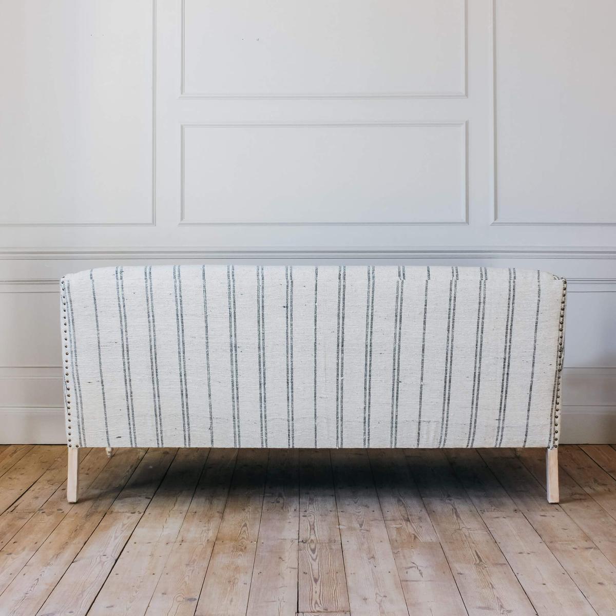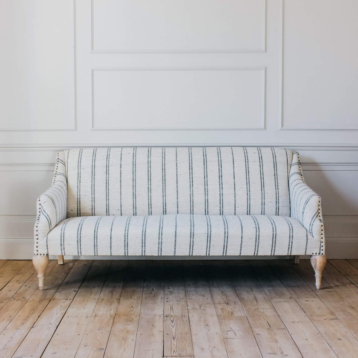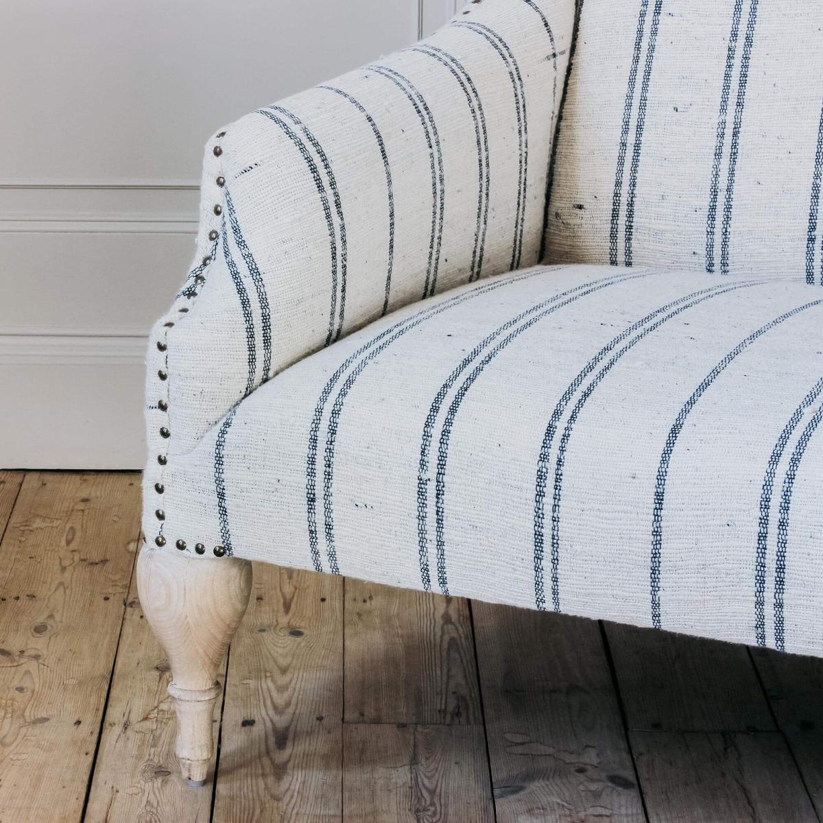 The Renée sofa collection has been handcrafted in India and is upholstered in beautiful hand-loomed cotton and wool blend fabric with a ticking stripe pattern and twisted slub finish. Featuring carved mango wood legs and brass rivet detailing, the Renée now comes in a two and a half seater size.