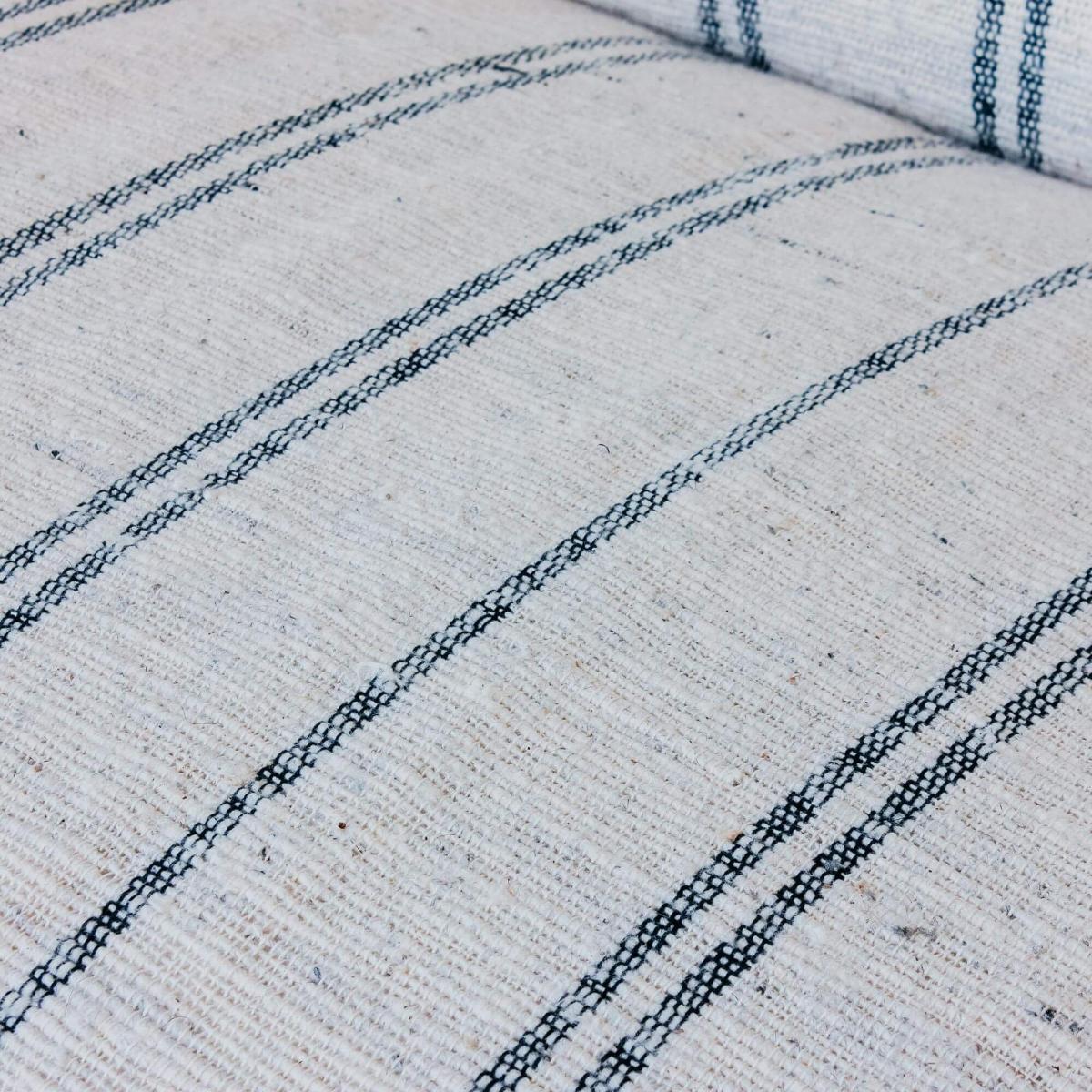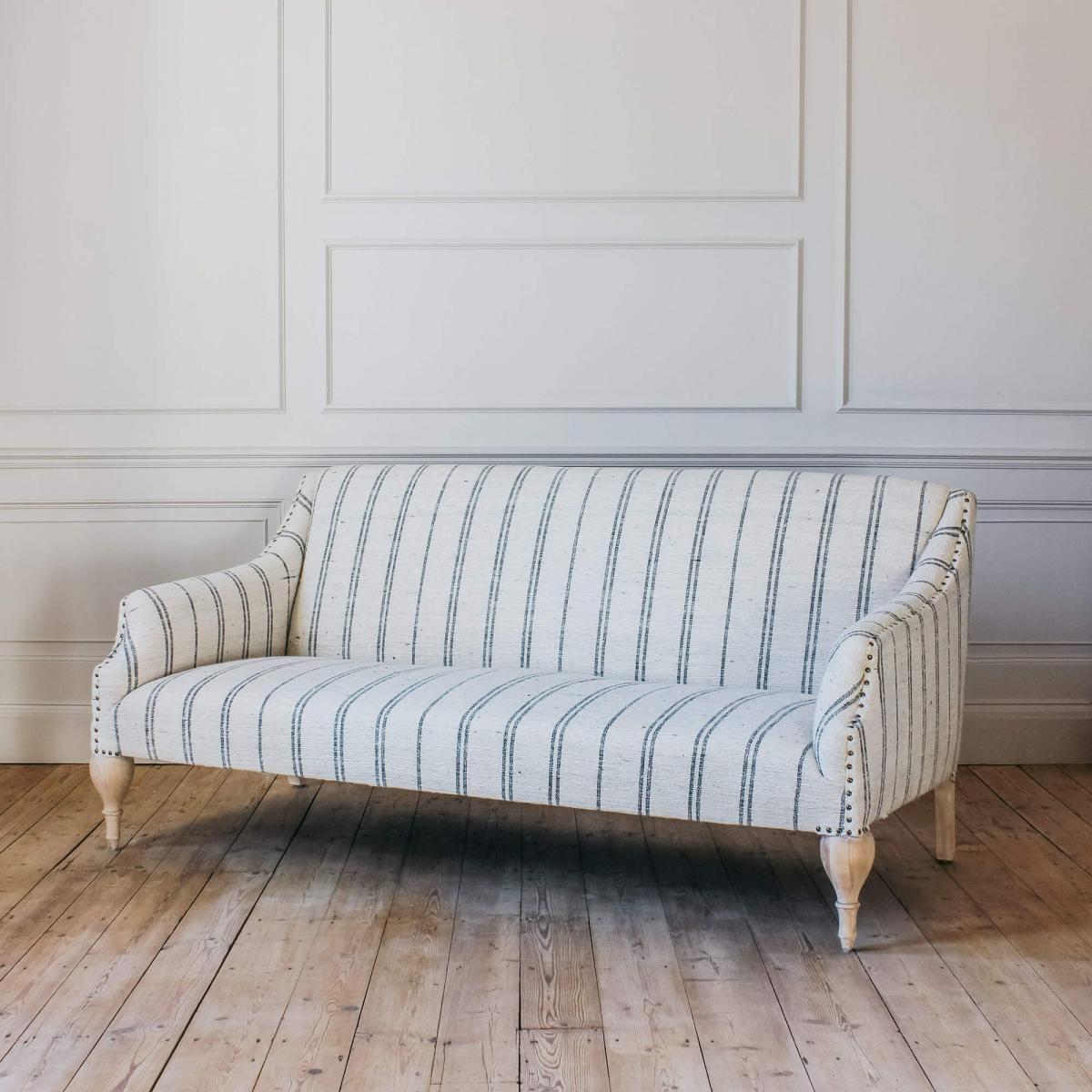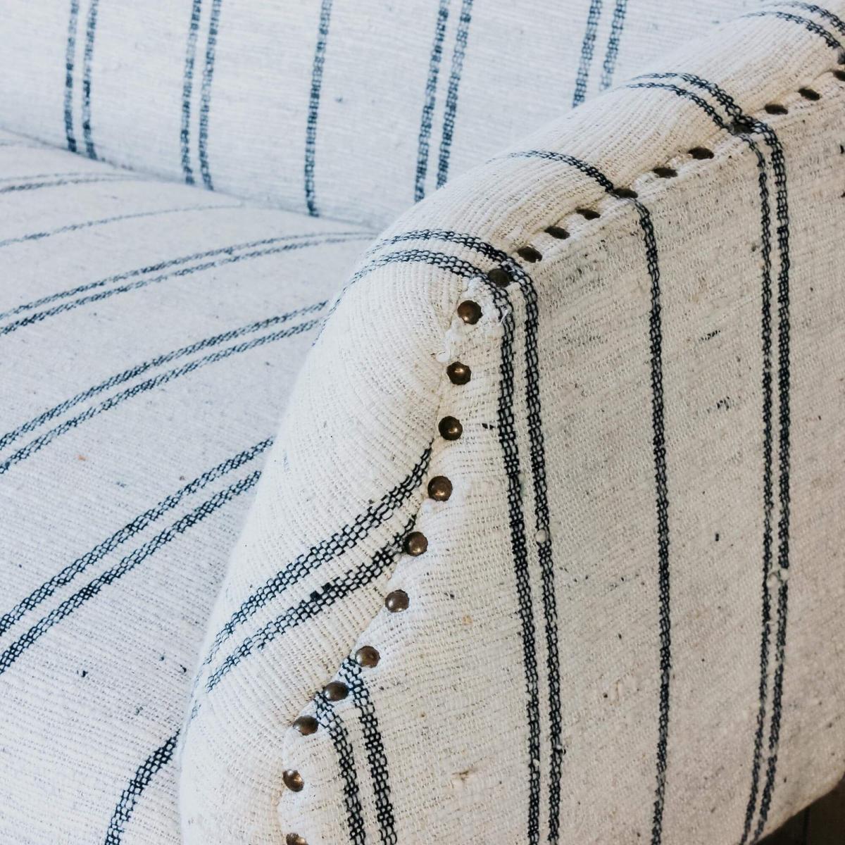 The Renée sofa collection has been handcrafted in India and is upholstered in beautiful hand-loomed cotton and wool blend fabric with a ticking stripe pattern and twisted slub finish. Featuring carved mango wood legs and brass rivet detailing, the Renée now comes in a two and a half seater size.