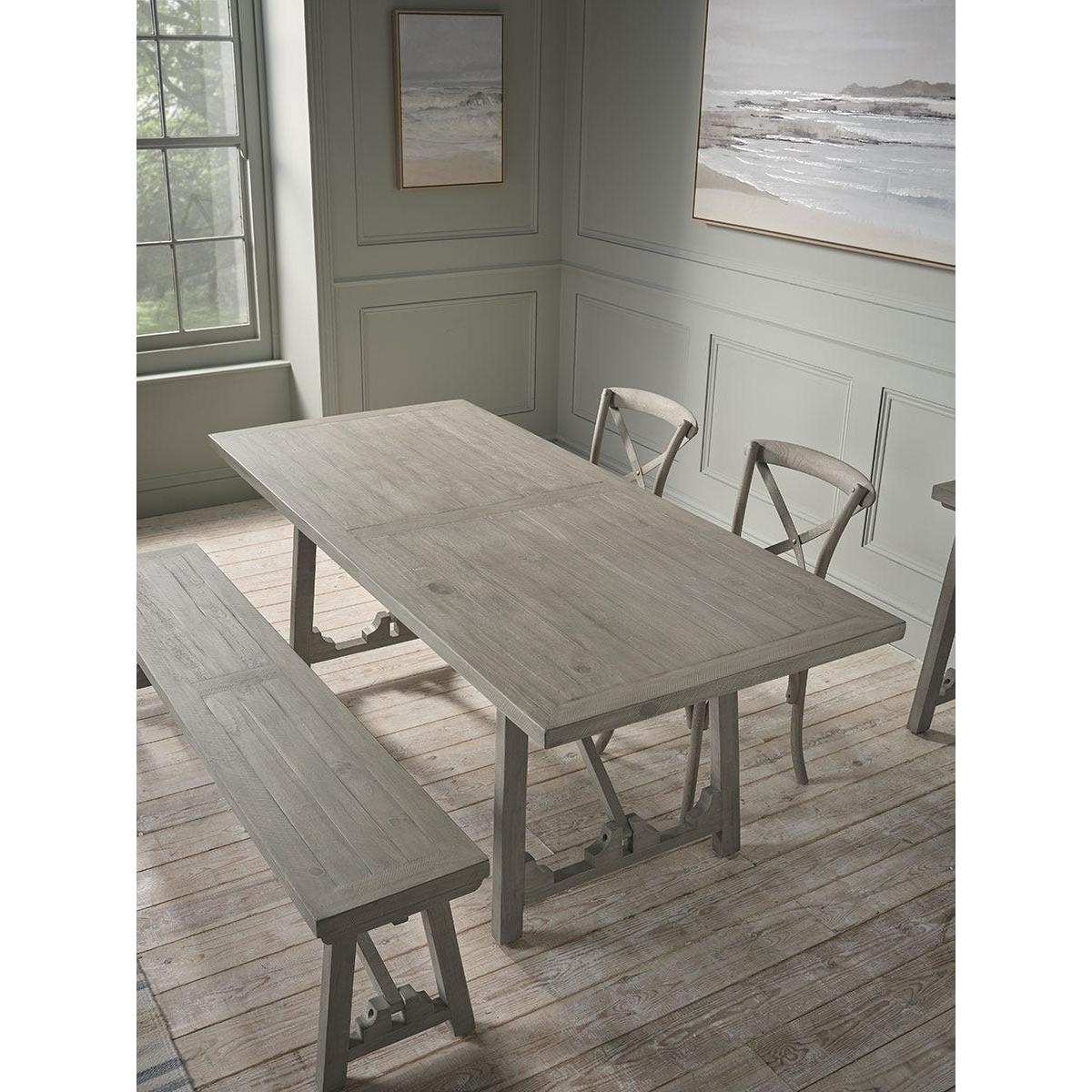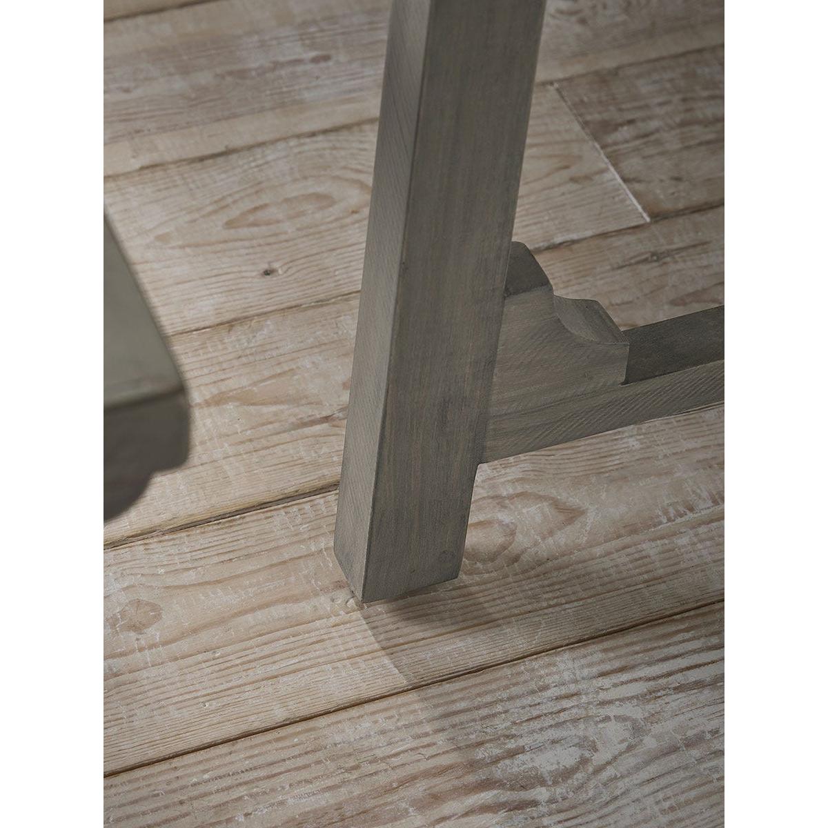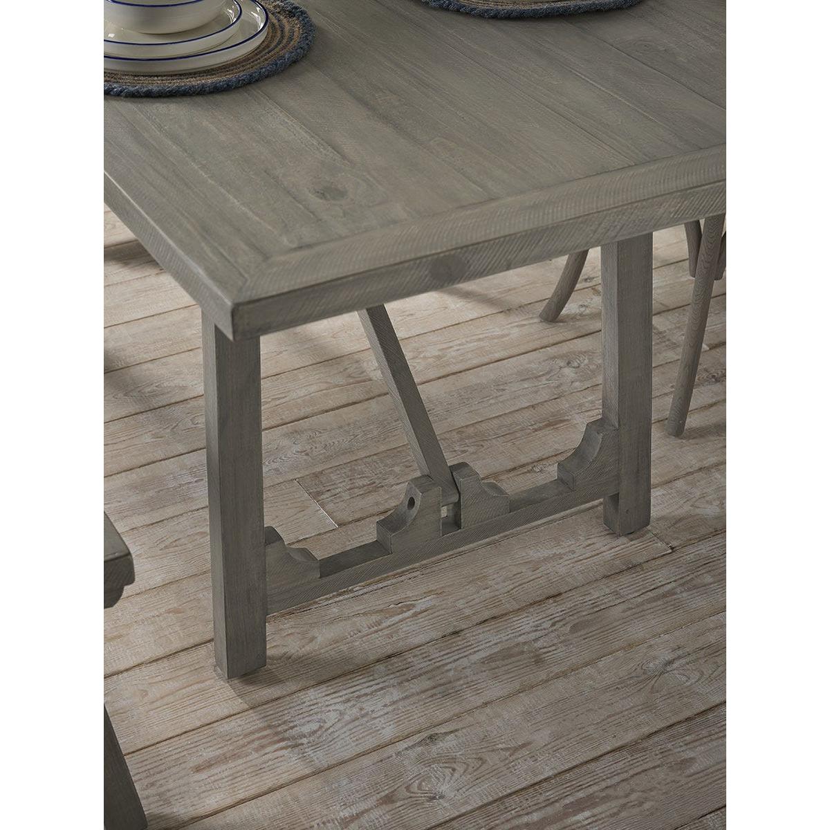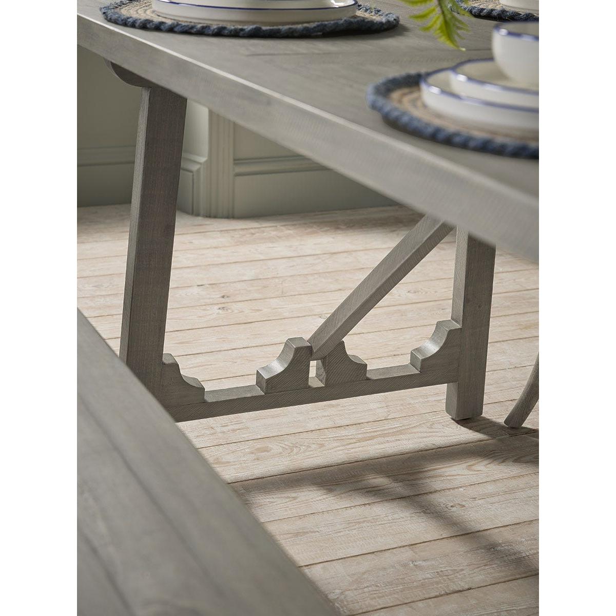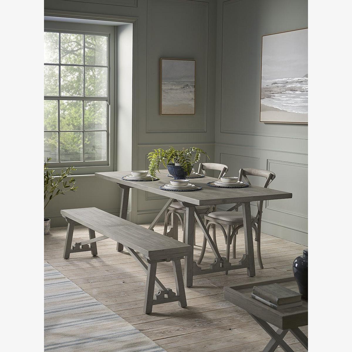Our Renna Dining Table, with its trestle-style design, provides a spacious surface, perfect for family meals. Crafted from new pine, the table has been treated with a soft grey wash, creating a subtle, aged aesthetic that complements relaxed interior designs. Its long, rectangular shape makes it a versatile choice for accommodating bench seating or a selection of dining chairs.