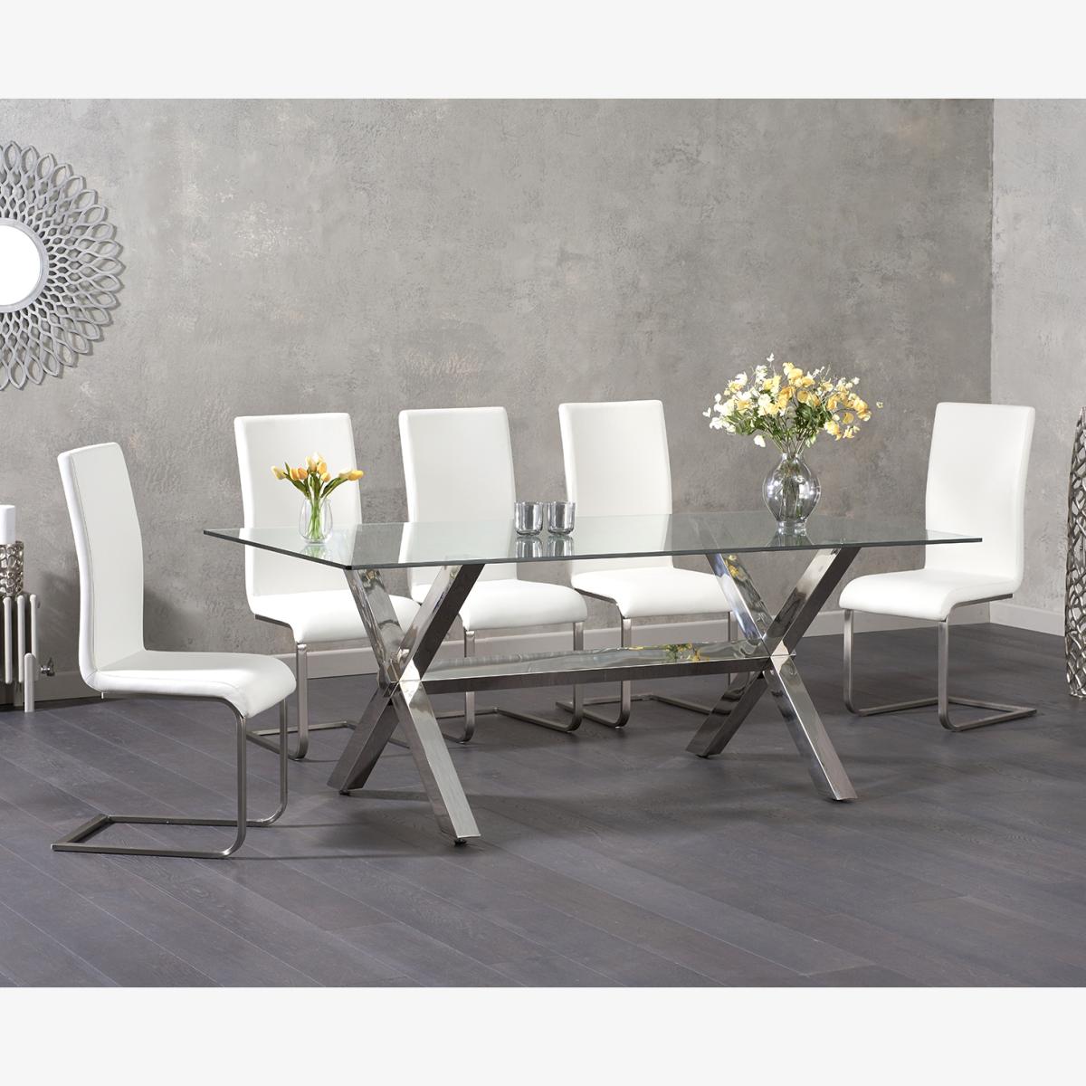 I love the clean, contemporary look of this glass dining table with its sleek metal base, paired with the white Malaga chairs-great for creating a modern and sophisticated dining space. It works particularly well in minimalist, modern, or industrial interiors, but can also add a crisp contrast in more eclectic settings. To style it effectively, consider adding a statement centrepiece on the table or a textured table runner to soften the glass’s sleekness. Additionally, pairing it with coloured or patterned accessories can introduce personality without overpowering its understated elegance. This set is versatile, so do keep the surrounding décor simple to let the table be the focal point.