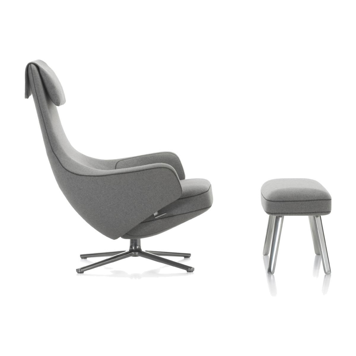 Designed in 2011 by Antonio Citterio, this fabric Repos Armchair and small Panchina Ottoman set, manufactured by Vitra, offers the ultimate comfort. With generous padding, inviting armrests and a high back, the Repos Armchair fulfils almost all demands with respect to comfortable, relaxing seating. Featuring biomechanical adjustment options, the chair adjusts to the sitter's position and weight to offer exceptional support and can be locked in any desired position. Developed in Switzerland by Vitra in collaboration with Italian designer and architect, Antonio Citterio in 2012, the Repos Armchair and Panchina Ottoman combine timeless elegance with unsurpassed comfort. After years of experience creating dynamic seating for workspaces, Citterio now applies his expertise to the private living area to award the space with comfort and visual appeal. Upholstered in premium 'Cosy' Vitra Fabric with a polished aluminium base for a classic and inviting finish, the Repos Chair and Panchina Ottoman are clean-lined designs, subtly striking enough to harmonise with an array of interiors.