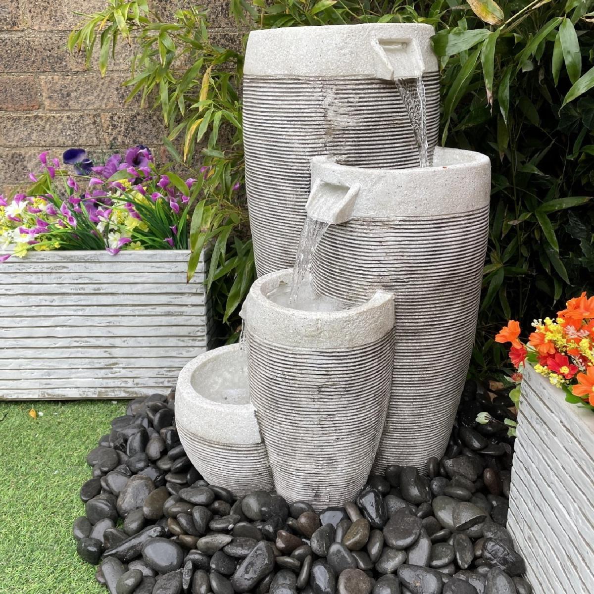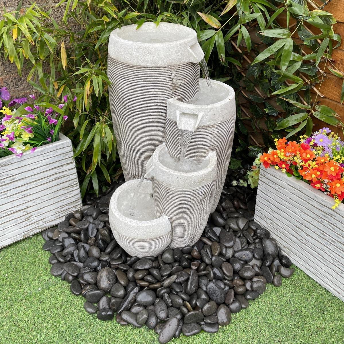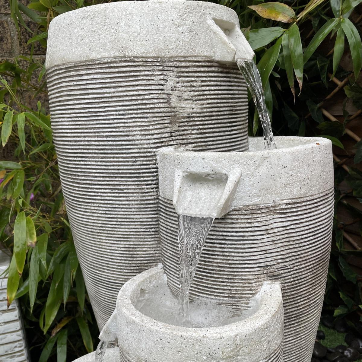 Bring your garden to life day or night and create an ambient focal point with this Grecian inspired water feature. The gentle cascading and soothing sounds of water from vase to vase are so calming. A built-in pump keeps it in constant flow; plus, it's self-contained too, so no water supply or complex wiring is required; put it in place, plug it in, add water and switch it on.