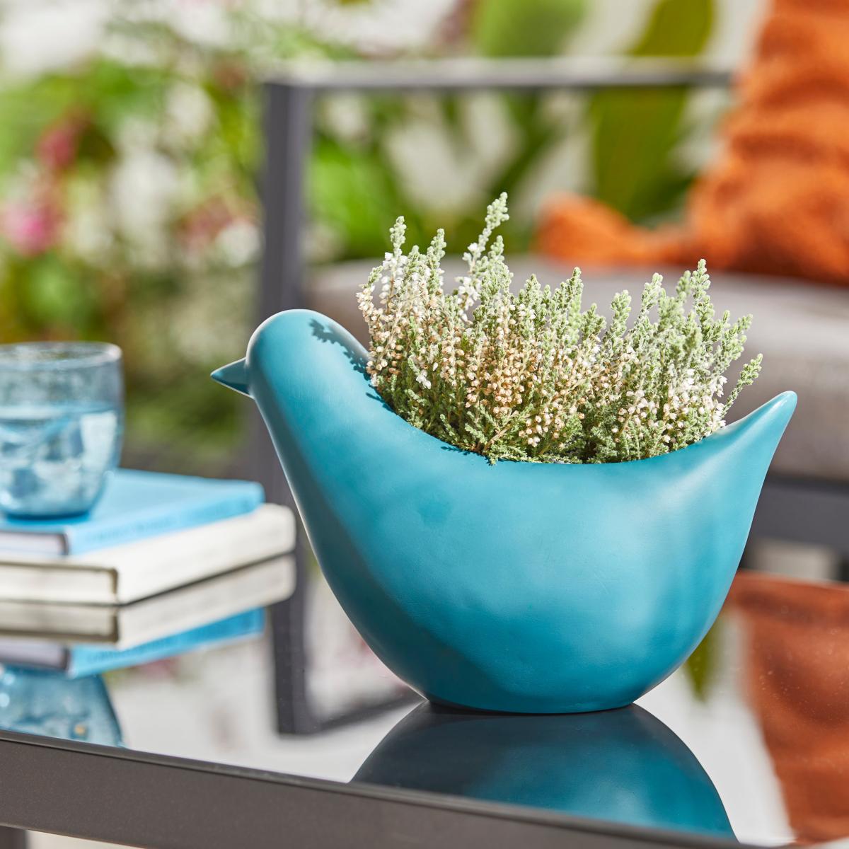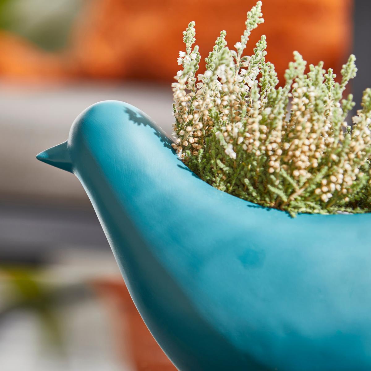 I love the resin bird pot for its playful yet sleek look-its vibrant teal hue adds a touch of colour without overwhelming a space. It works particularly well in contemporary or eclectic interiors, bringing a pop of colour to minimalist settings or complementing more lively, nature-inspired schemes. I recommend styling it on a windowsill or as a centrepiece on a side table, paired with soft greenery or small flowering plants to create contrast. Practical tip: because it's made from resin, it’s durable and lightweight, making it ideal for both indoor and sheltered outdoor use. Just be mindful of the plant’s water needs and avoid overwatering to keep it looking fresh.