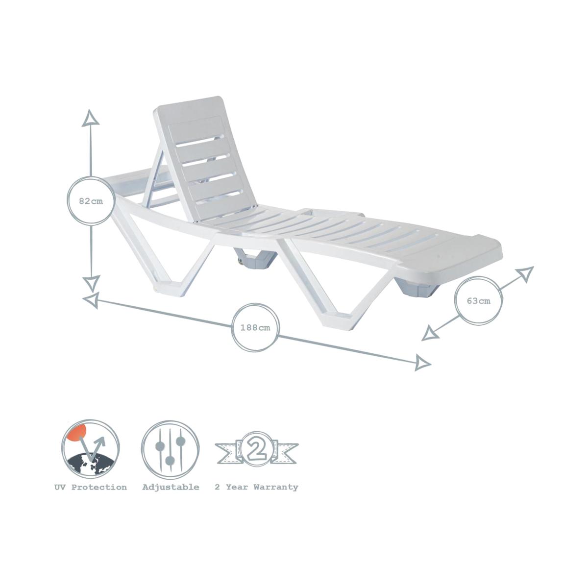 Bring a taste of the Costa Brava to your pool or hotel resort this summer with the Resol Master Plastic Adjustable Sun Lounger. Manufactured in Spain, these loungers are built from rugged, injected polypropylene that has been treated with additional UV Protection, making them perfectly suited to the rigours of the British Summertime. Five reclining positions offer a tremendous amount of flexibility, while the excellent added touch of both an inbuilt security box and a holder for drinking glasses and mobile phones ensures you can lay back and relax in absolute style and comfort. Comes with optional wheels under the back legs for ease of movement transportation, and the fully-stackable design means a great saving on storage space in the off-season. With a variety of colours available, as well as matching accessories, whether you're a holiday home or just at home for the holidays, Resol will ensure you always have a piece of Spanish sunshine with you. Shop the range today.