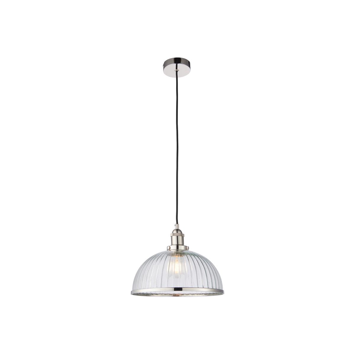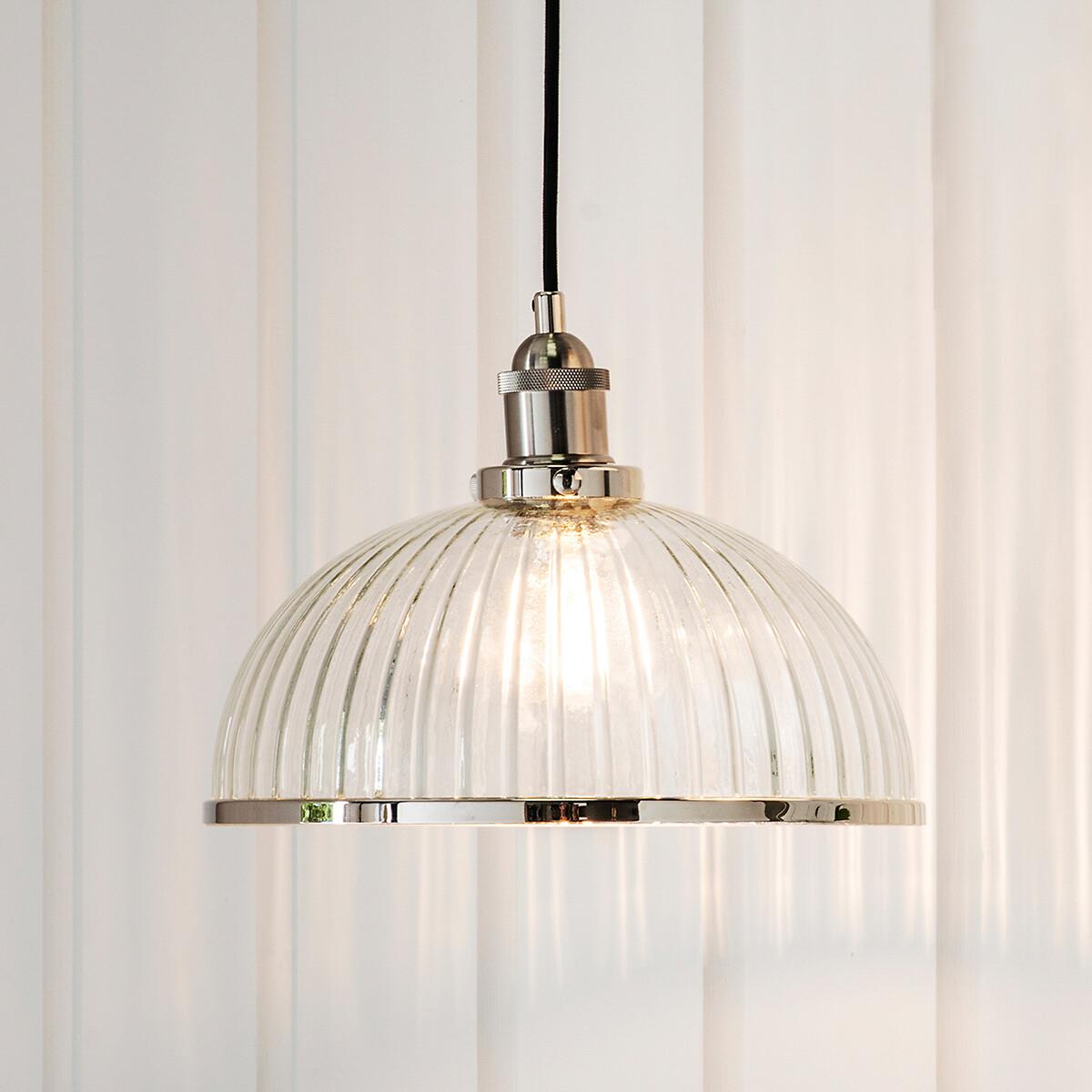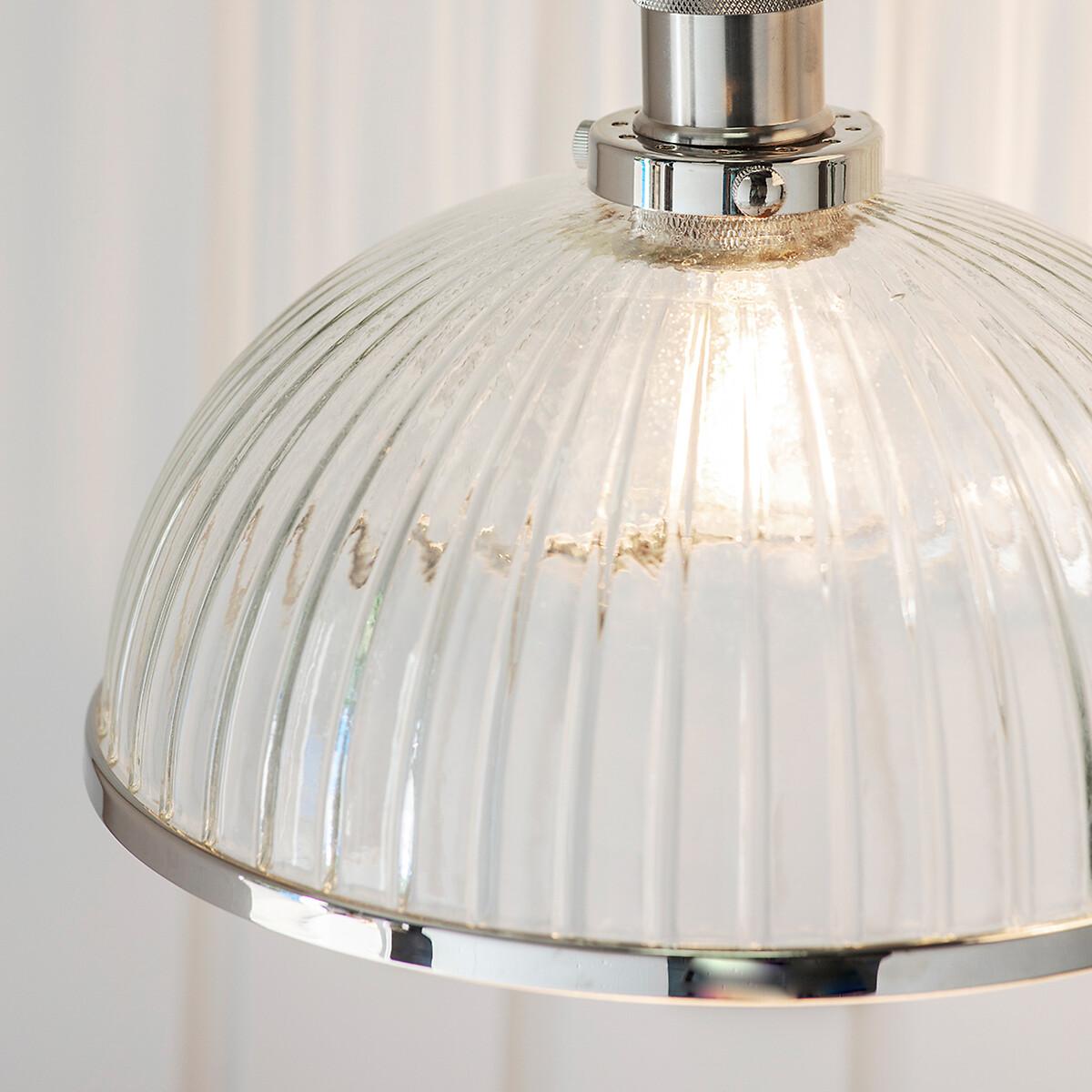 An authentic 'resto' style industrial pendant, finished in bright nickel plating with authentic knurled lamp holder details and vintage style clear ribbed glass shades. Suspended from height adjustable black fabric flex, pair with filament LED lamps for that perfect industrial style. H40 X W30CM.. This product will be dispatched by one of our trusted suppliers. You’ll be contacted by their selected courier about your delivery.