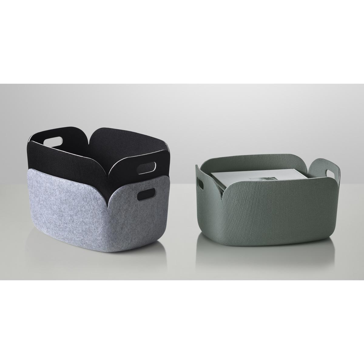 MIKA TOLVANEN ON THE DESIGN: «I wanted the basket to have an non-obtrusive nature. It's a great little basket for storing magazines or any other bits and pieces. Polymer felt combined with a soft form give the basket a friendly appearance. The name Restore is inspired by the fact that the baskets are made of recycled PET bottles. » MATERIAL polymer felt COLOUR light grey, dark grey, green, blue, DIMENSIONS width 35cm, length 48 cm, height 23 cm.