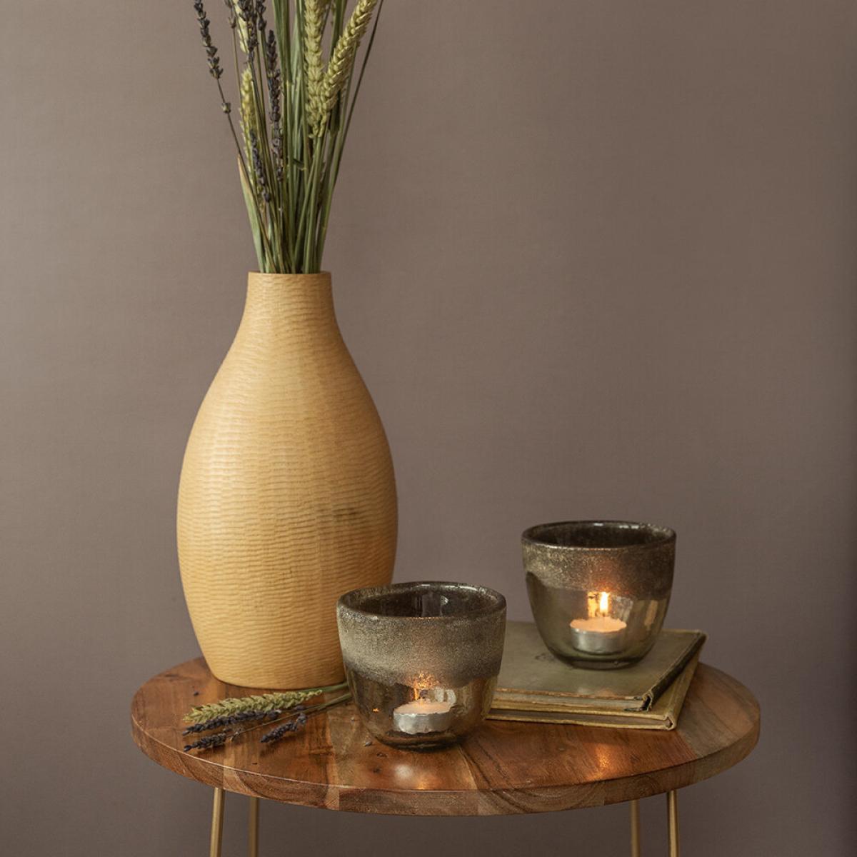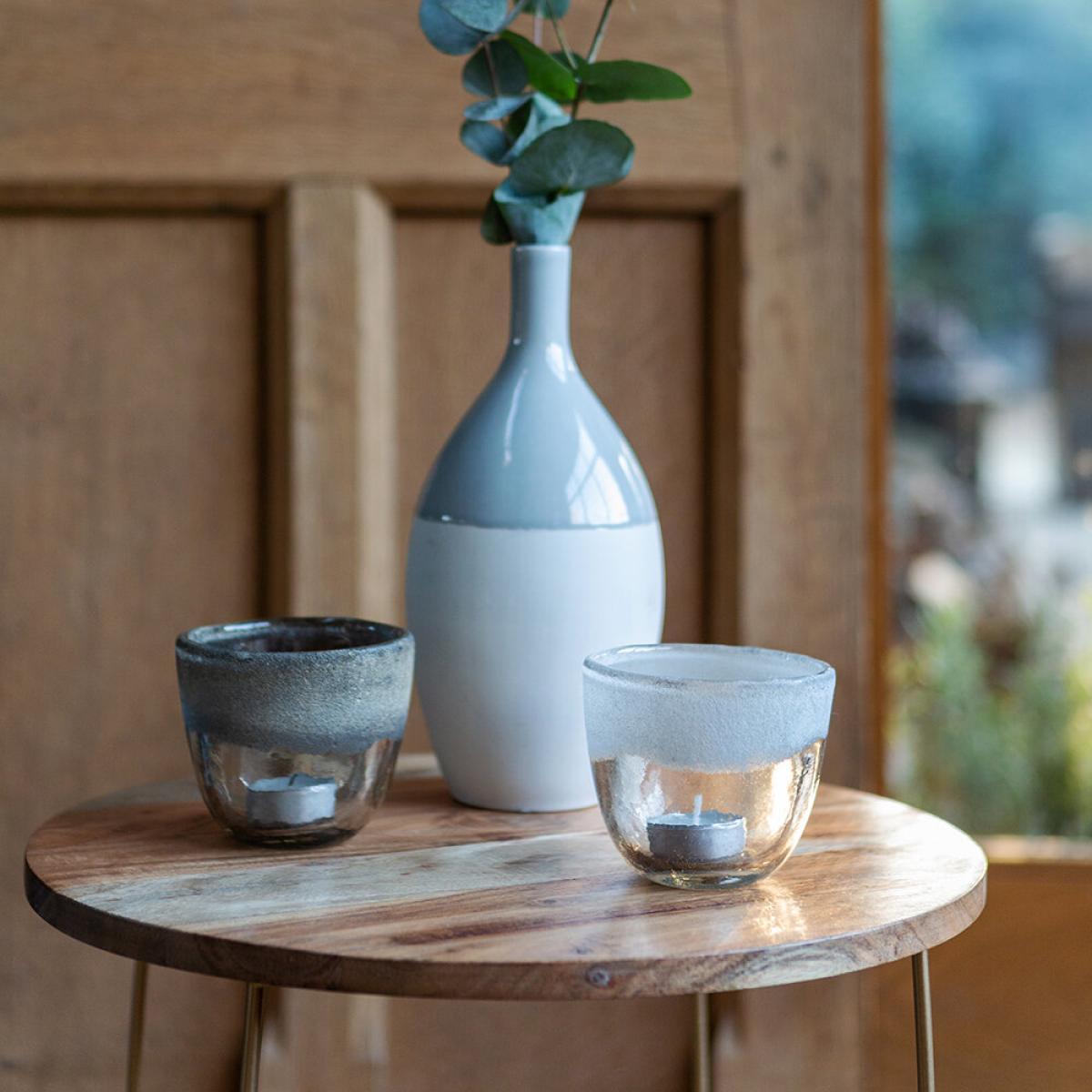 I love these tealight holders because of their subtle ombre effect and buried glass detail, which add a touch of understated elegance without overpowering a space. They work particularly well in modern, rustic, or industrial interiors, where their neutral tones can effortlessly complement natural materials like wood, concrete, or metal. Practical styling tips include grouping them in sets on a side table or mantel for a cosy, inviting glow, or using them outdoors in garden patio setups. Their versatile aesthetic makes them ideal for creating warm ambient lighting in hallways or dining areas, while their compact size keeps the look uncluttered and sophisticated.