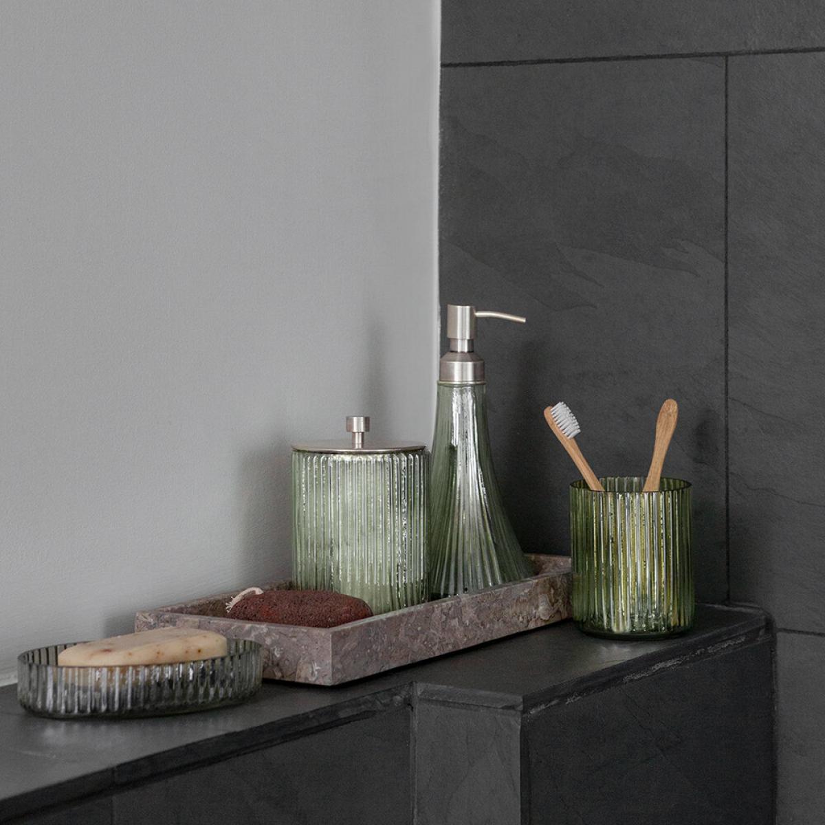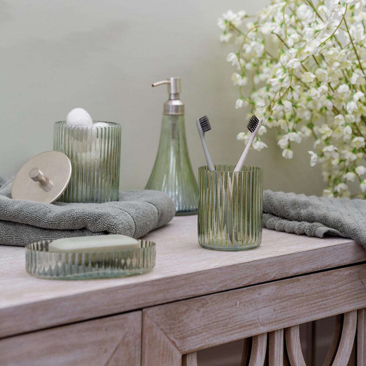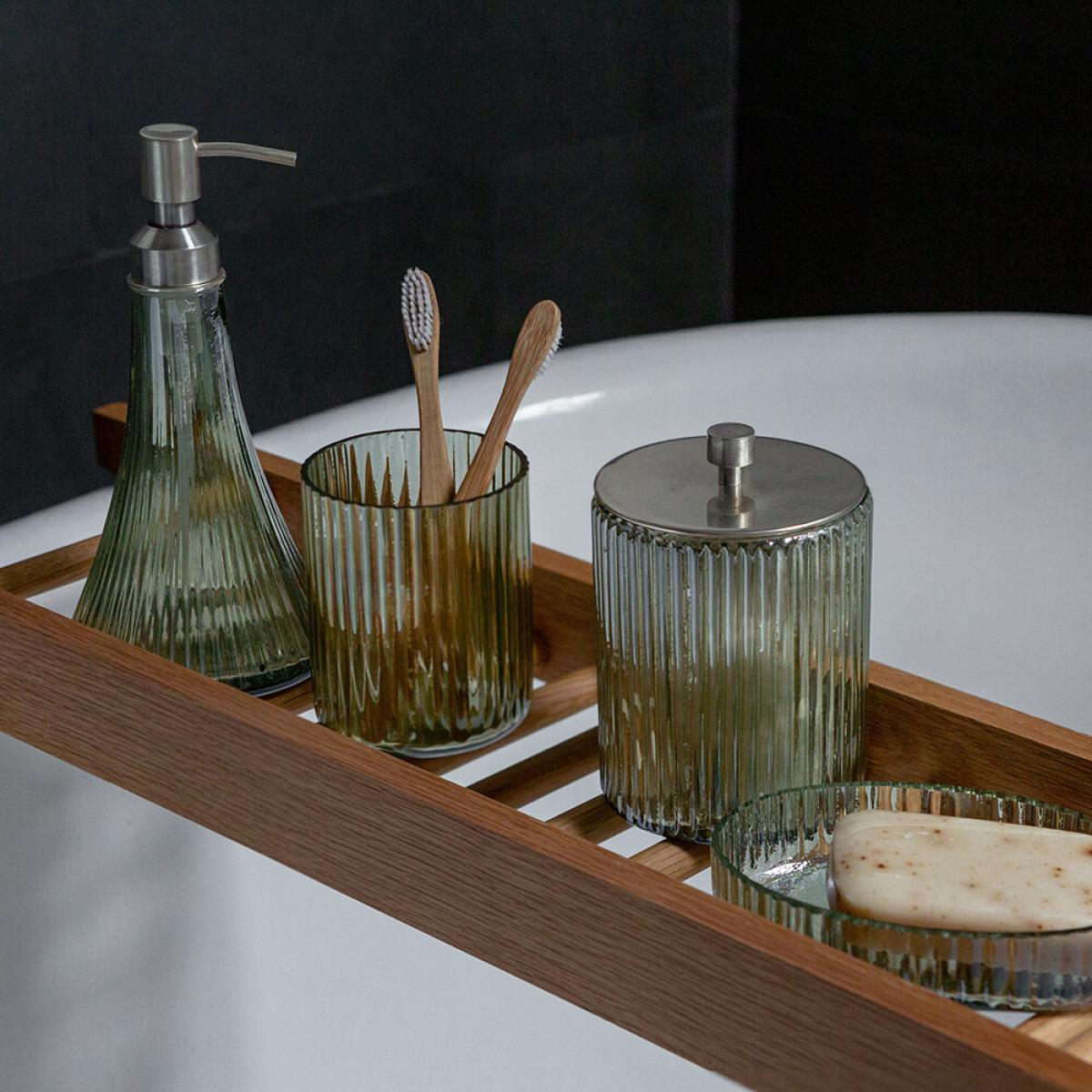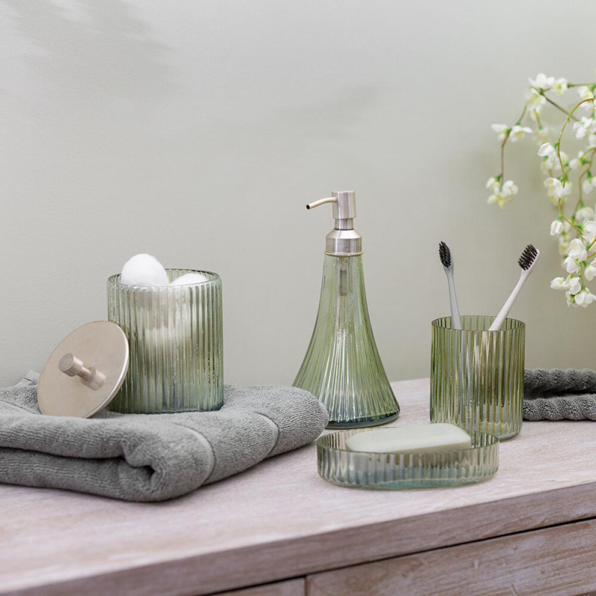 Add timeless elegance to the bathroom with this storage pot from Retreat. Topped with brass, this storage pot is made of glass and decorated with a rustic ridge pattern. Perfect for storing bathroom essentials out of site, there’s more matching items available.