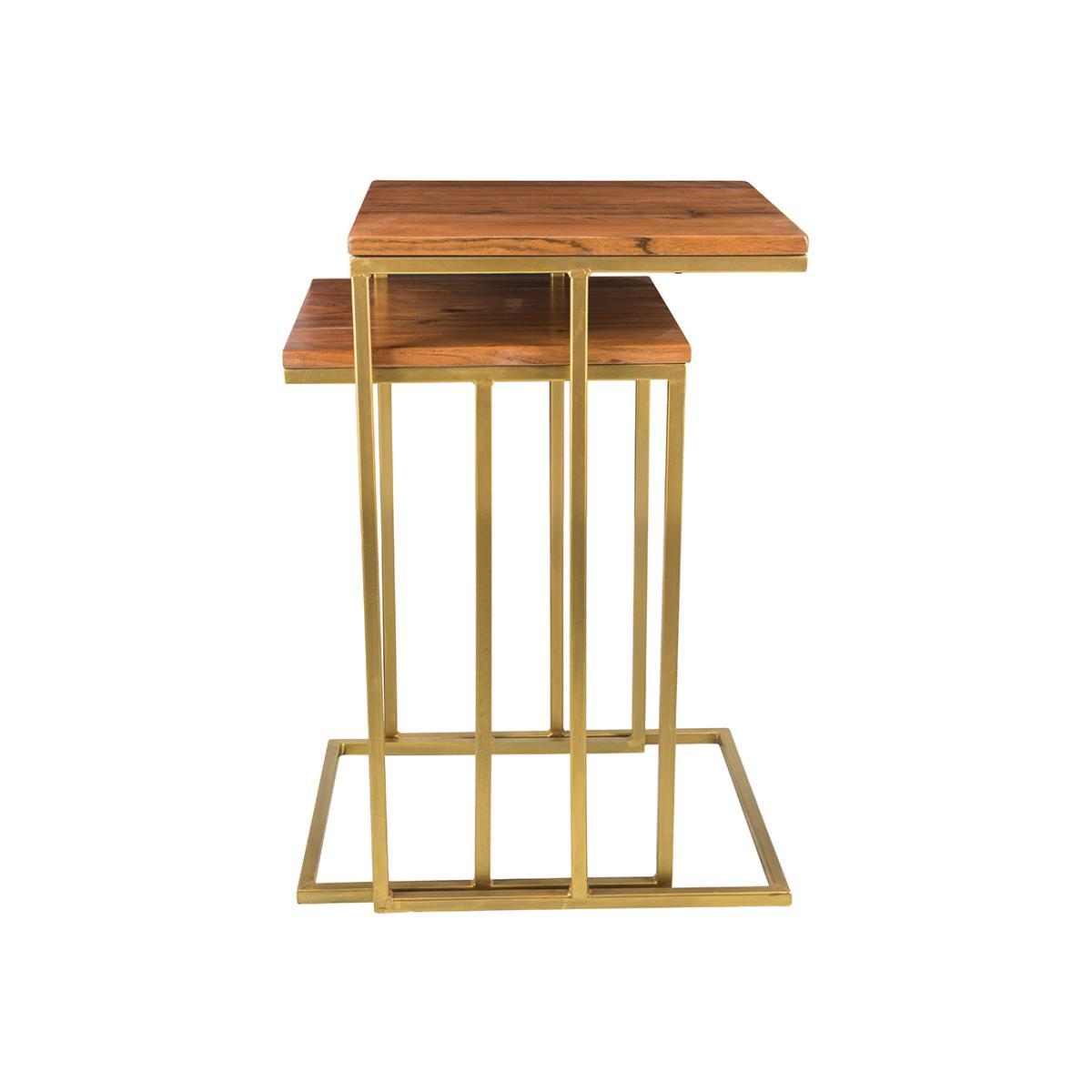 These nesting coffee tables are ideal for modern interiors. A fabulous juxtaposition, they feature natural wood grain table tops that contrast beautifully against gold geometric legs. Simple yet striking.
