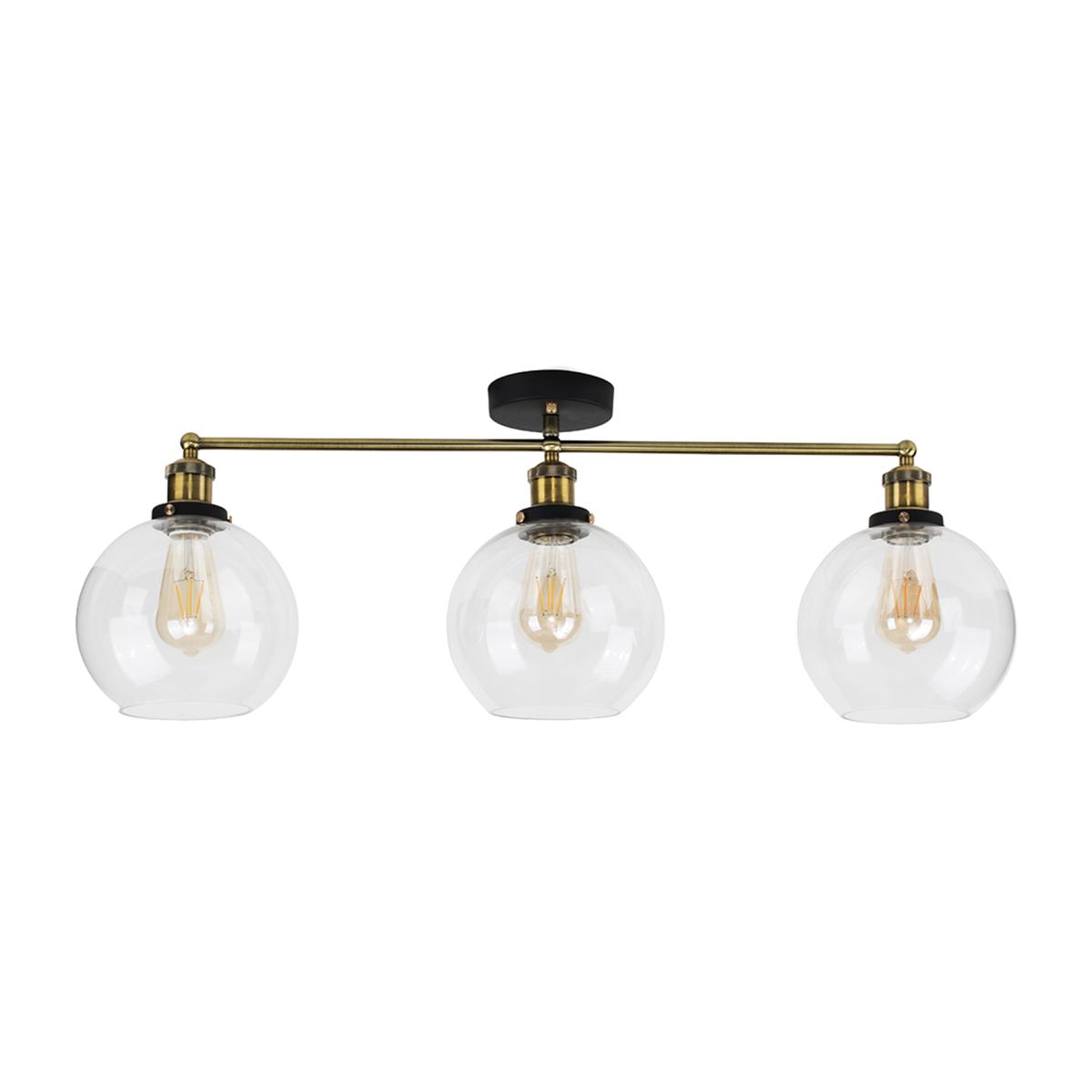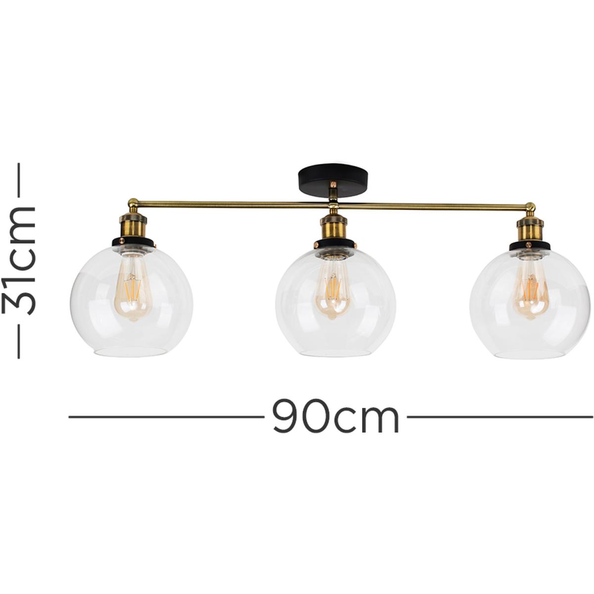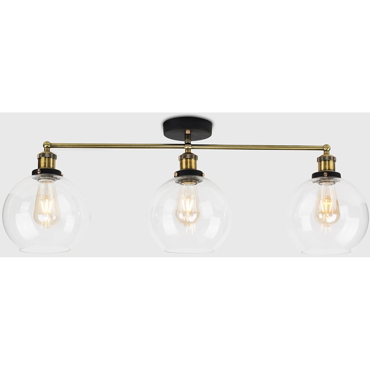 Retro steampunk style 3 way ceiling light fitting in a black and gold effect metal finish. Complete with clear glass globe shades. Ideal for living rooms, bedrooms, dining rooms and hallways. Ceiling lights are usually the main source of illuminating a room but with the many styles on offer today, also become a main focal point or talking point. The right fitting can make a real style statement and complete your living space look.