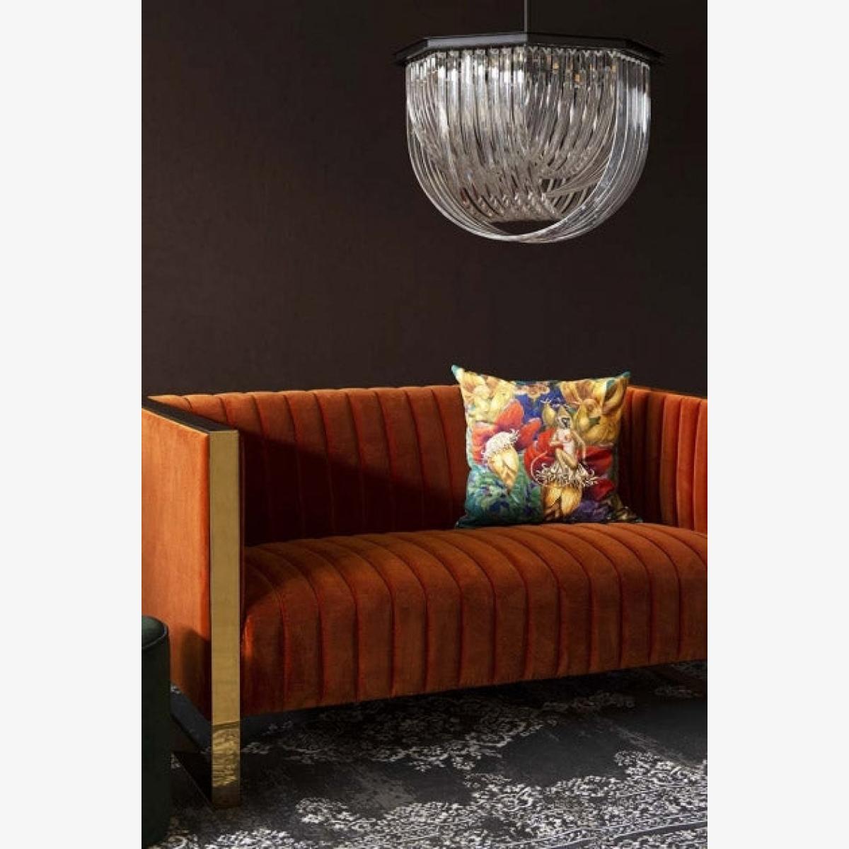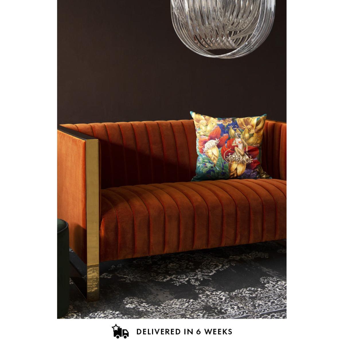 The Retro 50's Style Burnt Orange Sofa With Gold Trim is pure glamour. Sophisticated, opulent and elegant the glamorous burnt orange velvet sofa with gold trim will elevate and upgrade your interiors. The perfect colour pop statement sofa for your living rooms, hallways and bedrooms the Retro 50's Style Burnt Orange Velvet Sofa With Gold Trim will demand the eye acting as an excellent focal point for any room in the home. Upholstered in a luxury burnt orange velvet, the one-of-a-kind Retro 50's Style Burnt Orange Sofa With Gold Trim, features a ribbed back for your seating pleasure and gold trim detailing and legs. A super sexy sofa choice for the home, that you’d expect to see in luxury hotels the Retro 50's Style Burnt Orange Velvet Sofa With Gold Trim is a modern twist on traditional 1950’s style sofas – an inspired and original seating choice that you and your house guests will just love. A timeless sofa, oozing velvet sophistication and elegance - sip cocktails with your lover or loved ones in style!